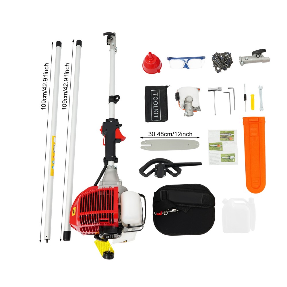 Specification Material: Aluminum Alloy, Manganese Steel, PP Engine Type: Air-cooled, 2-stroke, Single-cylinder Engine Power: 1.25kw Speed: 6500-8500rpm Engine Displacement: 43cc Carburetor Type: Diaphragm Idling Speed: 2800-3200r/min Fuel Tank Capacity: 1L/0.26Gal Chain Fuel Tank Capacity: About 0.26L/0.07Gal Fuel Ratio: 1 Engine Oil: 20-25 Gasoline Starting System: Manual Carrying Type: Side-attached Extension Rod Length: 1.09m/3.58ft Total Length of Product: 2.4m-3.5m/7.87-11.48ft Guide Bar Length: 30.48cm/12inch Chain Length: 30.48cm/12inch Chain Pitch: 3/8" Guide Teeth Thickness: 0.05'' Max. Cutting Diameter: 30cm/11.81inch Engine Size: 26*17*26.5cm/10.24*6.69*10.43inch Packing Size: 110*30.7*29.5cm/43.31*12.09*11.61inch Net Weight: 8.8kg/19.4lbs 42.7cc Pole Saw Pruner Pruning Saw Gas Power Wood Tree Trimmer w/ Extension Description Description Do you still have trouble trimming high branches? The pole chainsaw with a two-stroke engine has strong power, and the hard guide chain and guide plate can quickly cut through tree branches. The long enough pole as well as the strap design allows you to easily trim high branches without having to risk standing on high ground, making your pruning job safer. Key Features Good Durability: It is mainly made of high-quality aluminum alloy, manganese steel, and PP. These materials are not easy to deform and rust, therefore, it has a long service life and you can use it with confidence. Powerful and Efficient: The 1.25kw high-power, 6500-8500rpm high-speed two-stroke engine can provide strong cutting power for it. The sharp manganese steel chain and guide plate enable quick cutting of tree branches. It has a wide cutting range and high work efficiency with a maximum cutting diameter of 11.81 inches. Stable Engine: The excellent air-cooled cooling system and dense cooling holes can dissipate heat and cool down the engine in time. Moreover, the air filter helps to filter impurities in the air and reduce the wear and tear of dust and sand on the engine, which can achieve stable machine operation. Long Endurance Time: Its fuel tank is capable of holding 0.26 gal of fuel, which is a huge capacity. This gives the chainsaw a very long endurance time without frequent refueling. High Safety: It can only be activated by pressing both switches simultaneously, which can prevent accidental touch of the throttle switch. The push-button flameout switch also makes it safer for you to use. Convenient To Use: The detachable long pole makes it easy for you to store and carry. It can reach 7.87-11.48ft in height with the long pole attached, and the comfortable strap design allows you to use it with less effort, so you can easily cut high branches from the ground, which is very practical and convenient. Easy to Install: It has a simple structure and comes with detailed installation and operation instructions, allowing you to quickly install and operate it. Protective Package: To prevent the product from being damaged and bumped during transportation, we packed it with foam to protect your products to the maximum extent possible. Customer Service: Communication is the best way to solve problems. If you have any problems, please feel free to contact us. We will reply and solve the problem for you as soon as possible. Details Adjustable Handle: The ergonomic handle can be adjusted in position and angle at will by loosening the screws, so you can adjust it to a suitable position for use according to your height and arm length, making it more convenient to use. Start Handle: The anti-slip handle is easy to pull, making the machine start more convenient and faster. Quick Connector: The easy-to-use connector allows for quick disassembly and assembly of the connecting rod, making it more convenient to handle. Application It is suitable for sawing high branches and small trees in gardens, farms, parks, forests, pastures, orchards, and so on. Specification Material: Aluminum Alloy, Manganese Steel, PP Engine Type: Air-cooled, 2-stroke, Single-cylinder Engine Power: 1.25kw Speed: 6500-8500rpm Engine Displacement: 43cc Carburetor Type: Diaphragm Idling Speed: 2800-3200r/min Fuel Tank Capacity: 1L/0.26Gal Chain Fuel Tank Capacity: About 0.26L/0.07Gal Fuel Ratio: 1 Engine Oil: 20-25 Gasoline Starting System: Manual Carrying Type: Side-attached Extension Rod Length: 1.09m/3.58ft Total Length of Product: 2.4m-3.5m/7.87-11.48ft Guide Bar Length: 30.48cm/12inch Chain Length: 30.48cm/12inch Chain Pitch: 3/8" Guide Teeth Thickness: 0.05'' Max. Cutting Diameter: 30cm/11.81inch Engine Size: 26*17*26.5cm/10.24*6.69*10.43inch Packing Size: 110*30.7*29.5cm/43.31*12.09*11.61inch Net Weight: 8.8kg/19.4lbs Gross Weight: 10.95kg/24.14lbs Package Included 1x Pole Chainsaw 1x Extension Pole 1x Back Strap 1x Screwdriver 1x Goggles 1x Fuel Mixing Bottle 1x Funnel 1x Auxiliary Handle 2x English Manuals Other Accessories for Assembly Notes 1. Before use, it is necessary to add gasoline and two-stroke engine oil to the fuel mixing bottle and mix them thoroughly. 2. After use, please pour out the fuel in the fuel tank, drain it, or burn the fuel in the carburetor to avoid clogging the carburetor. 3. Please pay attention to safety when using this product. Do not put your hands on the guide plate chain when the machine is running to avoid being hurt. 4. Please read the user manual carefully before use and pay special attention to the safety precautions included. 5. Please allow the slight color difference caused by the shooting light and 1-3cm error due to manual measurement, and make sure you do not mind before ordering. Payment Delivery details Terms of sales About us Contact us Payment We accept ebay payment 。 Fees such as import duties, taxes are not included in the item price or shipping costs. These charges are the buyer's responsibility. Delivery details Shipping: 2-9 working days to: USA Terms of sales We maintain high standards of excellence and strive for hundred percent customer satisfaction. Fee