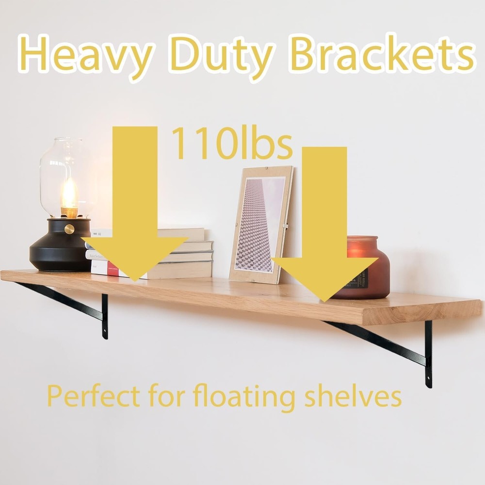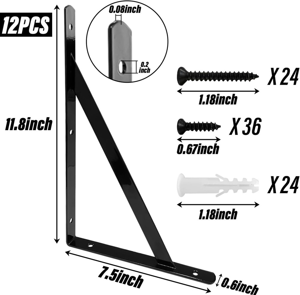 12" X 8" Heavy Duty Shelf Brackets with Screws Metal Shelves Supports Wall Mount Product Description: Package includes 12 x Brackets , 24 x Long Screws and Anchors, 36 x Short Screws. Made of high quality steel with black powder-coating finish, our brackets are durable, water and corrosion resistant. Pre-drilled fixing holes on each side and included screws are convenient for installation. Heavy duty design with max weight capacity per pair is up to 110lb/50kg. Perfect for DIY floating shelving for your home, office, garage and kitchen etc.