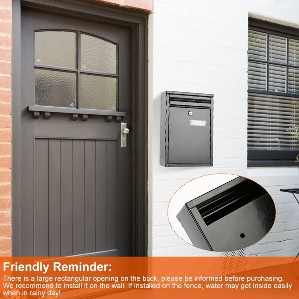 Introductions: Made of durable galvanized iron, scratch-resistant, not easy to rust, can last for a long time use. Size of 12.52x8.54x3.15in, can be used to accept keys, payments, letters, etc.. Widely used in the home, office, commercial mailbox. Lockable with 2 keys provide a safe and secure place for your mail. Easy to install with a bags of screws. Specification: Product Type: Wall Mount Mail Box Color: Black Material: Galvanized Iron Drop Slot Size: 17.5x3cm/6.89x1.18in Access Door Size: 24x19cm/9.45x7.48in Transparent Post Slot Size: 7.4x2.2cm/2.91x0.87in (Fit For Card Size: Below 6.5x1.7cm/2.56x0.67in) Item Size: 31.8x21.7x8cm/12.52x8.54x3.15in Item Weight: 1390g/3.06lbs Package Size: 34*24*10cm/13.38*9.44*3.93in Package Weight: 1496g/3.29lbs Features: Multi-Functional With Spacious Capacity: With size of 12.52x8.54x3.15in, the mail box can be used for various purposes such as outgoing and incoming mail and perfect accept keys, payments, small parcels, letters, and checks, etc.. Widely used in the home, office, commercial mailbox. Durable Structure: Made of durably crafted of heavy-duty galvanized iron, scratch-resistant, not easy to rust, to supply long-lasting strength and use throughout the years. Easy Installation: Come with a bag of screws and equipped with pre-drilled holes on the mailbox, easy fasten and secure onto any wall. Plastic black gasket can effectively prevent the box scratching when mounting the wall. Lockable With 2 Keys: This expertly crafted post box provides a safe and secure place for your mail. A convenient lockable drop front door style mechanism and two keys are included. Considerate Delivery & Post Slot: Delivery slot measures approximately 6.89x1.18in, concealed under an easy-lift tab lid for easy delivery. Also featured a transparent post slot for address information, suitable for post below Package Contents: 1 x Mail Box 2 x Keys 1Bag x Screws 1 x User Manual