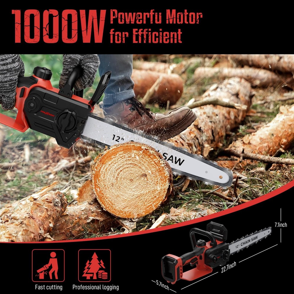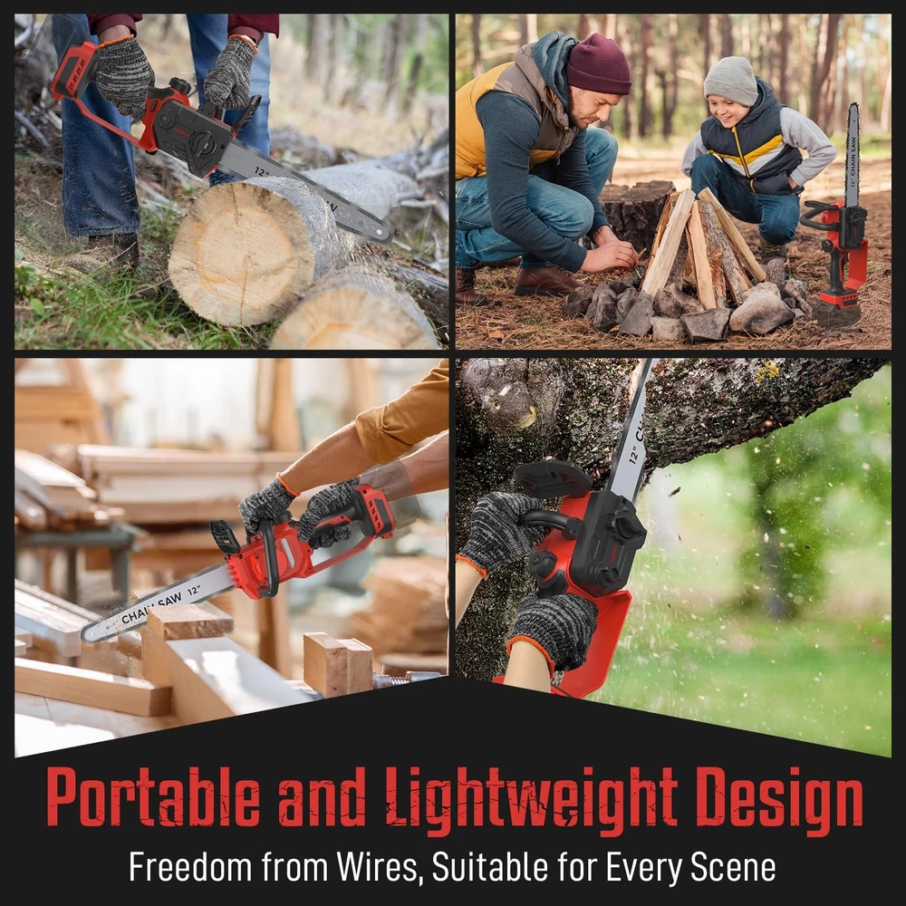 Cordless Chainsaw Important reminders: Battery Not Included, Tool Only. Cordless Chainsaw is perfect for Milwaukee 18V battery compatibility. Compact and Cordless Design:12-inch Cordless Chainsaw is perfect for anyone involved in gardening, farming, or DIY projects. It easily trims branches, clears brush, and cuts through wood, bamboo, or poly pipes, making it a versatile tool for any outdoor task. Assembly takes just 5 minutes and requires no screwdriver. Powerful Brushless Motor for Efficient Cutting:Equipped with a robust 1000W pure copper brushless motor, this chainsaw operates at an impressive speed of 45 ft/s. The 65 Mn steel chain, known for its high strength and wear resistance, ensures clean and smooth cuts, allowing you to cut through 12-inch branches in just 5 to 10 seconds. Versatile Applications:Ideal for garden enthusiasts and DIYers alike, this chainsaw is designed to tackle a variety of tasks, from cutting branches and vines to clearing bushland and processing firewood. It’s perfect for shortening and disassembling lumber with ease. Perfect Gift for All:This 12" brushless motor handheld electric mini chainsaw makes an excellent gift for husbands, dads, moms, friends, or any DIY enthusiast. Its portability and ease of use make it a thoughtful and practical present for any occasion.