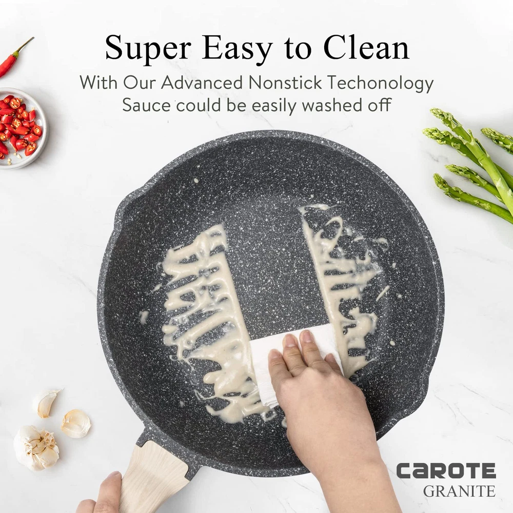 [Superior Nonstick Performance] - Our saute pan, made with natural granite materials, provides superior nonstick performance with 100% PFOA Free and non-properties. Enjoy healthier cooking with less oil intake. Advanced technology ensures a long-lasting and naturally nonstick surface that effortlessly releases food. [Super Easy to Clean] - Featuring 5x nonstick ability and a rivetless interior, our deep frying pan prevents food from sticking. After use, simply rinse it with soapy water for easy and convenient cleaning. [Heat Quickly and Evenly] - The enlarged induction base of our saute pan facilitates quick and even heat distribution. No more waiting, as you'll achieve better cooking results in less time. It is safe for all stoves, including induction. [Perfect Large Size] - Our non-stick saute pan is designed with a deep pan size to meet different cooking needs such as sautéing, poaching, braising, and deep frying. It is especially suitable for large families and can fulfill your everyday cooking requirements. [Ergonomic Design] - Double pouring spout, left - and right-handed pouring can be more convenient and effective. The long-lasting tempered glass lid allows you to monitor the cooking status and helps limit splashes on your stove. The wooden handle provides a comfortable grip and stays cool while cooking. [Service & ] - Each cookware undergoes strict multi-inspection processes. If you receive any defect items caused by delivery, please don't hesitate to reach out to us. We offer a 100% or a new .