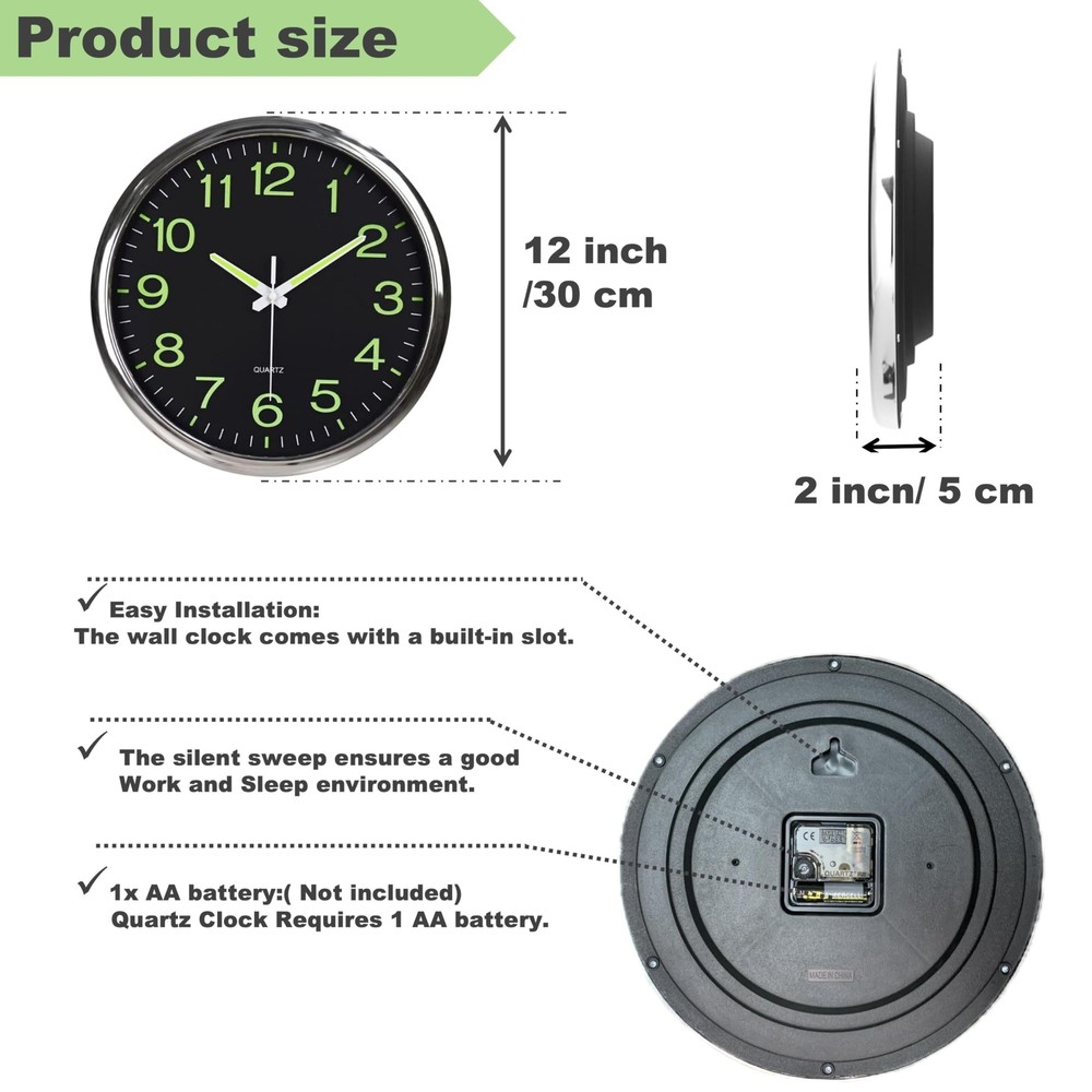 Luminous wall clocks, super quiet and non-ticking with night lights function, large enough for easily to see and read 12 inch diameter round fram, reliable quality Glowing up function, the large stereoscopic numeral have green night light asks for absorbing enough light energy during the day Super Silent clock, precise quartz movements to accurate time, quiet sweep second hand ensure a good sleeping and work environment Easy to Use, Hooks included with the clock , wide slot in back for easy hanging Battery operated and low-power quartz movement requires 1 AA battery - not included (a good battery can be used for more than year, energy saved)