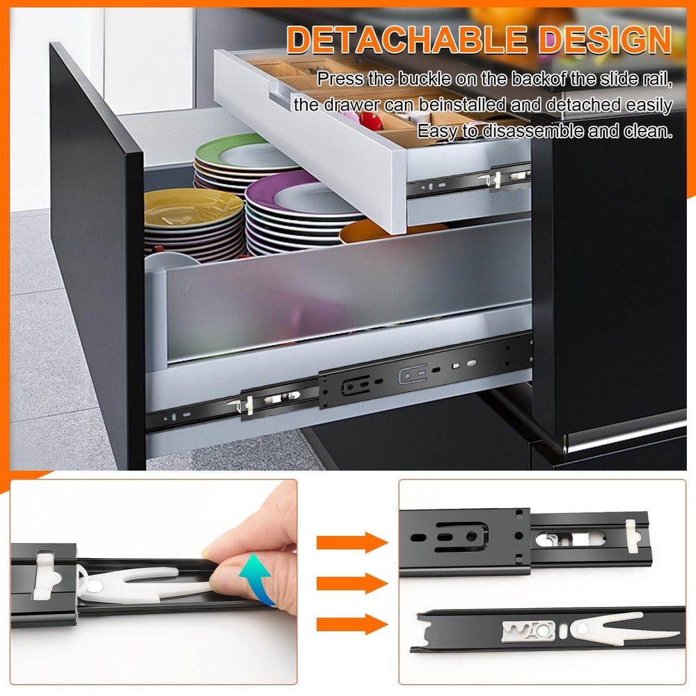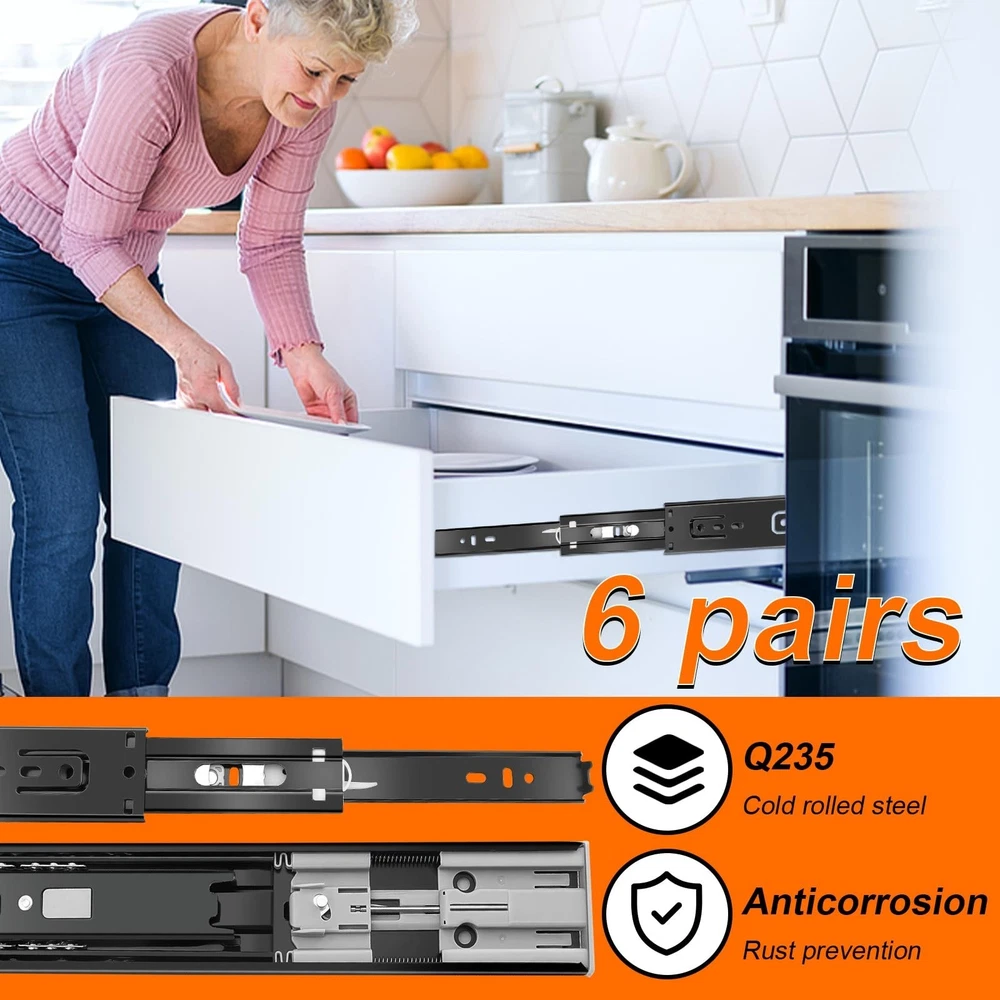 12 inch Drawer Slides 6 Pairs (12pcs) Soft Close 3 fold Full Extension Side Mount Cabinet Drawer Glides 12" Black Cabinet Rails for Dresser, Cabinet, Kitchen 100 LB Capacity Product Details Size: 12inch-300mm Brand: JI2OOYI MPN: 12inch-6-BK UPC: Does not apply EAN: Does not apply Color: Black Material: Alloy Steel Brand: JI2OOYI Product Dimensions: 12"L x 1.77"W x 0.47"Th Finish Type: steel Mounting Type: Side Mount Weight Limit: 100 Pounds Drawer Type: soft close drawer slides Manufacturer: JI2OOYI Number of Items: 12 Part Number: 12inch-6-BK Item Weight: 9.9 pounds Product Dimensions: 12 x 1.77 x 0.47 inches Country of Origin: China Item model number: 12inch-6-BK Size: 12inch-300mm Finish: steel Item Package Quantity: 6 Maximum Weight Capacity: 100 Pounds Included Components: 6 pair of drawer slides,mounting screws Batteries Included?: No Batteries Required?: No Date First Available: October 1, 2022 [6 pairs Soft Close Drawer Slides]:You will get 6 pairs(12pcs) soft self close drawer slides ,12 inch.And each drawer slides match with 12pcs screws.JI2OOYI self close drawer slides designed with ultra smooth soft-close function. Continuous bearings ensure smooth and quiet performance that offer less noise at closing and opening. [Guide for Choosing Size of Drawer Slides]:Side installation.The length of slides can't be longer than the cabinet case depth. Face frame cabinets will require a rear mounting bracket, whereas for faceless cabinets the slides are mounted directly on the side. To determine which size of slides are good for your drawer, please measure the length of the drawer without the frame board. And if the length is not even, please choose 1 inch shorter. [High-Grade Material]:All of the drawer slides which made by JI2OOYI are made from high-grade cold rolled steel that is electrom zinc plated.Rust resistant for your lifetime use.Side mounted Steel ball-bearing action.100 LB capacity. [3-Fold full extension & Detachable]:The 3-fold full extension allows for the entire drawer to be accessed.Three-stage stretching can pull out the drawer completely.Make full use of your drawer space.There is a plastic buckle on the back of the slide rail, by pressing it,the 3rdtrack(the narrowest section) can be separated.Easy to take down and clean.At the same time,double anti-drop function would prevent drawer separate from cabinets. [Application range]: JI2OOYI drawer slides are available in 10inch, 12inch,14inch,16inch,18inch,20inch,22inch.Various choices for drawers in your kitchen,bathroom,bedroom,office with different depth.It also can apply to ,keyboard drawers,wardrobe drawers,wooden or steel drawer,cabinet drawers,toolbox drawers that with demand for big load-bearing capacity.