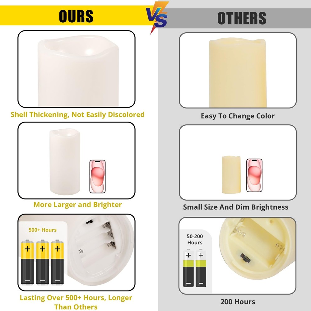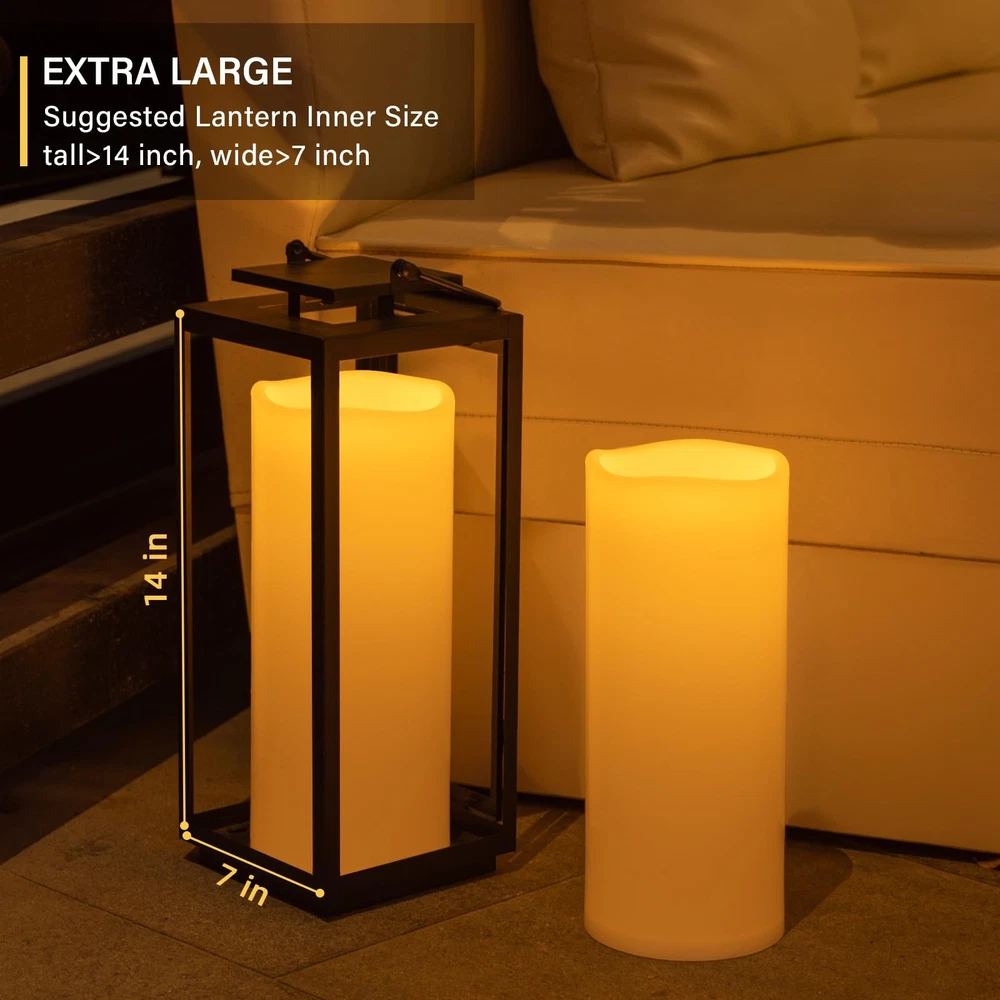 Immerse Yourself in Outdoor Peace with 's Large Waterproof Flameless Candles 's Waterproof Outdoor Flameless Candles are the perfect addition to your home decor. With weatherproof and heat-resistant design, they are ideal for outdoor use as porch mood lights or in lanterns. Our battery-operated candles offer convenience with remote control and timers. Enjoy the ambiance with no flames, no smoke, or no melting Specification: Material: Plastic +PVC Color: Ivory white Light Color: Warm Yellow Light Battery Type: 3 x AA Batteries (NOT INCLUDED) Battery Life: 500+ hours / 45 days (high-grade batteries in 6H timer ) Wide Decoration:Get Ready for Your Events! Our Ivory flameless candles are perfect for parties, festivals, celebrations, and weddings. They emit a warm yellow glow, ideal for indoor and outdoor use. With their large size and bright light, add more ambiance to any occasion Timer Setting: Our perfect lantern candles candles are designed to fit most large decorative vintage lanterns, avaliable in different size candle in height and in diameter. With their bright lights and long-lasting performance of up to 45 days, they're perfect for setting the mood at your family dinner. Feature a smart timer option of 2/4/6/8 hours, cycling every 24 hours, so you can enjoy the lights without the need to manually turn them off Great for Outdoor Use: Our IP65 Waterproof Candles withstand rain and sunlight, ensuring they're perfect for outdoor settings. With no melting or mess, more safe for use and ideal for home decoration, porch lights, table settings, fireplace and more. IP65 WATERPROOF OUTDOOR CANDLES: Made from durable, thicken, waterproof plastic and Eco-Wick, they feature a solid screw-in waterproof base and sealing gasket to hide the main accessories inside the waterproof shell,ensuring long-term use in outdoor settings. Display on your patio table, porch steps or window sill without worrying about hot weather, heavy rain, mist and cold environments.No melt or warp EXTRA LARGE PILLAR CANDLE: Measures 12 inch in height, 5 inch in diameter, bigger than most waterproof candles, tea lights and votive candles. When you light up this led candles ,They look like real candles with flame, Flameless and smoke-free,real and full of beauty.Elevate your outdoor ambiance with our extra-large flameless candle in patio, porch, verandas, pools, and courtyards EASY TO CONTROL WITH REMOTE:Easily turn ON/OFF your timer candles with the switch on the bottom. The Remote Control offers timer options of 2H/4H/6H/8H, saving the trouble of manual operation. Enjoy automatic lighting at the same time every day. Customize light modes (flicker or steady glow) and brightness level to suit your preferences PAIR WITH LANTERNS: Designed to fit most indoor and outdoor lanterns, versatile and convenient, these waterproof outdoor candles are perfect for various settings like home and garden weddings, outdoor parties, and festive decorations. Set the mood effortlessly in your room, porch, or patio. Experience the beauty of candlelight without concern of fire hazards or wax mess, ensuring safety and peace of mind for peaceful outdoor enjoyment LONG-LASTING GLOW WITH WARM LIGHT: Our remote candles adopt LED bulbs that emit a bright warm yellow light, with a flickering glow like real natural candlelight. Each candle requires 3 x AA batteries (not included), and with premium batteries, the battery candles can provide continuous lighting for over 500 hours or up to 45 days with high-grade batteries in a 6-hour timer.180-day after-sales guarantee and 24-hour customer service to assist with any questions or concerns