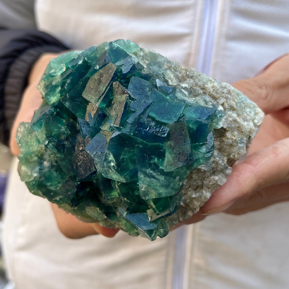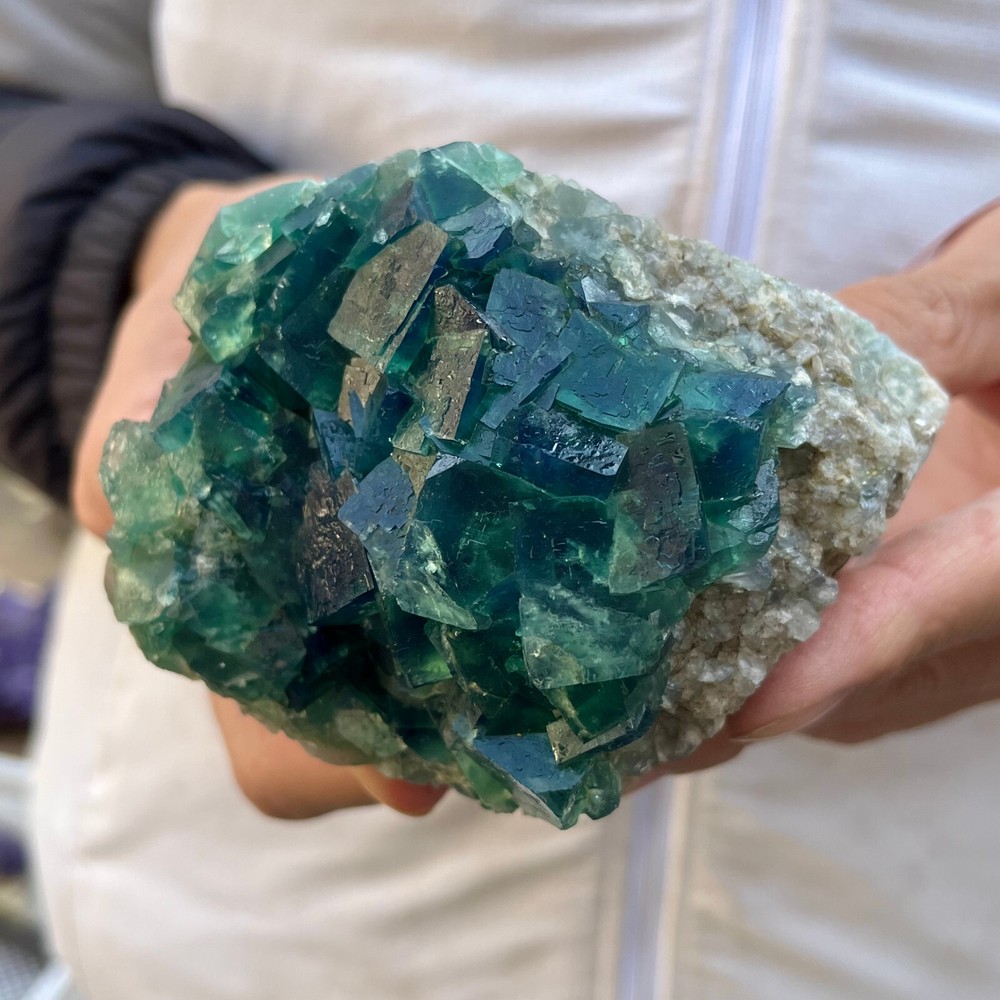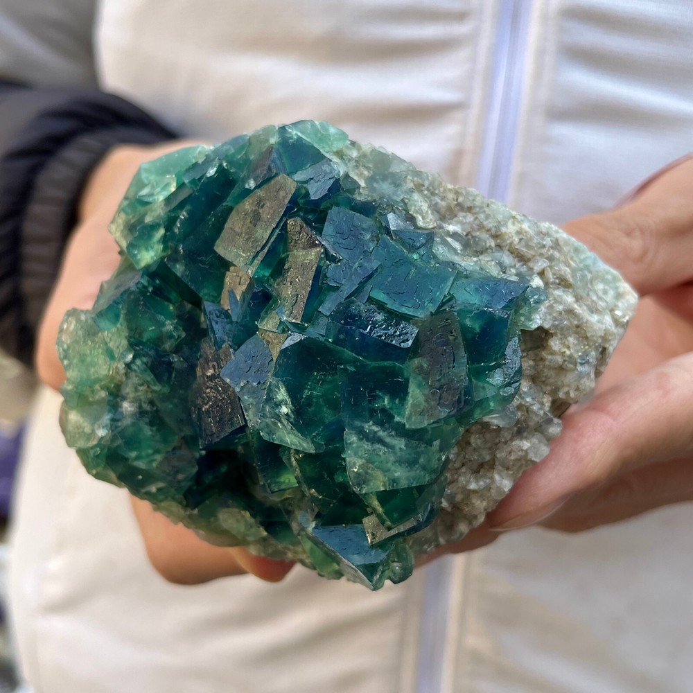 Amazing blue green hues in the fluorite. Item got here super quickly and it was wrapped completely in bubble wrap and tape. It looks exactly like the picture. It’s a solid chonk of a rock with interesting white flecks of crystal on the bottom. A+ transaction!!!