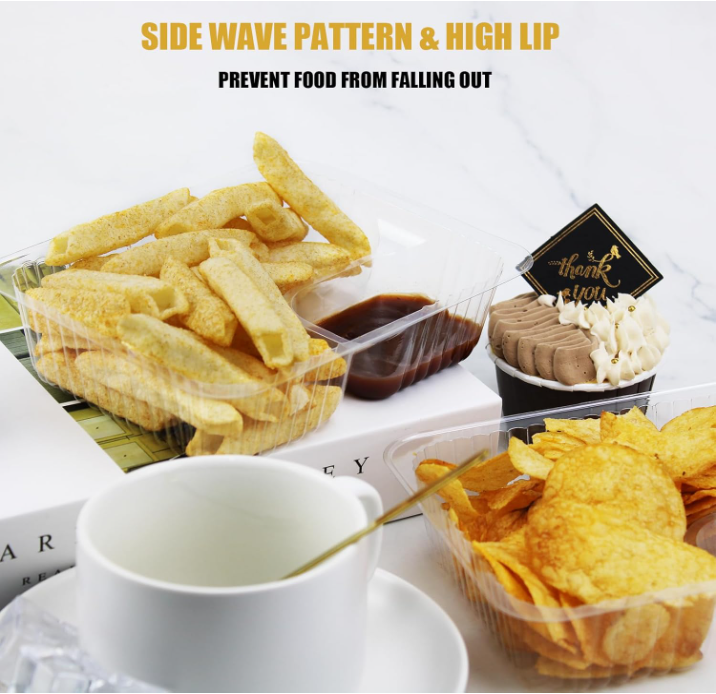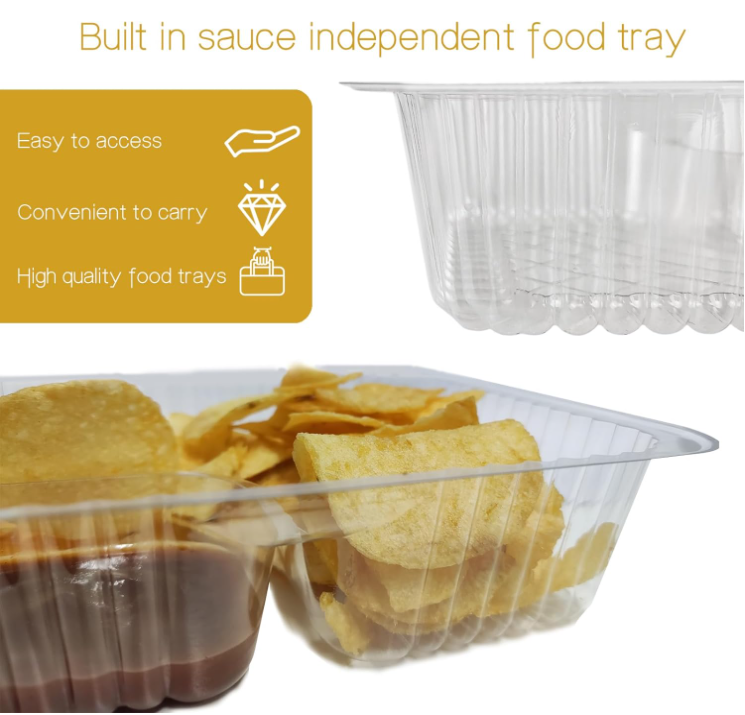 100 PC Nacho Trays Disposable, 12oz Plastic Nacho Containers with Chip and Dip Holder, 6x5 In 2 Compartments Clear Snack Trays for Kids,Parties, Movie Night Supplies (Plastic-100pc) ABOUT THE ITEM: Unique design: Two compartments on each nacho trays separate french fries or cornflakes from dipping or topping to prevent confusion and keep snacks fresh Packaging: You will receive 100 bags of snack trays, each measuring 6x5x1.5 inches, which can hold up to 12 ounces of your favorite cornflakes, potato chips, dipping sauce, etc High quality materials: The corn flake tray we prepared for the party is made of high-quality plastic material, nacho trays disposable has excellent tensile strength and can withstand heavy snack weight without bending or breaking Easy to use and convenient: These movie night supplies save you the hassle of cleaning after parties or events. In addition to being suitable for family gatherings, birthday parties, backyard barbecues, game nights, movie marathons, etc., it is also very suitable for various commercial activities, stores, supermarkets, convenience stores, and other places Timely service: If you have any questions about nacho containers