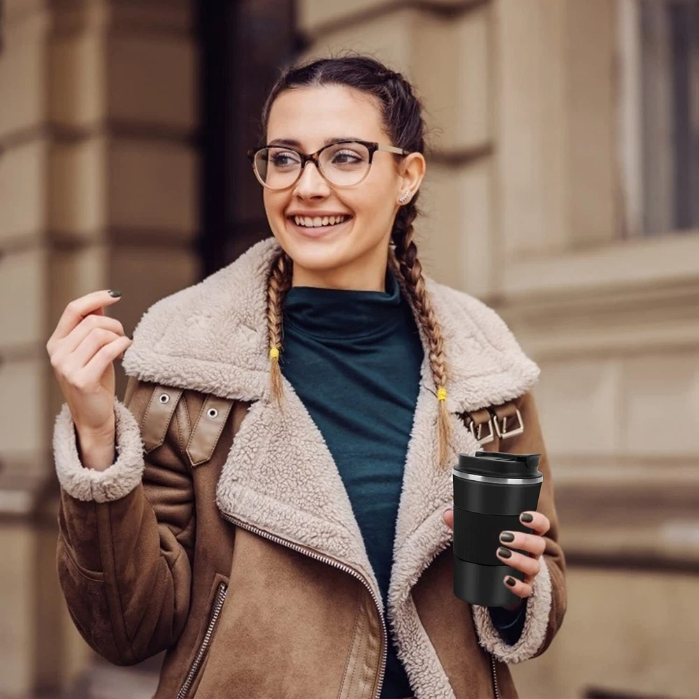 MAINTAIN THE FIRST TASTE OF COFFEE: This travel coffee cup adopts a double-walled structure design, which has a good thermal insulation effect, so that your beverage will not change the temperature quickly, and it has a good thermal insulation effect on cold and hot drinks. A cup of delicious beverage can keep warm 6 hours. SAFE MATERIAL: The double walls of the vacuum flask are made of 304 stainless steel. It adopts a one-piece molding process, seamless interfaces and high-quality BPA-free lids to make the cup more durable. FRIENDLY LID DESIGN: The opening method of the lid is suitable for outdoor use, and can be opened and closed with one hand. Whether you are walking on foot or sitting in a car, the size of the drinking mouth can ensure that you will not be splashed by the drink in an emergency, making your experience more friendly. LEAK-PROOF SEALING RING: The cup lid is designed with a threaded insert and a sealing ring, which has a better leak-proof effect. The beverage will not spill out when the cup is accidentally dropped. It will not cause beverage leakage when placed in a car cup holder or on foot. COMFORTABLE: The outer layer of the cup is designed with frosted technology and silicone insulating layer, which is wear-resistant and anti-drop, and has a comfortable grip. The soft and comfortable silicone layer is combined with the frosted technology, plus the design of the cone-shaped cup body, you only need to gently hold it in your hand You can hold the cup firmly.