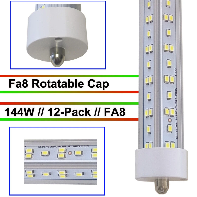 FAST DELIVERY - Ship from New Jersey or Los Angeles Warehouse via FedEx , 3-7 Days Delivered Your Door . SCIENTIFIC DESIGN - 8Ft LED Shop Lights Fixture is Made of 6500K Cold White SMD2835 LED Chip ,Plastic Clear Cover , Aluminum Bracket Housing ,and AC85-277V Constant Current Driver . It can work in -68F to 120F Temperature Conditions EASY INSTALLATION - The Integrated Tube Fixture Can be Install on Wall or Ceiling ,Easily Replace Traditional Fluorescent Tube Bulb . Plug and Play , Free Accessories (Power Cords, Connector , Extension Cords , Clip and Screw ) Come with Tube Lights Together WIDE APPLICATION - Linkable 8Ft Bulbs Widely Used in Garage Ceiling , Barbershop , Schools, Hospitals Basement , Factory Warehouses , Supermarkets Cooler Door , Offices, Shops,Hotels, etc 12PACK Single Pin LED Tube Lights 8FT FA8 T8 LED Shop Light Bulb Warehouse Light 【No RF & FM Interference】LED Driver have passed Electromagnetic Magnetic Compatibility EMC tests,No cause EMI ,No longer subject to any RF & FM jamming. Never interfering with the signal of your garage roller shutter door,No make noise when you listen radio 【Easy to Install】Just simply bypass the ballast and connection AC85-277V AC power . Not compatible with single-ended powered sockets 【Wide Application】 - 8Ft 144W V Shaped FA8 HO LED Bulb fitted to replace traditional F96T12 T8 T10 T12 fluorescent bulbs. Widely used in Garage,supermarkets, offices , convenience stores , gas stations , warehouse,parking lot,shops, hotels,Refrigerator,coolers or freezers illumination,etc 【High Output】8Ft 144W 18000LM FA8 【Rotate Cap & Swivel End】 Easy Adjust rotated Lighting Direction within 180 degree after Installation