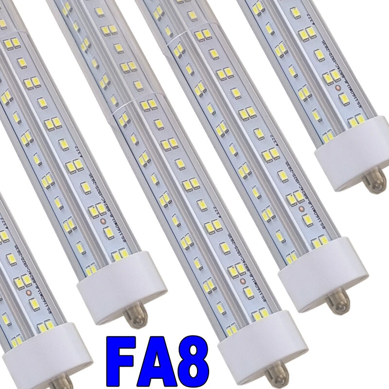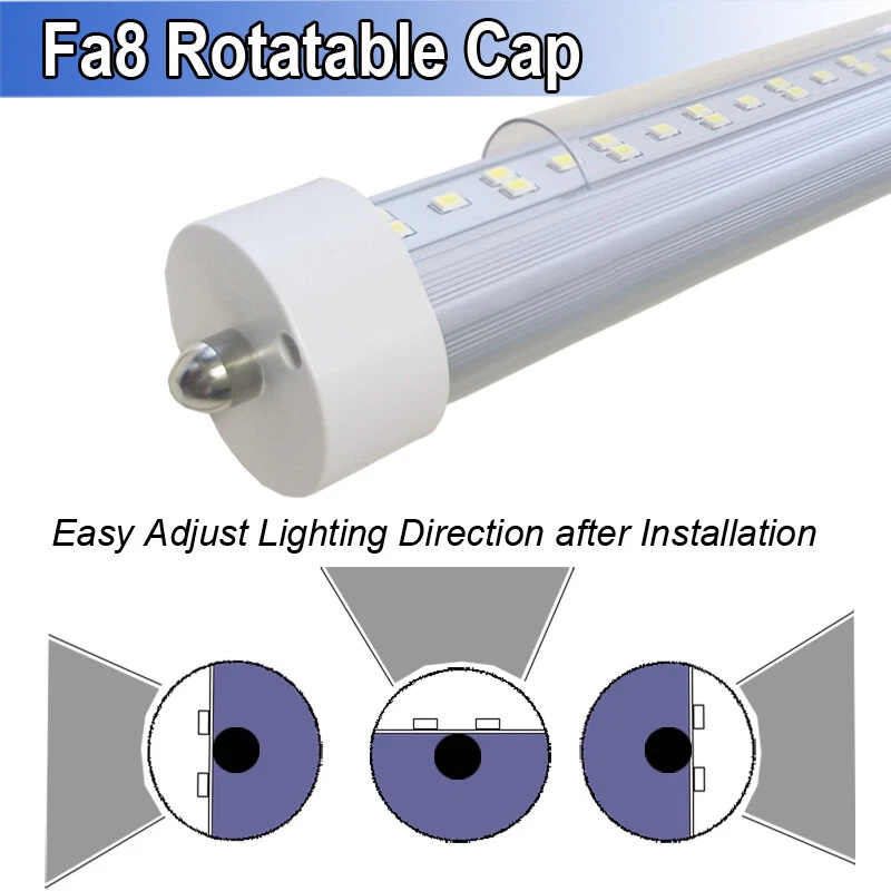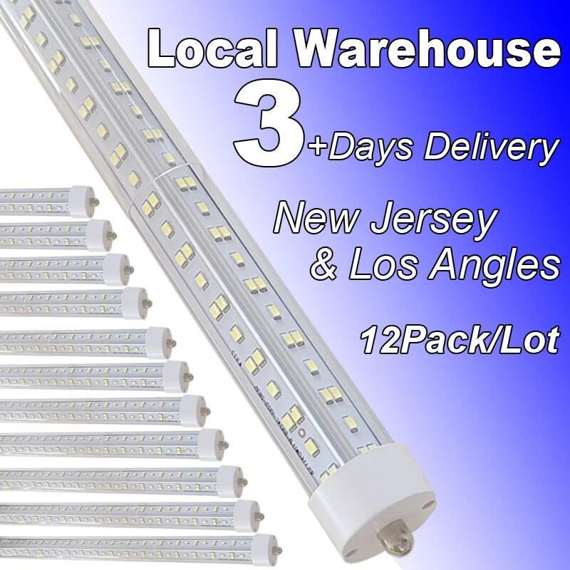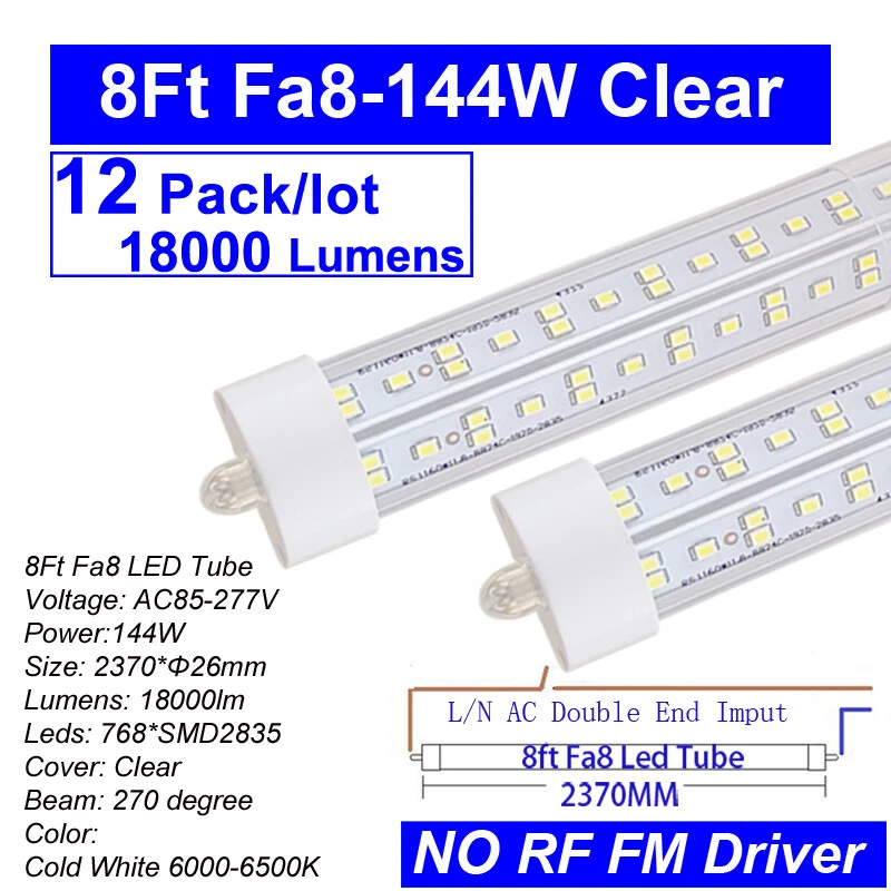 FAST DELIVERY - Ship from New Jersey or Los Angeles Warehouse via FedEx , 3-7 Days Delivered Your Door . SCIENTIFIC DESIGN - 8Ft LED Shop Lights Fixture is Made of 6500K Cold White SMD2835 LED Chip ,Plastic Clear Cover , Aluminum Bracket Housing ,and AC85-277V Constant Current Driver . It can work in -68F to 120F Temperature Conditions EASY INSTALLATION - The Integrated Tube Fixture Can be Install on Wall or Ceiling ,Easily Replace Traditional Fluorescent Tube Bulb . Plug and Play , Free Accessories (Power Cords, Connector , Extension Cords , Clip and Screw ) Come with Tube Lights Together WIDE APPLICATION - Linkable 8Ft Bulbs Widely Used in Garage Ceiling , Barbershop , Schools, Hospitals Basement , Factory Warehouses , Supermarkets Cooler Door , Offices, Shops,Hotels, etc 12PACK T8 8FT LED Shop Light Bulbs 144W Single Pin FA8 8FOOT LED Shop Lights 【No RF & FM Interference】LED Driver have passed Electromagnetic Magnetic Compatibility EMC tests,No cause EMI ,No longer subject to any RF & FM jamming. Never interfering with the signal of your garage roller shutter door,No make noise when you listen radio 【Easy to Install】Just simply bypass the ballast and connection AC85-277V AC power . Not compatible with single-ended powered sockets 【Wide Application】 - 8Ft 144W V Shaped FA8 HO LED Bulb fitted to replace traditional F96T12 T8 T10 T12 fluorescent bulbs. Widely used in Garage,supermarkets, offices , convenience stores , gas stations , warehouse,parking lot,shops, hotels,Refrigerator,coolers or freezers illumination,etc 【High Output】8Ft 144W 18000LM FA8 【Rotate Cap & Swivel End】 Easy Adjust rotated Lighting Direction within 180 degree after Installation