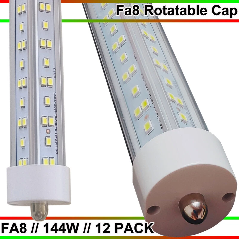 FAST DELIVERY - Ship from New Jersey or Los Angeles Warehouse via FedEx , 3-7 Days Delivered Your Door . SCIENTIFIC DESIGN - 8Ft LED Shop Lights Fixture is Made of 6500K Cold White SMD2835 LED Chip ,Plastic Clear Cover , Aluminum Bracket Housing ,and AC85-277V Constant Current Driver . It can work in -68F to 120F Temperature Conditions EASY INSTALLATION - The Integrated Tube Fixture Can be Install on Wall or Ceiling ,Easily Replace Traditional Fluorescent Tube Bulb . Plug and Play , Free Accessories (Power Cords, Connector , Extension Cords , Clip and Screw ) Come with Tube Lights Together WIDE APPLICATION - Linkable 8Ft Bulbs Widely Used in Garage Ceiling , Barbershop , Schools, Hospitals Basement , Factory Warehouses , Supermarkets Cooler Door , Offices, Shops,Hotels, etc 12PC T8 8FT LED Shop Light Bulbs FA8 Single Pin 144W 8FOOT LED Tube Lights US 【No RF & FM Interference】LED Driver have passed Electromagnetic Magnetic Compatibility EMC tests,No cause EMI ,No longer subject to any RF & FM jamming. Never interfering with the signal of your garage roller shutter door,No make noise when you listen radio 【Easy to Install】Just simply bypass the ballast and connection AC85-277V AC power . Not compatible with single-ended powered sockets 【Wide Application】 - 8Ft 144W V Shaped FA8 HO LED Bulb fitted to replace traditional F96T12 T8 T10 T12 fluorescent bulbs. Widely used in Garage,supermarkets, offices , convenience stores , gas stations , warehouse,parking lot,shops, hotels,Refrigerator,coolers or freezers illumination,etc 【High Output】8Ft 144W 18000LM FA8 【Rotate Cap & Swivel End】 Easy Adjust rotated Lighting Direction within 180 degree after Installation