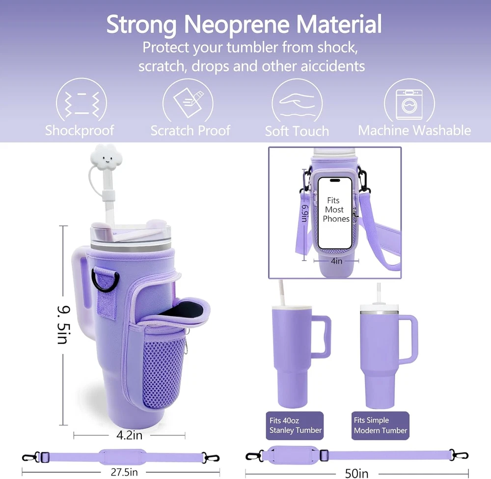 【Upgrade Cup Sleeve】New mesh pocket designs that provide plenty of room for all your personal belongings such as cellphones,cash,cards,keys,etc. And comes with removable and adjustable strap to suit all body types. ——One Set for all you need. Take your cup everywhere and free your hands. 【Cute Straws Covers】Made from food-grade silicone; Reusable & dishwasher safe. Fit straws with an outer diameter of 0.4in. A Cute decoration to remind you to drink more water. 【Drinking Straw & Cleaning Brush】The straw measures 12.5 x 0.4 in. And the brush is long enough to clean the straw easily. 【Protective Silicone Boot】 2.95x1.8in. Premium protector to fit bottles or tumblers with 2.8-2.95 in base. No need to worry about the bottom of the cup getting scratched; dented or making noise. Keep your cup in perfect condition. 【Anti Leak Stoppers】Available for Stanley H2.0 only. Perfect complement to your water bottle. They seal the cup and holds the straw in place. They are spill proof; stop gas loss and keep cold or hot drink longer. 【Wide Application and Perfect Gift】 This beautiful water bottle cover for stanley 40 oz tumbler is perfect for walking, biking, camping, hiking, back to school, commuting, or even if you're at the beach, gym, or sporting events. The tumbler pouch's versatile design makes it suitable for various sports and outdoor activities. And the water bottle holder with strap is a perfect gift for Stanley fans and a good gift for Halloween, Thanksgiving Day, Christmas Day, New Year's Day, Valentine's Day, Mother's Day and Father's Day. Product Description JMY 12 Packs Stanley Cup Accessories Add to Cart Add to Cart Add to Cart Add to Cart Add to Cart Customer Reviews 4.6 out of 5 stars 80 4.6 out of 5 stars 80 4.6 out of 5 stars 80 4.6 out of 5 stars 80 4.6 out of 5 stars 80 4.6 out of 5 stars 80 Price $19.99 $ 19 . 99 $9.99 $ 9 . 99 $19.99 $ 19 . 99 $19.99 $ 19 . 99 — $19.99 $ 19 . 99 Dishwasher Safe ✔ ✔ ✔ ✔ ✔ ✔ Reusable ✔ ✔ ✔ ✔ ✔ ✔ Food-grade Material ✔ ✔ ✔ ✔ ✔ ✔ Scratch Proof ✔ ✔ ✔ ✔ ✔ ✔ Size 30/40OZ 30/40OZ 30/40OZ 30/40OZ 30/40OZ 30/40OZ