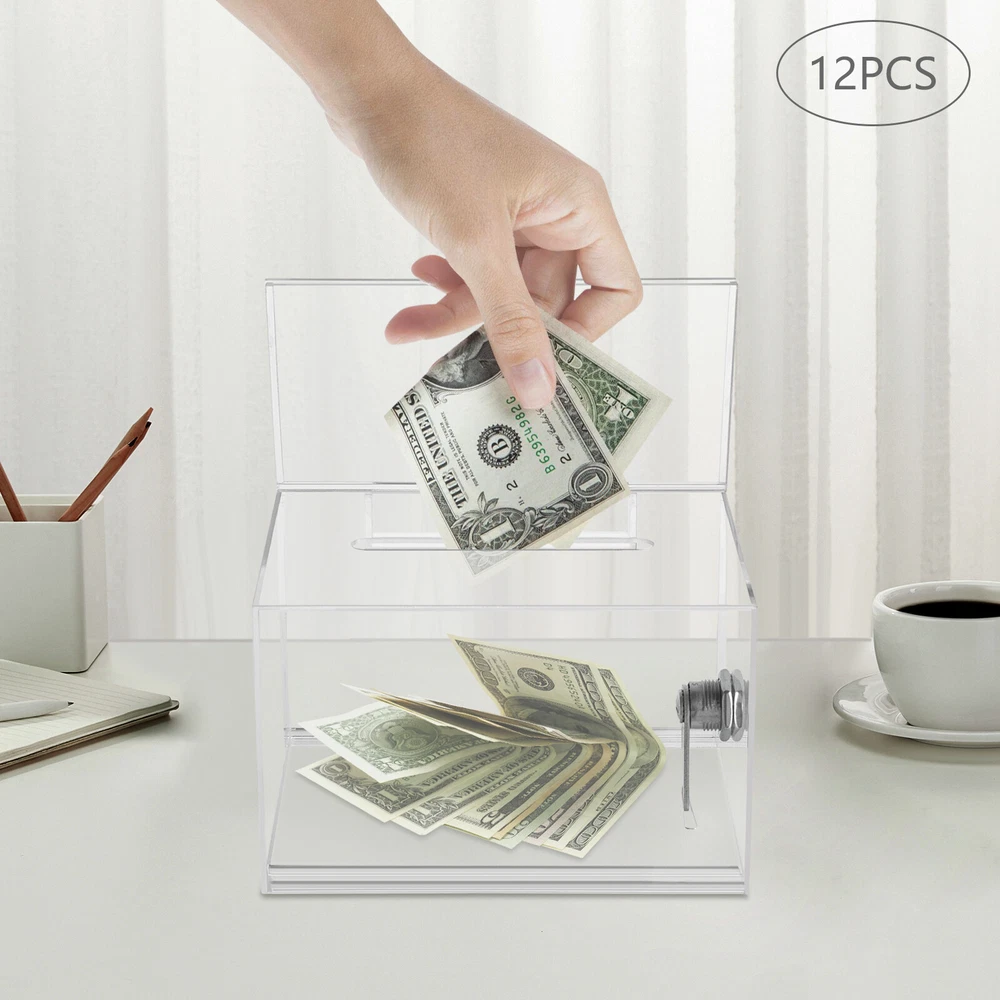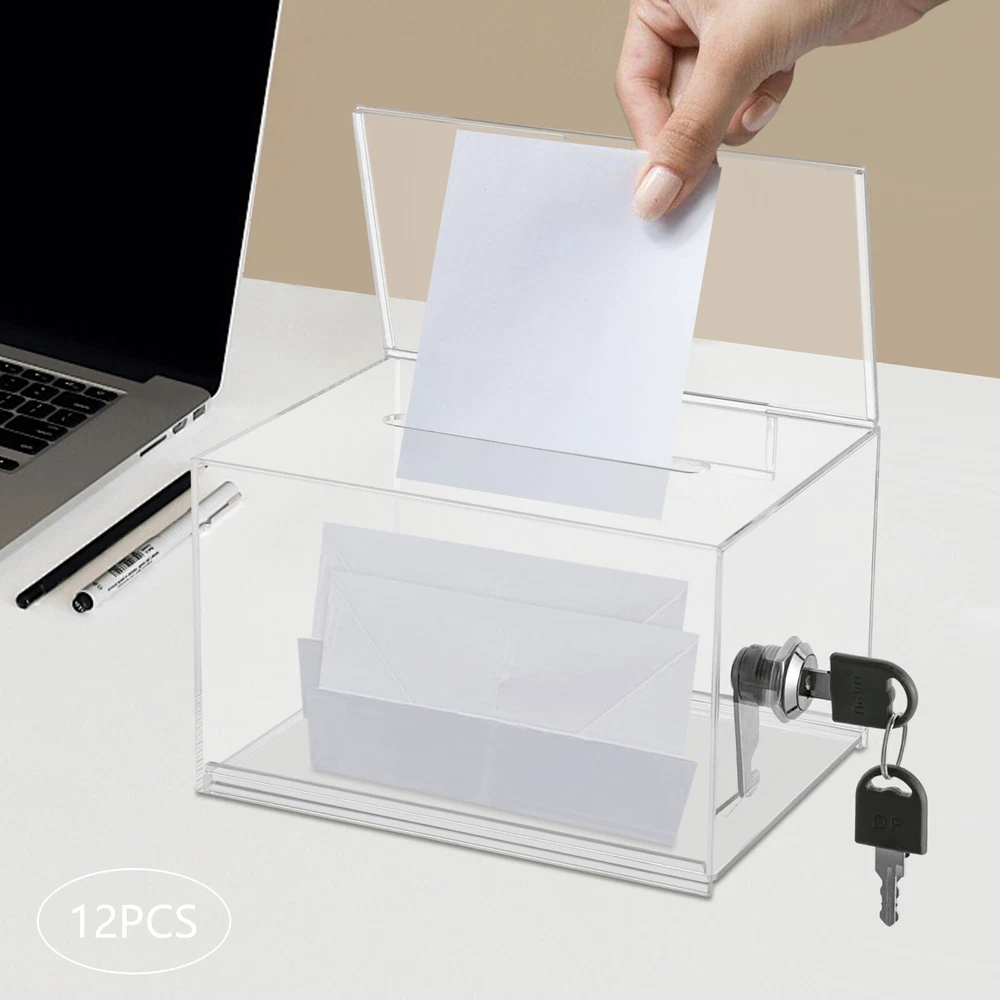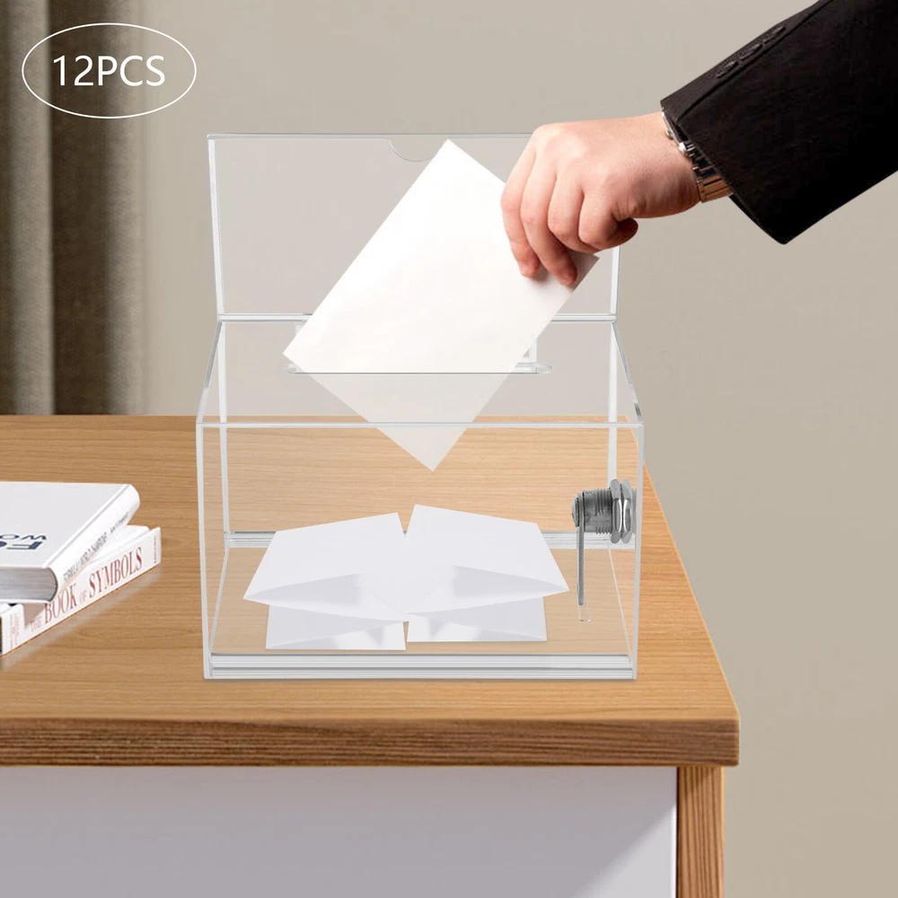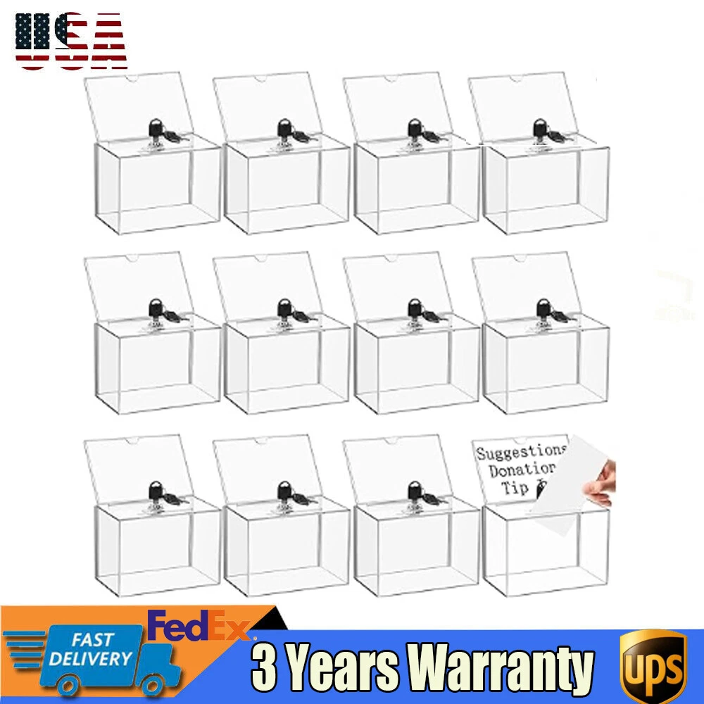 Description Voting or fundraising activities are right in front of you, but do you lack practical voting boxes? Take a look at our highly transparent acrylic ballot box! Each box comes with a lock and two keys, which can help you organize more professional voting and fundraising activities while ensuring fairness and trust. Key Features High-quality and Durable: It is made of high-quality acrylic with a laser cutting process, which has high tenacity and is not easy to break and deform. Suitable Size: The external size of 6.3*4*4.5 inches provides sufficient space to accommodate items like coins and coupons while only taking a small footprint, making it a very suitable size. Visible Design: The high-transparency acrylic provides excellent visibility to the items inside, you can use it as 12PCS Acrylic Suggestion Boxes Clear Acrylic Donation Box Ballot Box with Lock Description~ Description Voting or fundraising activities are right in front of you, but do you lack practical voting boxes? Take a look at our highly transparent acrylic ballot box! Each box comes with a lock and two keys, which can help you organize more professional voting and fundraising activities while ensuring fairness and trust. Key Features High-quality and Durable: It is made of high-quality acrylic with a laser cutting process, which has high tenacity and is not easy to break and deform. Suitable Size: The external size of 6.3*4*4.5 inches provides sufficient space to accommodate items like coins and coupons while only taking a small footprint, making it a very suitable size. Visible Design: The high-transparency acrylic provides excellent visibility to the items inside, you can use it as a ballot box to ensure justice or as a charity box to showcase the love from people. Good Protection: Each box has a lock with 2 keys that can prevent the loss of internal items and also provide convenience for you to take out internal items. 12Pcs a Set: This set includes twelve ballot boxes, so you don't need to purchase them repeatedly, greatly saving time and energy. Good Helper: With the help of this ballot box, you can easily accept the opinions of employees or customers and solve existing problems promptly, which is conducive to improving your image and providing better services for them. Easy to Use: After receiving the package, you only need to insert the board and label plate to start using it, which is simple and convenient. Easy to Clean: This product has a smooth surface and simple structure, so it reduces the difficulty of cleaning. You only need to use a towel to remove the dust on it. Details Label Plate: You can insert paper with voting or donation promote information into it without the need for glue. The curved groove design makes it more convenient for you to take out the paper from the label plate. Slot: You can easily put the ballot papers into the box through the slot on top, which is very convenient and fast. Application It is suitable for restaurants, companies, churches, coffee shops, hotels, salons, bars, proms, parties, marketing promotions, tradeshows, exhibitions, etc., to accommodate donations, ticket comments, suggestions, coupons, ballots, notes, coins, business cards, and tips. Specification Color: Clear Style: Modern Lock Type: Key Material: Acrylic Process: Laser Cutting Shape: Rectangular Assembly Required: Yes Mounting Type: Tabletop Thickness: 2mm/0.08in, 3mm/0.12in Label Plate Size: 16*10cm/6.3*4in Product Size: 16*10*11.5cm/6.3*4*4.5in Internal Size: 15.4*9.4*10.5cm/6.06*3.7*4.13in Ballot Slot Size: 10.5*1cm/4.13*0.39in Package Size: 35*30*30cm/13.78*11.81*11.81in Gross Weight: 5kg/11.02lbs Package Included 12* Ballot Boxes 12Set* Keys Notes Please understand that ballot papers, tickets, cards, etc. are not included. Please allow the slight color difference caused by the shooting light and 1-3cm error due to manual measurement, and make sure you do not mind before ordering. Payment Delivery details Terms of sales About us Contact us Payment We accept ebay payment 。 Fees such as import duties, taxes are not included in the item price or shipping costs. These charges are the buyer's responsibility. Delivery details Shipping: 2-9 working days to: USA Terms of sales We maintain high standards of excellence and strive for hundred percent customer satisfaction. Feedback is very important to us. We hope that you contact us immediately before you give neutral or negative feedback, so that we can address your concerns. It is impossible to address issues if we do not know about them! About us Your satis faction is our ultimate goal. We work hard to earn your trust and future business. Our certified technicians have tested each item before shipping. The unit comes with 1 year limited warranty on all manufacturing defects. a) If you receive a defective item, you may return it or ask for a discount. Please contact us within 14 days after you receive the package. b) What you returned must be intact and in its original packaging as re? u. Customer is responsible for shipping costs of the returned item. c) We will cover the cost of shipping back t with the shipping rate indicated in the registration page. We will send you a new unit or refund the full payment you paid. Thank you. Contact us Business Hour Business Hour: Monday To Friday: 8:30 AM to 5:00 PM (Beijing China time) Due to time zones, our reply to your questions may not be immediately. But within above working time, we will reply your email within 24 hours. If it's non-workdays, please kindly be patient and wait till Monday. Please contact us with ebay message. Please feel free to contact us if you have any questions. Monday To Friday: 8:30 AM to 5:00 PM (Beijing China time) Due to time zones, our reply to your questions may not be immediately. But within above working time, we will reply your email within 24 hours. If it's non-workdays, please kindly be patient and wait till Monday. Please contact us with ebay message. Please feel free to contac
