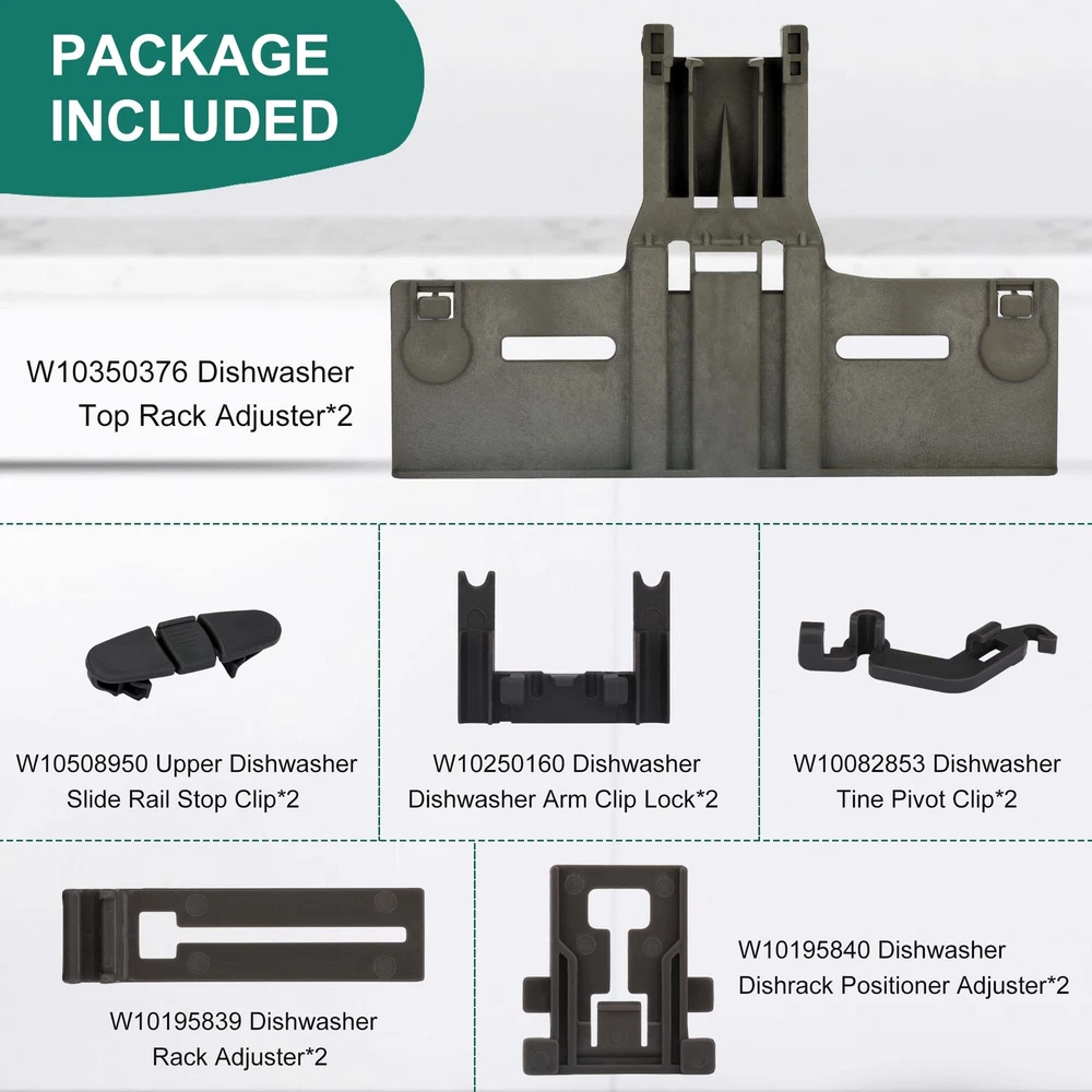 12PCS W10350376 Dishwasher Upper Rack Adjuster for Kenmore Whirlpool KitchenAid 【PACKAGE LIST】W10350376 dishwasher top rack adjuster parts Includes dishwasher upper adjuster W10350376*2 (Left&Right), W10195840 Dishwasher Dishrack Positioner Adjuster*2, W10195839 Dishwasher Rack Adjuster*2, W10250160 Dishwasher Arm Clip Lock*2, W10508950 Upper Dishwasher Slide Rail Stop Clip*2, and W10082853 Dishwasher Tine Pivot Clip*2. If your wheels are 1.25 inches, then the model number you need for dishwasher top accessories is W10350375. 【UPGRADE POLYMER MATERIAL】The updated W10350376 dishwasher top rack adjuster is made with a new polymer material and stainless steel roller (0.9 inch diameter metal wheel), which is stronger and more durable than other materials. All items are strictly tested before leaving the factory and the quality exceeds OEM product specifications, keep long-lasting performance for your dishwasher. 【WIDE COMPATIBILITY】Applicable models: 662.13042K112, 662.13043K112, 662.13044K112, 662.13049K112, 662.13282K112, 662.13283K112, KUDE20IXBL3, KUDE20IXBL6, KUDE20IXBL8, KUDE20IXBL9, KUDE20IXSS3, KUDE20IXSS6, KUDE20IXSS8, KUDE20IXSS9, KUDE20IXWH3, KUDE20IXWH6, KUDE20IXWH8, KUDE20IXWH9, KUDE40FXBL3, KUDE40FXBL4, KUDE40FXBL5, KUDE40FXSS3, KUDE40FXSS4, KUDE40FXSS5, KUDE40FXWH3, etc. W10350376 Dishwasher Top Rack Adjustment Parts Repair Kit is widely compatible with popular dishwasher brands, such as Whirlpool Jenn-Air Kenmore KitchenAid, etc. If you don't find your dishwasher model, please contact us. 【REPLACES PART NUMBERS】① W10350376 dishwasher top rack adjuster replace W10350374 W10238418 W10253546 W10350376 W10712394VP 3447661 AP5956100 EAP10064063 PS10064063. ② W10195840 dishwasher positioner replaces W10418323 1872228 AP4566230 PS3407016 AH3407016 EAP3407016. ③ W10195839 rack adjuster replaces 1872227 AP4566229 PS3407015 EAP3407015. ④ W10250160 adjuster arm clip lock replaces 1873273 AP4567016 PS3407174 EAP3407174. ⑤W10508950 slide rail stop clip replaces AP6022472, 8562015, W10508950, 2684662, PS11755805. ⑥ W10082853 dishwasher tine pivot clip replaces WPW10082853, WPW10082853VP, PS11748190, 1446946. 【PERFECT SOLUTION】Dishwasher top rack adjuster kit can effectively solve the following common problems: ① dishwasher does not wash properly; ② dish rack cannot be pulled out or pushed in; ③ dish rack is not level; ④ upper rack cannot be fixed, etc. In addition, if you want to replace your dishwasher top rack adjuster kit, we have a wide range of accessories to fix your dishwasher in one step. 【After-Sales Guarantee】 Adhere to provide all customers with a simple, streamlined shopping experience of large appliance replacement parts, and prove that we have the highest quality parts and service out there. We stand by our products, and our customers are our focus as a business. If you have any quality problem, please contact customer service team in time, and we will try our best to solve your problems. Shipping Payment Return Customer Service Feedback Shipping We will ship the items within 24 hours on working days after your cleared payment. 1. Upon request, most of orders placed before 1pm EST can be shipped same day during weekdays from our US warehouse. 2. We only ship to the eBay confirmed address, Tracking number is uploaded to eBay orders. 3. Delivery time depends on destination and other factors, it may takes up to 3-8 working days. If you don't receive the item in 15 days, please contact us, we'll investigate and solve the delivery problem. 4. Import duties, taxes, and charges are not included in the item price or shipping cost. These charges are the buyer's responsibility. Please check with your country's customs office to determine what these additional costs will be prior to bidding or buying. Payment 1.We only accept PayPal. PayPal is the only online payment method we accept. 2.Payment must be made within 48hrs of the auction end time. 3.Non-Paying bidders will be reported. Return We provide 30 day return policy for products sold. If, for any reason, you are not satisfied with your purchases, full refund of the purchase (excluding the shipping expenses) can be applicable under the following circumstances: All accessories must be unused; ALL accessory packages must be unopened. All items must be intact and undamaged (except for defects in manufacturing). Items must be in good conditions with all original accessories, manuals, and packing materials. Any missing parts or damaged items will result in rejection on the return. In case of any defectives found, only defects in manufacturing are accepted as the reason of return. No refund is given if defects are caused by misuse of buyers. Our customer service officers will gladly contact you for further arrangement upon your request. All shipping cost thus generated is paid by the buyer. Item returned must be received within 7 days after the receipt of the items. No refund and replacement is issued after this period. Payment will be refunded as original currency only. We will not take responsibility for any loss due to exchange rate difference in the refund process. Refunds will NOT include ANY shipping and handling fees. Any additional expenses (such as eBay listing fees) will also be deducted from the refund. In the case of return, please be sure to include ALL the original contents (including gift, packages and manuals). Any missing contents may result in rejection of the refund. Please also make sure that the return package is securely packed, and apply waterproof packing instruments wherever necessary. Customer Service Working Time: Monday-Friday: 9:00-18:00 GMT+8 Saturday: 10:00-12:00 GMT+8 Customer satisfaction is very important to us and our feedback rating reflects this satisfaction We try our best to reply to your emails as soon as possible, however, due to high volume of daily incoming emails and time zone difference, we may not be able to reply your emails immediately. Please give