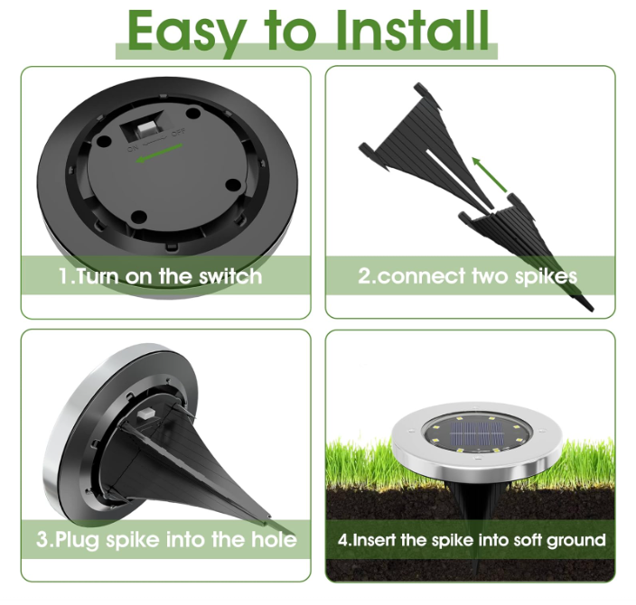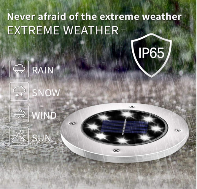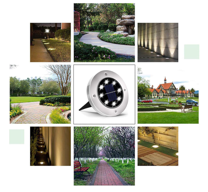 Solar Lights for Outside,12 Pack Solar Lights Outdoor Waterproof, Solar Garden Lights Landscape Lighting for Patio Pathway Lawn Yard Deck Driveway Walkway, Cold White About The Item: Solar garden lights: Each solar lights has 8 LEDs, adopt of the advanced, LED energy-saving, Ni-MH 600 solar lamp. 8-10 hours runtime with 8 hours of sunshine, save energy and be eco-friendly Protection Design: Made of stainless steel and plastic, waterproof and durable design. External waterproof switch, instead of pinhole switch, lightly waterproof operation IP65 and stainless steel body level makes it suitable for outdoor use. It can effectively isolate the water and the fog, which makes for a longer life. Integrated light sensor: Garden light with integrated light sensor, the landscape light turns on the night or turns on the light Wireless design: only to install seconds, no tools, no wiring, safe to use for children and pets. Each floor lights are better with the place you want Customer Service : If you have any questions with the recessed ceiling light with solar energy, please do not hesitate to contact us. We will respond to you within 24 hours and provide technical support and assistance.