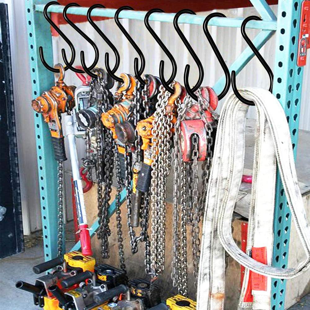 NON-SLIP & Premium Quality Material: our s hooks are made of thick metal steel with vinyl coated, which is rust-resistant, smooth and non-slip, you don't need to worry these hooks would scratch your finger or clothes,purse,scarf, jeans etc among using. Large Size & Heavy Duty: these solid S hooks measure 6 inch in length ,and the small side opening is 1.2 inch, the large side opening is 2.5 inch(could fit any standard closet rod); Two size opening could meet different needs. The diameter of the metal wire is 7mm. Very solid and could bear heavy items. pots,pans,spatulas,cups,mugs and other kitchen utensil on your pot rack, rails or shelves, make your cooking more efficient and easily. You could also use these non-slip closet hooks to tidy up your closet by hanging clothes, jeans, scarves, hats, belts, jewelry,purse and more; also useful to hang toiletries, towels and robes in the bathroom, and organize tools in the garage, and hang plants in your garden. PRACTICAL DESIGN: These S Shaped hooks are a simple and friendly solution to save the space, it doesn’t need to drill on your beautiful house and wall, you can hang them on racks, bars, shelves,rod and place in closet,kitchen,garage,bathroom,garden,indoor and outdoor. Package includes 12 pack black utility hooks, Rubber coated with rubber caps,smooth, non-slip,strong and multi-funtional. Product Description Large Vinyl Coated 6 inch 7mm Thickness heavy duty hooks big hooks size 6 inch in length, two size opening , large side opening is 2.5 inch,small side opening is 1.2 inch. Heavy duty thick metal steel with vinyl coated 7mm Thickness solid s hooks. Rubber coated surface-Non Slip , Anti-rust, resist falling and not Fall off . Non Slip Heavy Duty Steel Metal S Hook You also use could these closet s hooks for tidy up your closet by hanging clothes, jeans, scarves, hats, belts, jewelry,purse and more; also useful to hang toiletries, towels and robes in the bathroom, and organize tools in the garage, and hang plants in your garden. Closet S Hooks for Hanging These s shaped hanger are a simple and friendly solution to save the space, not require to use tools,nails, screws, or adhesives, black rubber coated hooks are easy to hang on existing objects,you can hang them on racks, bars, shelves,rod and place in closet,kitchen,garage,bathroom,garden,indoor and outdoor. simple and friendly solution to save the space, convenient and easy to use Not require to use tools,nails, screws, or adhesives, black rubber coated hooks are easy to hang on existing objects,you can hang them on racks, bars, shelves,rod and place in closet,kitchen,garage,bathroom,garden,indoor and outdoor.