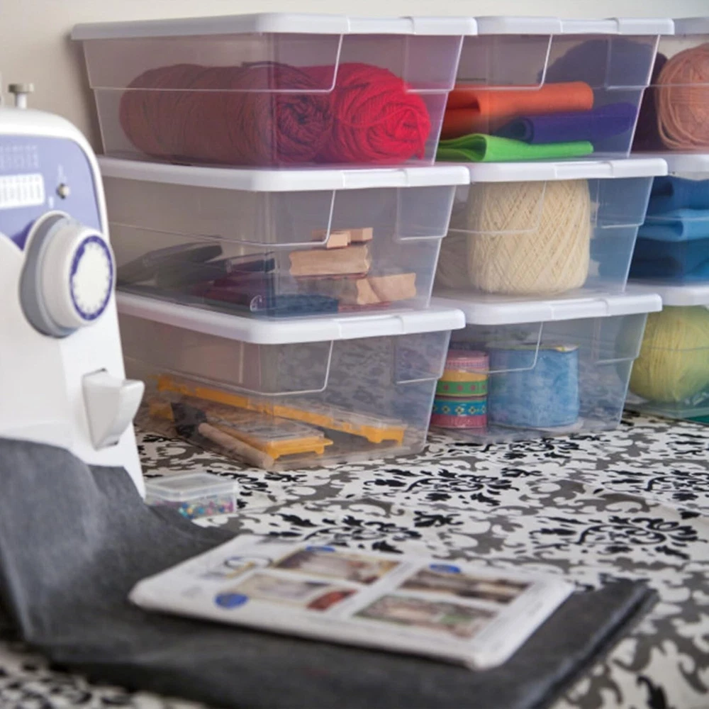 12-Pack Stackable Clear Storage Bins, 6 Quart with Snap-On Lids for Organization N/A-plastic Dimensions & Size: The storage boxes have outside dimensions of 13 5/8" x 8 1/4" x 4 7/8" and interior dimensions at the bottom of 11 1/4" x 6 1/8" x 4 1/4", making them perfect for organizing items. Versatile & Convenient: These storage boxes are ideal for a variety of basic and lightweight storage needs, making them perfect for use throughout the home. Secure & Easy Handling: The opaque lid securely snaps onto the base, providing a firm grip for effortless lifting and carrying. Easy Visibility: The clear base of the container allows for effortless viewing and locating of stored items. Sterilite products are proudly made in the USA since 1939 and are BPA and phthalate-free.