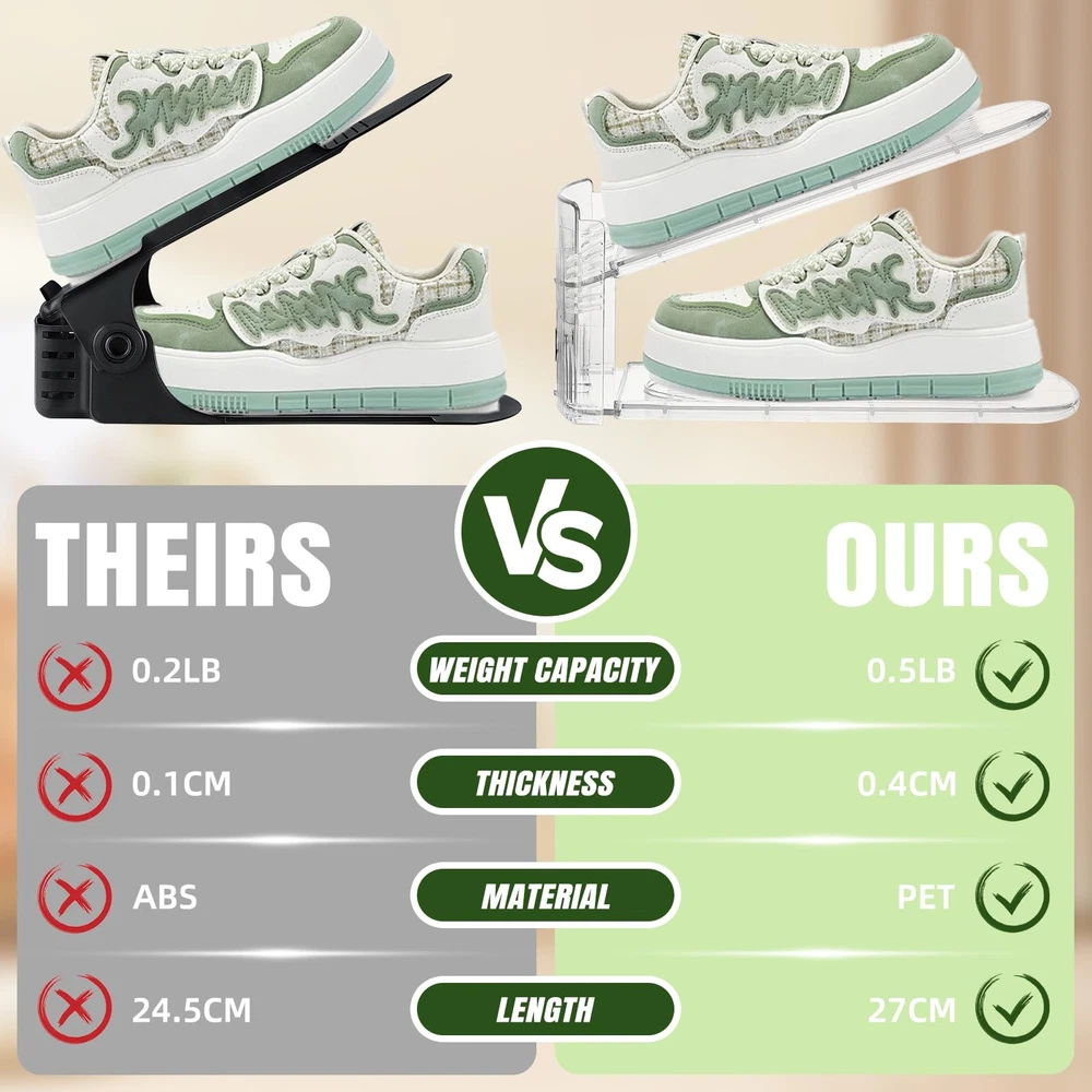 Clear Shoe Slot Organizer, 12 Pack Adjustable Shoe Slots Organizer for Closet Clear Shoe Stackers Shoe Rack Holder Shoe Space Savers for A Pair of Shoes(Transparent) DOUBLE ANTI-SLIP DESIGN: Clear shoe organizer adopts double-layer baffles to provide double protection, the small baffles can clip the heels of high heels, and the big baffles can prevent the board shoes from slipping off. THICKENED AND LENGTHED DESIGN: The length of the clear shoe slots is 27.5CM and the thickness of the shoe stacker is 0.4CM, which is thicker.Clear shoe slots can put more types of shoes and is not easy to dump. The length of other common shoe slots organizer is only 25CM, thickness 0.1CM. THREE LEVELS HEIGHT ADJUSTABLE: You can flexibly adjust the height of the shoe slot from 3.7'’ to 7.7'’, this shoe slot organiser is suitable for most shoes, it is suitable for slippers, high heels, trainers, leather shoes, ankle boots, hiking boots, stiletto heels and children's shoes. Provides an excellent space-saving solution for bedrooms, wardrobes and shoe racks. PET MATERIAL: Our shoe slot organisers are made of PET material, the shoe organizer are more transparent in appearance, sturdy and durable. The base is flatter and more stable, with a stronger load-bearing capacity, and will not be damaged by heavy pressure or frequent use. EASY TO USE AND CLEAN: Clear shoe slot organizer designed with pull holes for easy access to shoes. Meanwhile, it can be easily cleaned with water and soap for longer use.