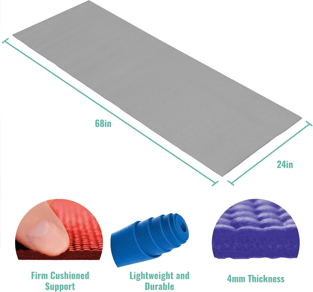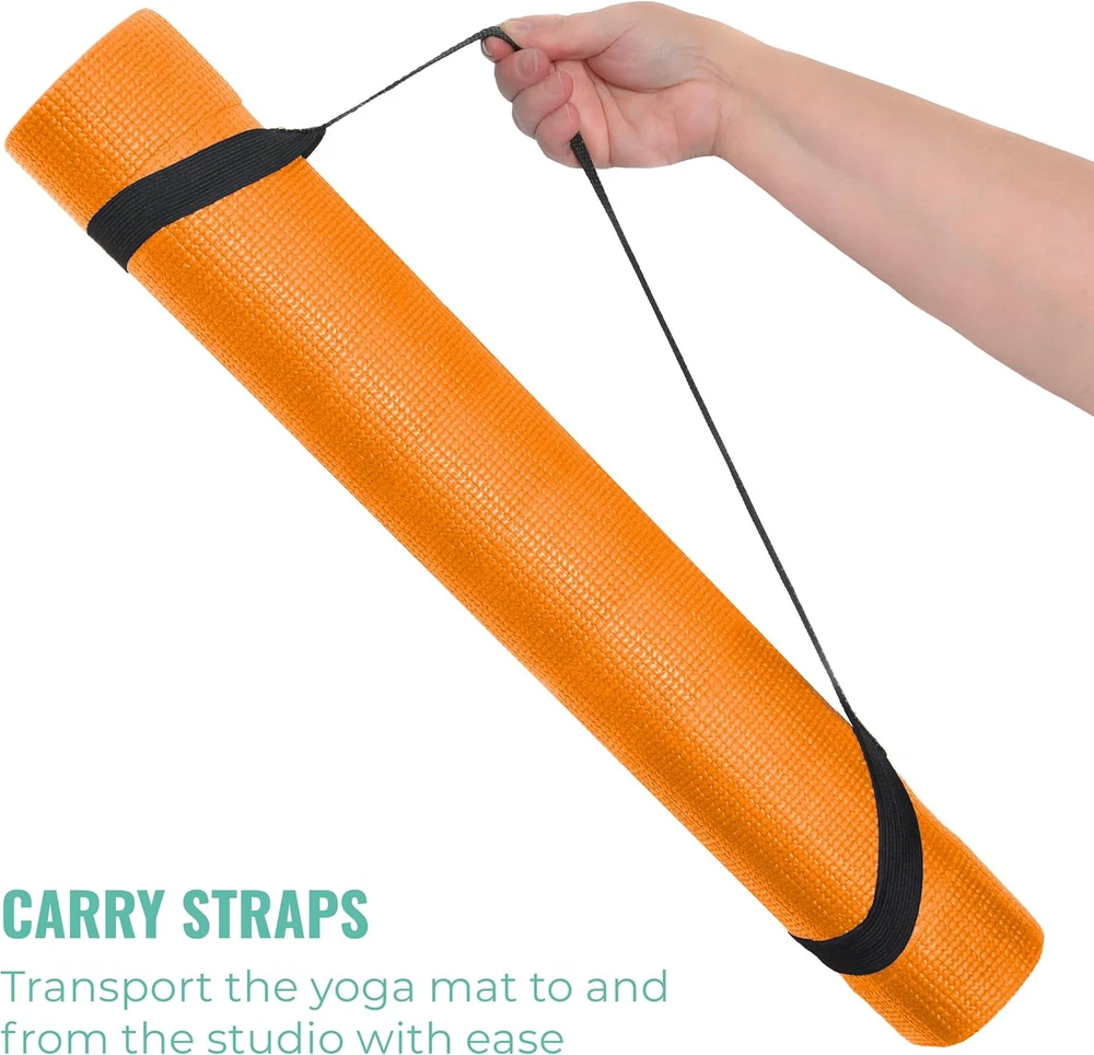 Budget-Friendly: Includes 12 individually wrapped exercise mats to provide schools, classrooms, and studios with cost-effective yoga props for a range of fitness activities involving students and beginners Easy to Maintain: With high-quality, closed-cell vinyl foam construction, each workout mat creates a barrier against liquids and stays clean longer; free from latex, lead, heavy metals, and 6P phthalates Non-Slip Surface: The textured surface of the fitness mat provides great traction to offer stable, balanced footing when changing poses or maintaining them for extended periods Cushioned Comfort: These workout mats cushion your knees and joints comfortably with their 4mm thickness to alleviate joint and knee pain when stable in a pose, stretching, or planking Convenient: Each yoga mat includes a carrying strap for easy transport from home to the gym or studio; these yoga mats measure 68 inches long and 24 inches wide Product Description UPWARD FIT CLASSIC YOGA MATS Without compromising quality and performance, the Upward Fit Classic Yoga Mat provides schools, classrooms, and studios with budget-friendly mats. Our yoga mats in bulk include individually wrapped mats so students and beginners can perform a range of fitness activities. The textured surface provides traction to offer stable, balanced footing when changing or maintaining poses for extended periods, ideal for individuals getting started with yoga, Pilates, or exercising. Whether you are stable in a pose, stretching, or planking, cushion your knees and joints comfortably with the 4mm thickness of each stretching mat. With high-quality, closed-cell vinyl foam construction, these exercise floor mats create a barrier against liquids to stay clean longer between classes for easy maintenance. To clean each mat, wipe down with a 50/50 mixture of water and vinegar, then air dry before rolling back up. Dimensions: 68in x 24in x 4mm