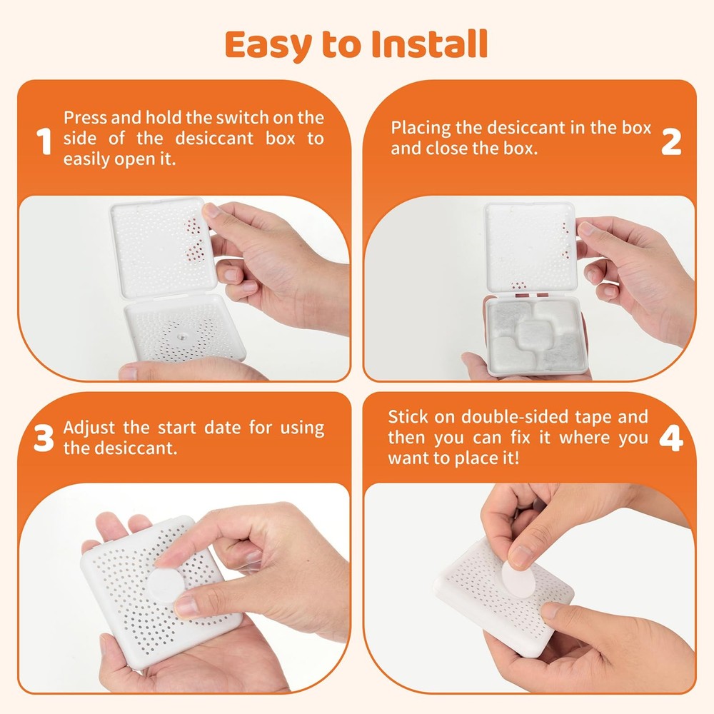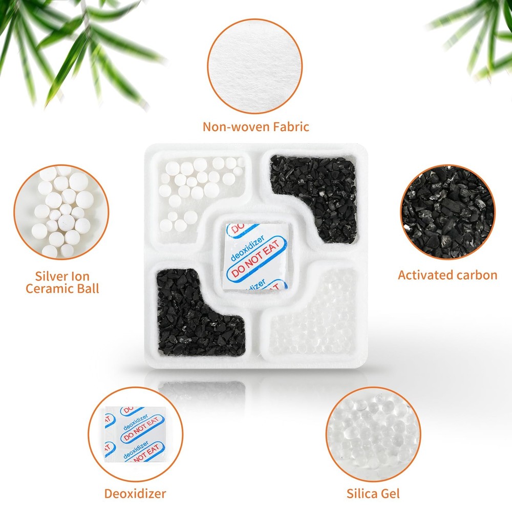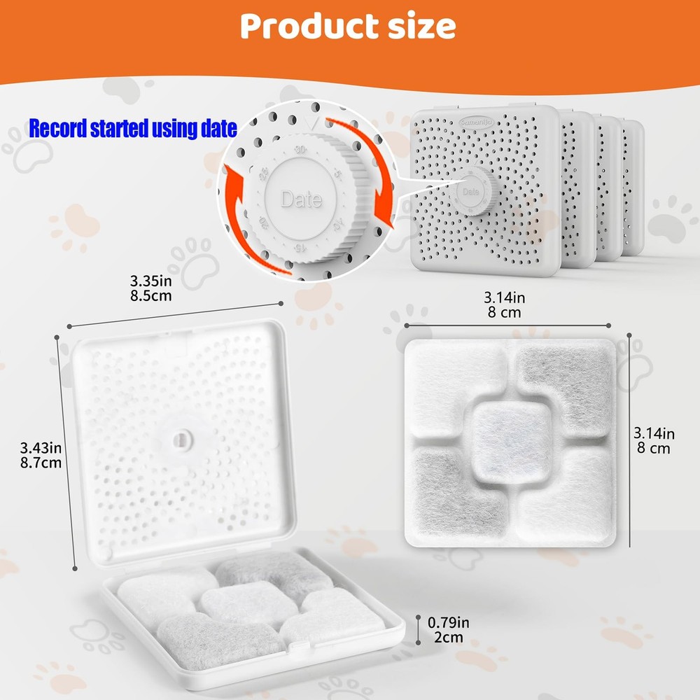 Pet feeder desiccants are designed to absorb excess moisture, keeping your pet’s food fresh and free from spoilage. This helps to extend the shelf life of dry pet food, ensuring your furry friend always has the best nutrition. This desiccant with case that can be affixed to the lid of your pet food storage container, compatiable with IRIS Gamma2 food storage containers, Compatiable with NKECOBJI Kacoomi Pet Automatic Dispenser Gravity Feeders.The desiccants also compatiable with petlibro IMIPAW automatic feeders, helping to maintain the food's dryness and freshness. [Ideal Compatibility] This desiccant, housed in a convenient case, can easily be attached to the lid of your pet food storage container. It is compatible with IRIS Gamma2 food storage containers, as well as NKECOBJI Kacoomi Pet Automatic Dispenser Gravity Feeders. It also works well with Petlibro and IMIPAW automatic feeders, ensuring that your pet's food stays dry and fresh. [Key Features] The plastic case allows you to record the date you first started using the desiccant. Additionally, the package includes two double-sided adhesive strips, which are perfect for securing the desiccant to the inner lid of any pet food storage container or feeder. [Quality Materials] The desiccant packets are made from sterile non-woven fabric, silica gel, deoxidizers, activated carbon, and silver ion ceramic beads. This combination effectively keeps every bite fresh while preventing your cat or dog from damaging or swallowing the packets.The desiccant packets effectively absorb excess moisture, preventing mold and bacteria growth in your cat's food. [Versatile Usage] These desiccants are designed not only for pet food but also for a variety of storage needs, such as human snacks, fruits, rice, flour, and corn. They are also effective for electronics, clothing, shoes, jewelry, medicine, tools, and many other everyday items. [Helpful Tips] To maintain the freshness and hygiene of your pet food, replace the desiccant bags every 2 to 4 weeks. Increase the frequency during humid conditions or when storing larger amounts of food. Each desiccant is individually packaged for extended shelf life, so keep packets sealed until you’re ready to use them to prevent oxidation. them in a dry environment.