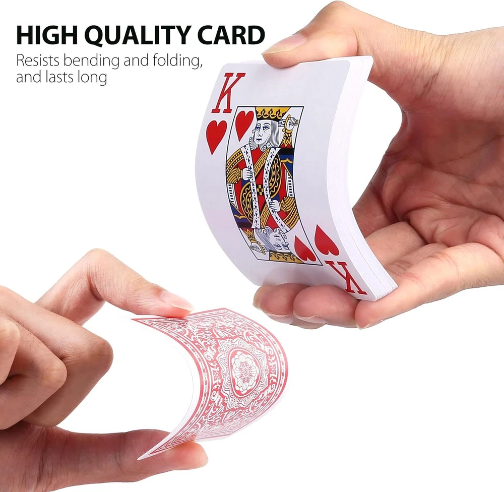 Great quantity of 12 decks playing cards: 6 red and 6 black; each deck contains 52 suited cards and 2 jokers Playing cards are great for many card games: Texas Hold'em, Blackjack, Pinochle, Euchre, Bridge, Canasta, Go fish, Poker, Hearts, Baccarat and more Jumbo index playing cards are super-indexed, big-faced and large-numbered, easy to see, helpful to players with imperfect eyesight, and favored by seniors Plastic-coated decks of cards for a smooth feel and extra durability, easy to shuffle; made from paper stock; linen finish for better handle; blue core sandwich construction for professional game play, nearly Casino Grade Poker size (wide size) cards measure 2.5" x 3.5"; This is regular playing cards. If you play pinochle game, just pick out two copies of 9,10, J, Q, K, A cards of all four suits and remove unneeded cards. Product Description Jumbo Index Playing Cards If you have to strain to see the small print on standard index cards, then Jumbo Index is good choice for you. Jumbo index means the ranks, and suit symbols are printed larger on the cards than standard index. The card size is same with traditional card, measures 2.5" x 3.5". Super Index Playing Cards are easier to see from far away, especially great for Texas Hold'em, which requires you to hold few playing cards in your hand, and relies heavily on community cards for all the players crowded around the table to see. Jumbo Index is also suitable for players with imperfect eyesight, and favored by seniors. LotFancy Playing Cards LotFancy Playing Cards are made from paper, coated with a layer of plastic, to make slick, durable and flexible. These cards have excellent quality graphics, shuffle easily and feel very substantial. Blue core sandwich construction prevents from cheat, nearly Casino Grade, great for professional game play. Jumbo-indexed playing cards feature classic red and black suits, super-index, and big-face, available in both black and red card backs. Each deck includes 52 suited cards and 2 jokers. You will love it ! Playing cards are one of favorite items for party, travel and camping to kill time with friends and family, perfect for Poker Night and Casino Party. Whatever you play texas, poker, bridge, euchre, canasta, hearts, go fish, pinochle and other different variations of solitaire, even practice card sleights or cardistry, LotFancy playing cards can satisfy all your need. Specification Quantity: 12 Decks or 2 Decks Color: red; black Card size: 2.5” x 3.5” (63mm x 88mm) Index: jumbo size