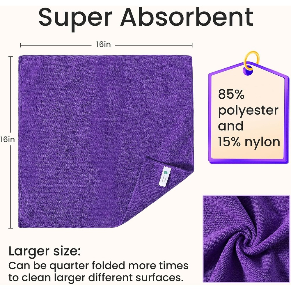 Color Multicolor Towel form type Cleaning Cloth Age Range (Description) All Ages Material Microfiber, Polyamide, Polyester About this item 【Material】Microfiber(85% polyester and 15% nylon) 【Ultra-Soft,Scratch-Free,Lint-Free and Streak-Free】The capillary structure of microfiber towels is more delicate,can remove some fine dust,effectively absorb stains while protecting the surface from damageleaving no fiber fragments or other residues,and the cleaning effect is very significant. 【Super Absorbent】 Microfiber cleaning cloths have excellent water absorption,which can quickly absorb moisture and dry quickly. 【Multi-purpose】Cleaning towels have a wide range of uses,Suitable for various cleaning tasks in car,kitchens,bathrooms,glass surfaces and household items. 【Non-Linting,Fade-Resistant Fabrics】Microfiber Cleaning Rags have a high cost performance ratio and can be washed hundreds of times without linting or fading