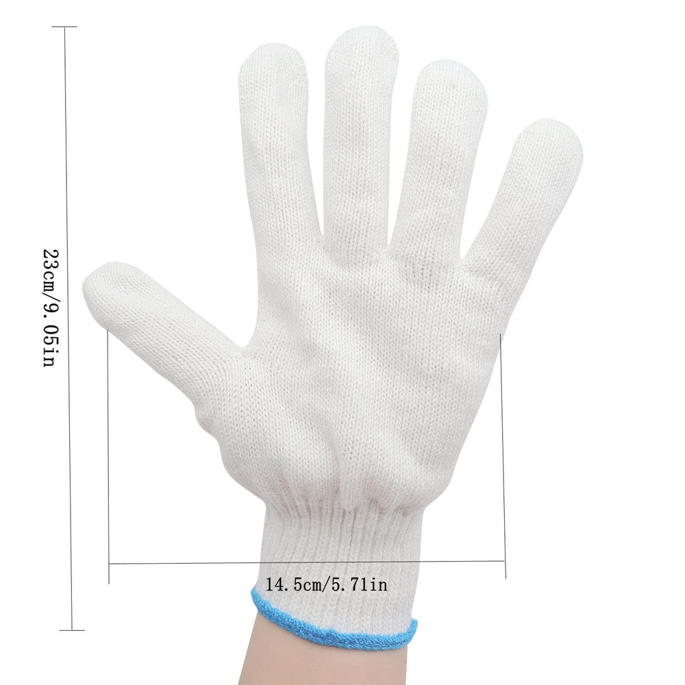 String Knit Work Glove 1.BREATHABLE AND COMFORTABLE:Cotton provide dry while helps absorb perspiration and the polyester provides a soft feel to keep hands comfortable 2.PACKAGE INCLUDING:you will get 12 pairs hand working gloves,which are wear-resistant and non-slip,launder-able,can be applied repeatedly and fit well for construction projects,these knit gloves will protect your hands well 3.NICE DESIGN:Safety Grip Protection Gloves white cotton environmentally friendly fabric material offer versatility, strength and durability. seamless polyester knit is comfortable and flexible and the cotton knit is soft against the skin 4.COMFORTABLE WEAR:Safety work gloves are form-fitting,cool,and snug,making them nice general-purpose gloves,seamless polyester knit is comfortable and flexible and the cotton knit is soft against the skin, so these white gloves are good enough to wear for long periods 5.EASY TO USE:These safety work gloves can protect your hands while you are doing duty and heavy work,these glove liners can also offer nice protection when you work in painter,mechanic,industrial,warehouse,gardening,construction or any lightweight work