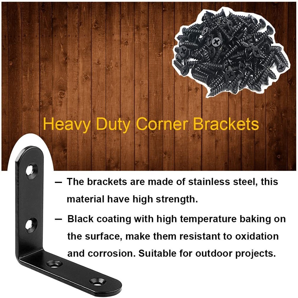 L BRACKET FEATURES: Ours black corner braces and screws are made of high-quality 304 stainless steel with high temperature baking coating, Rust-resistant, Round end, No burrs, Counterbore designed, Safer and more strong. METAL BRACKET SIZE: 2.5" x 2.5" x 0.8"/ 65*65*20MM, Thickness: 0.1"/ 2.5MM, Hole Dia: 0.2"/ 5MM. Max. load support: 50lbs / A pair shelf brackets. WIDE APPLICATIONS: 90 degree joint brackets can fasten wooden bed, table, chair, cabinet, shelf, wardrobe, bookshelf. EASY TO INSTALL: The package includes the mounting screws. You just need to make sure that the right angle brackets are perpendicular to the furniture and use screwdriver or electric drill to fix the hardware bracket in a breeze. PACKAGE CONTENTS: 12 x Black corner brackets, 48 x Stainless steel screws. Meet your daily requirements to make furniture parts stay firm.