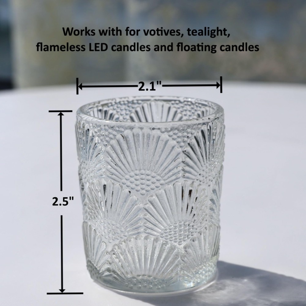 12Pcs Clear Votive Candle Holders Glass, Glass Tealight Candle Holder for Table Centerpiece, Vintage Tea Lights Candle Holder Decor for Wedding Table, Birthday Christmas Party [Glass Votive Candle Holders]: Clear candle holder is eye-catching because its elegant ginkgo leaves embossed design, you can't miss this for every table setting. When filled with candles, the ginkgo leaves pattern is more distinct, reflect beautiful and soft candlelight, that make your home cozy and warm [Candle Holder for Wedding Decor]: Tea light candle holders with ginkgo leaves pattern are charming, aesthetic. It is definitely a necessary decor for wedding, engagement, anniversary, an adorable gift for lover, leave happy and unforgettable memories [Works with Different Candles]:12 pcs candle votive holders measure 2.1" diameter, 2.5" height, weight 0.26lb each, the capacity is approximately 3 oz. We recommend to use for votives, tealight, flameless LED candles and floating candles [Great Quality Candle Holders]: We are expert in the field of candleholder, ginkgo candle holder comes with substantial glass material, it is heat-resistant, sturdy, and fairly resilient to breaking if falling. They are packed efficiently in bubble wrap, double boxed with dividers, so each one will be in perfect shape when you receive the package [Widely Use for Various Occasions]: Votive candle holders bulk can be an excellent table decoration for home (windowsill, dinner table, fireplaces, bedroom), theme event (birthday party, baby shower, bridal shower), holiday (Easter, Halloween, Thanksgiving, Christmas, Valentine's Day) etc