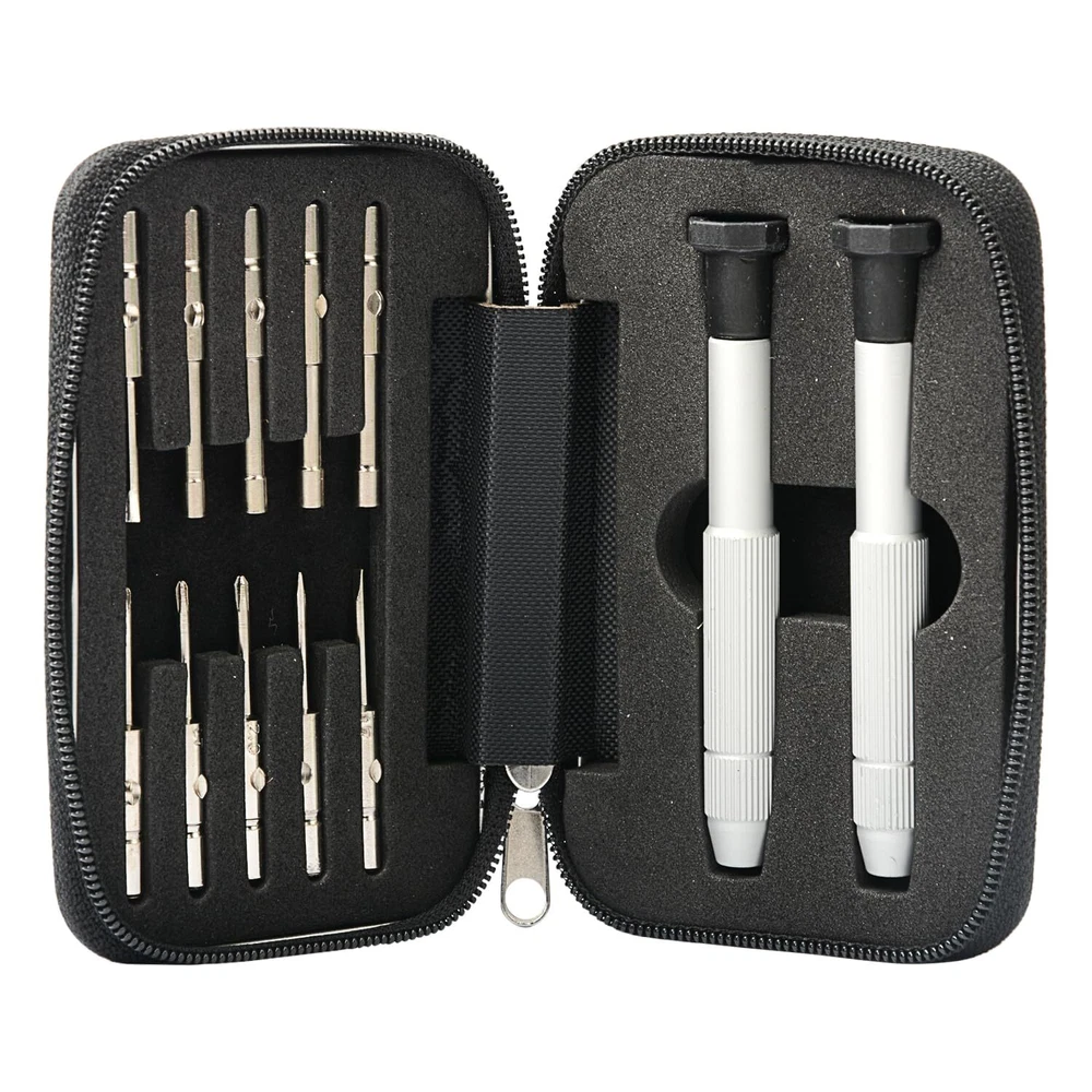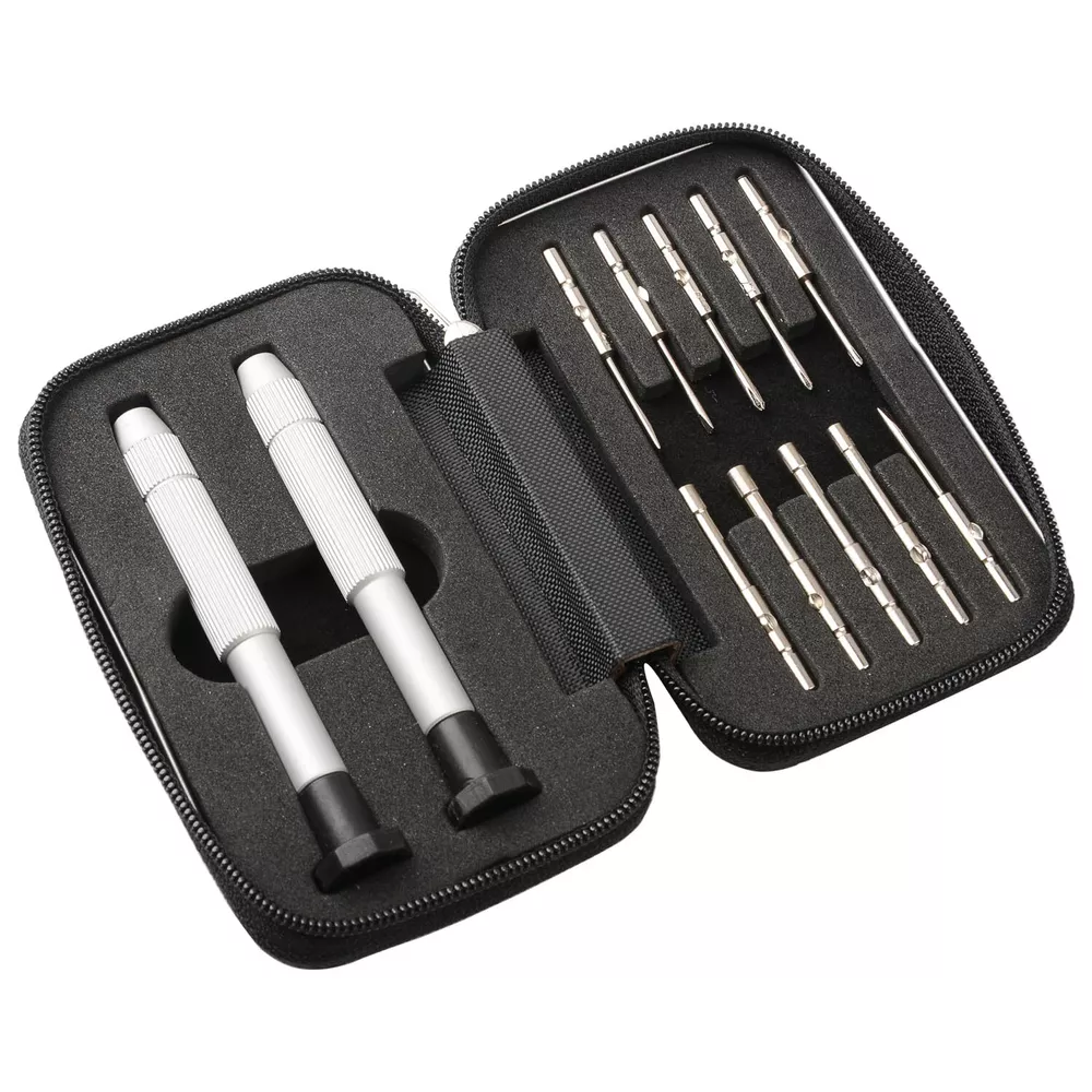 Specifications: - Material: High strength steel - Weight: 108g/0.238lb - Hand Length: 85mm/3.35" - Screwdriver Bits Length: 40mm/1.57" - Zipper Case Size: 105x65x25mm/4.1x2.6x0.98" Package Include: 2 x Screwdriver Handle 1 x Torx Sleeve Screwdriver(2.8) 3 x Flat Head Screwdriver(1.5/1.7/2.0) 3 x Phillips Screwdriver(1.5/1.7/2.0) 3 x Hex Nut Screwdriver(2.0/2.3/2.56) ❣ Note: Screwdriver are available for full-frame glasses and half-frame glasses, not suitable for his rimless glasses. ✔ How to use: Press down on the bits before removing it and then it can be easily removed. The top of glasses screwdriver can be rotated 360°, which is very easy to operate. Durable and unbreakable. ❤ Application: These screwdriver kits are perfect for repairing eyeglasses, watches, household appliances, mobile phones, toys, also ideal for smart phone, laptop, game console and most hand held electronics repair. Its more than a tools but important part in your DIY life, covered a wide range of works and repairs in our daily life. Professional Eyeglass Screwdrivers Kit: Travel pocket screwdriver set contains 2 pieces of multi-use single open-ended sockets set and 10-style rechange precision screwdriver blades. 10-Style Screwdrivers Includes: 3Pcs Flat head screwdriver(1.5/1.7/2.0), 3pcs Phillips screwdriver(1.5/1.7/2.0), 3pcs Hex nut screwdriver(2.0/2.3/2.56), and 1pcs Torx nut screwdriver (2.8). Scope of Application: These screwdriver kits are perfect for repairing eyeglasses, watches, household appliances, mobile phones, toys, and works and repairs in our daily lives. High Quality: Our screwdriver repair tools are made of high-strength steel, high-performance blades, and hardened heat treatments. Travel Pocket Screwdriver Set: With a steel polished pouch for easy carrying. Pouch size: 105x65x25mm/4.1x2.6x0.98". Small and compact to store and easy to travel with.