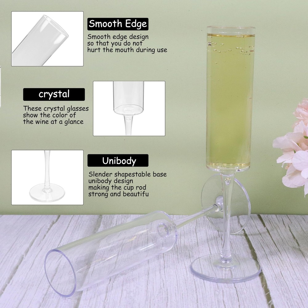 1 【Elegant Plastic Champagne Flutes】: Our plastic champagne glasses are made of heavy duty, shatterproof, bpa free plastic that is unbreakable and drop resistant. Plastic clear champagne flutes are reusable, making them a great choice for parties. Note:Not suitable for dishwasher use,or microwave use 【Value Package】: You will get 12 pcs acrylic clear Champagne Flutes, these disposable champagne glasses measure 9.69x1.81x2.87 inch with 6oz capacity, plentiful and right size, perfect for you to host your family and friends party 【Easy to Clean】:This plastic champagne glass has a smooth surface and is very easy to clean, a rinse with water and a wipe with a damp cloth after use will remove any dirt or stains, saving you time and energy and allowing you to focus on enjoying your leisure time 【Perfect Gift】: These plastic long stem champagne flutes are delicate, charming and luxurious, can be used as a unique gift for your family, friends, it will impress everyone, it is a unique gift to celebrate important moments 【Worth Having】:These plastic disposable champagne flutes are perfect for hot and cold drinks, making them ideal for everyday use, parties, or outdoor events. Goblet glass are suitable for a variety of drinks such as wine, champagne, whiskey, mimosas, sparkling cocktails, and more