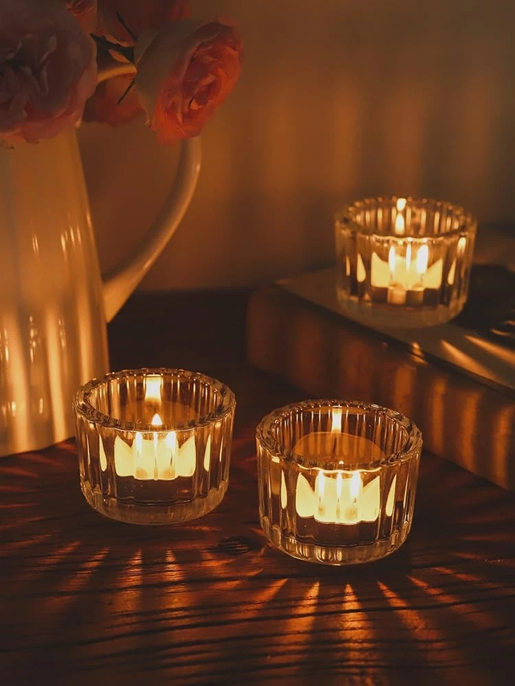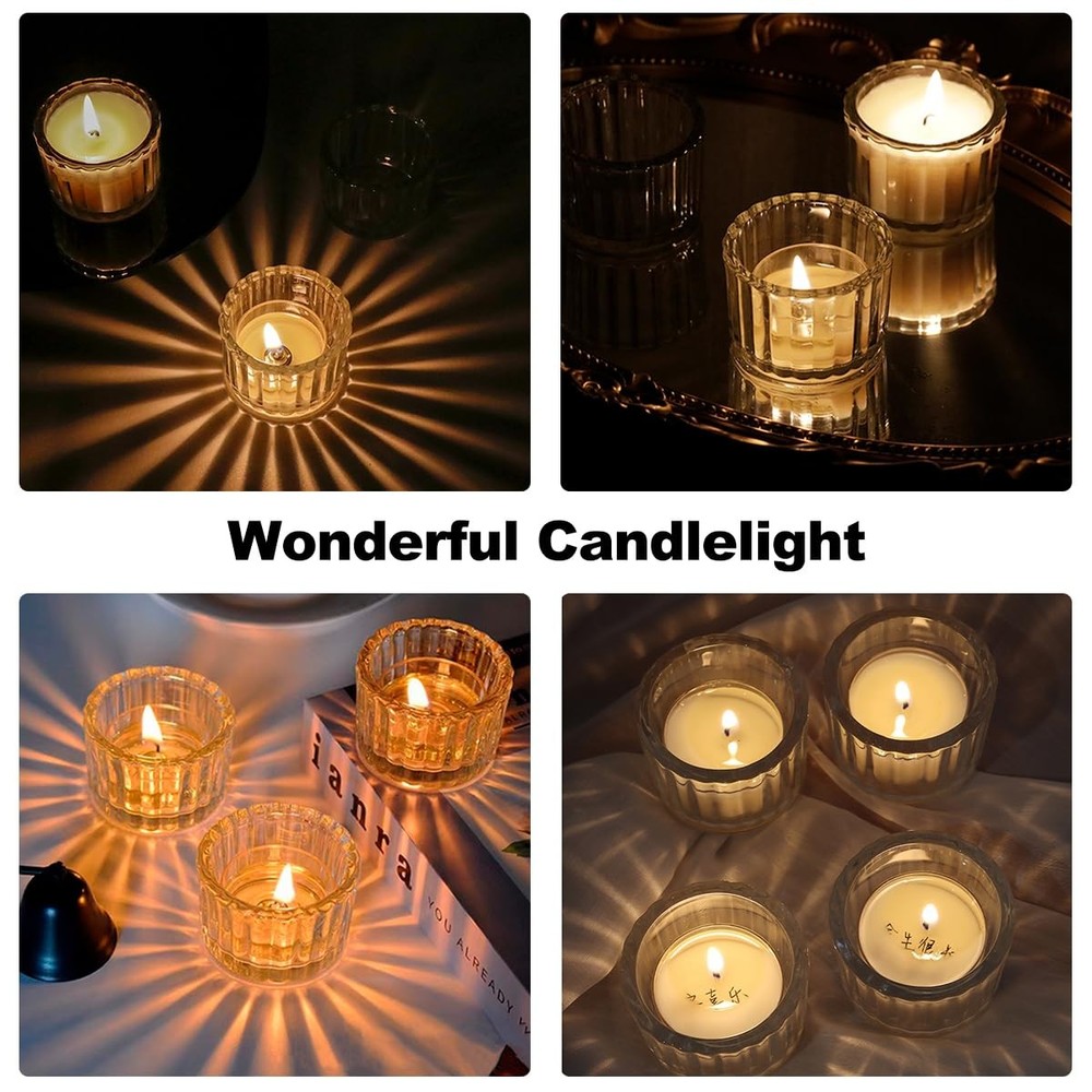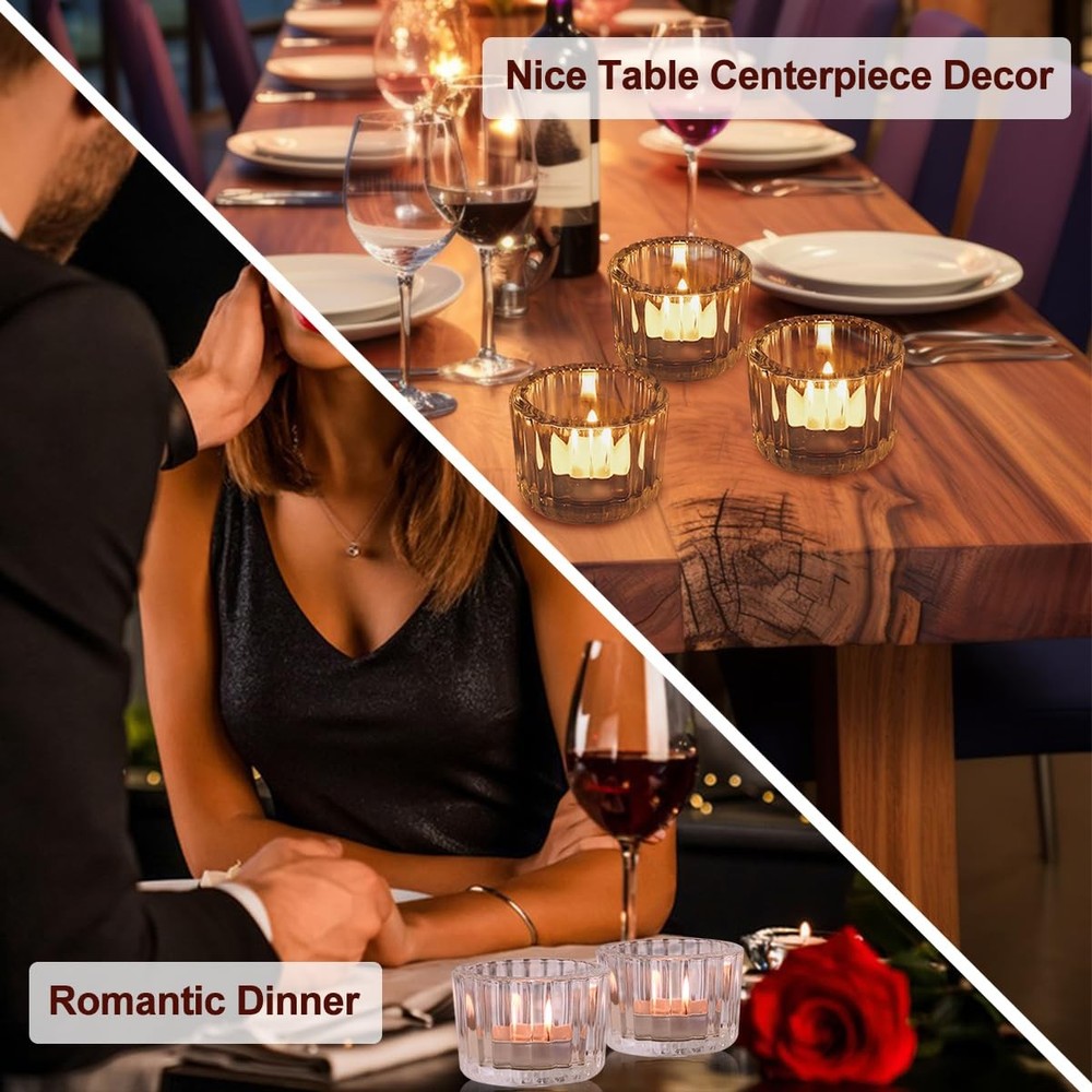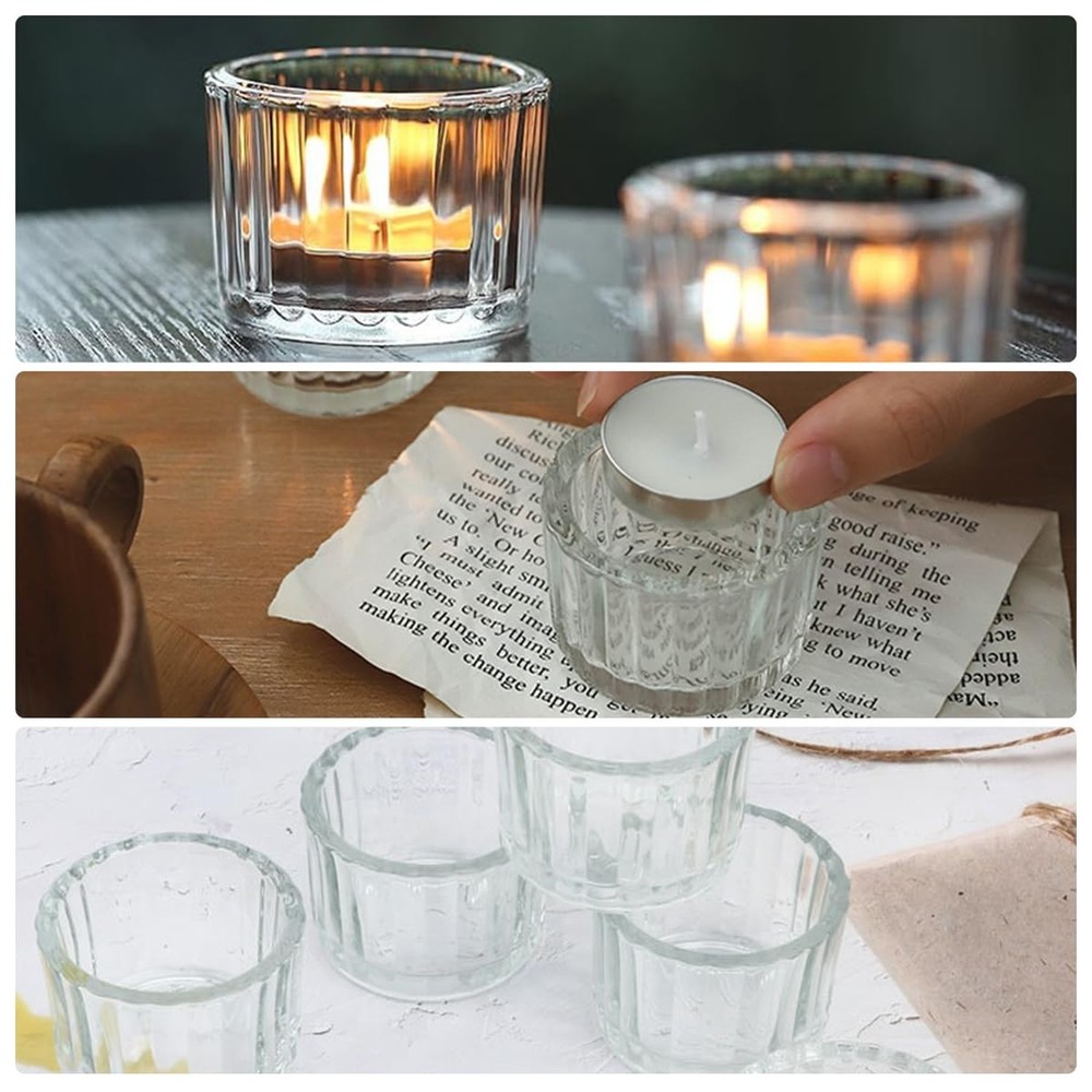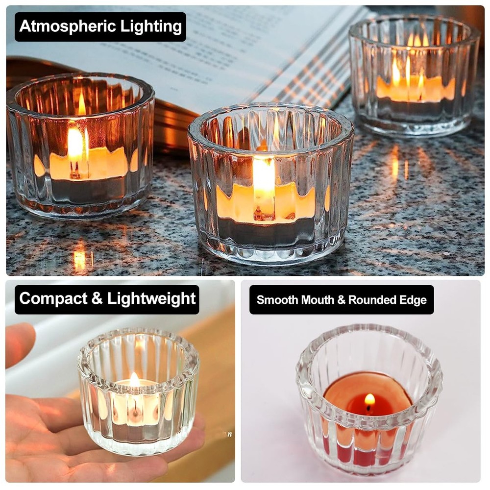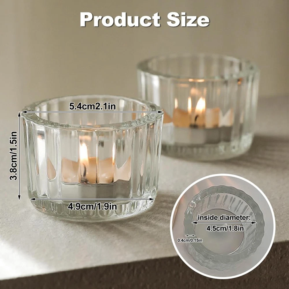 Product description 【Widely Application】 More than just a decorative piece, small candle holders bring warmth and beauty to a variety of scenes. Whether it's a casual moment in your daily life or a special celebration, votive candle holders with their elegant design and warm glow will add a unique touch to your life. Imagine lighting a candle at dusk on a winter's day as the light inside the sconce dances across the glass, mapping out a soft halo that warmly lights up your home. At dinner, the transparent design allows the candlelight to mingle with the colors and aromas of the food, adding a touch of romance and subtlety to every meal. During festivals or celebrations, this tealight candlestick conveys warmth and joy to every participant, adding a sense of peace and solemnity to the entire occasion. 【Nice Decor for Table Centerpiece】 Blending minimalist modernity with classic elegance, the tea candle holder is perfect for showcasing your taste in home décor. Its clear glass reveals the warmth and softness of the candlelight inside, adding a touch of serenity to the space. 【Reliable Material】 With its delicate design and solid structure, this tea light candle holder glass is able to safely carry candles of most sizes (less than 4cm/1.6in in diameter). Not only as a highlight of home decoration, but also for romantic dinner accents. 【Suitable for Gift-giving】 Candle holders crystal clear glass, smooth lines lines and polished rounded edges, elegant and high class premium, excellent wedding, birthday, party, Valentine's Day, candlelight dinner, housewarming and other occasions gifts. Vintage & Elegant Design: Transparent glass votive candle holders and their embossed line shapes refract more candlelight, producing stunning and captivating visual and lighting effects, is a great table centrepiece decor Creative Candle Holders: The tea light candle holder glass has a capacity of 48 ml and measures 5.3 cm/2 in wide and 3.8 cm/1.5 in high, can be used to hold a variety of homemade scented candles, suitable for candles less than 4 cm/1.6 in in diameter. Clear and simple, small and exquisite candle holder can be well matched with a variety of different colours and shapes of candles Wide Range of Uses: These votive holders are perfect table centrepieces for all kinds of parties, weddings and dinners, which can enhance your life taste, create a warm and romantic atmosphere. Tea candle holders are not only suitable for daily, but also for Christmas, Valentine's Day, Halloween, Thanksgiving, birthdays and other important occasions Premium Material: The wedding table decor is made of high-quality, high-transparency thickened glass with a sturdy base to ensure stability. The walls of the candlesticks are thick enough to insulate and prevent breakage due to overheating. Candle holders are very lightweight (73 g/each), making them easy to move and use Adequate Quantity: Package Includes 12 pcs clear candlestick holders(Candles are not included) , enough for your daily use, display and decorative needs. I hope your life can shine as bright as candlelight