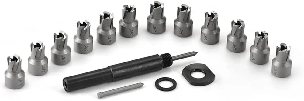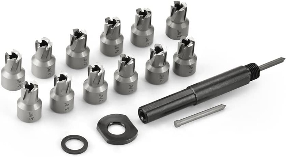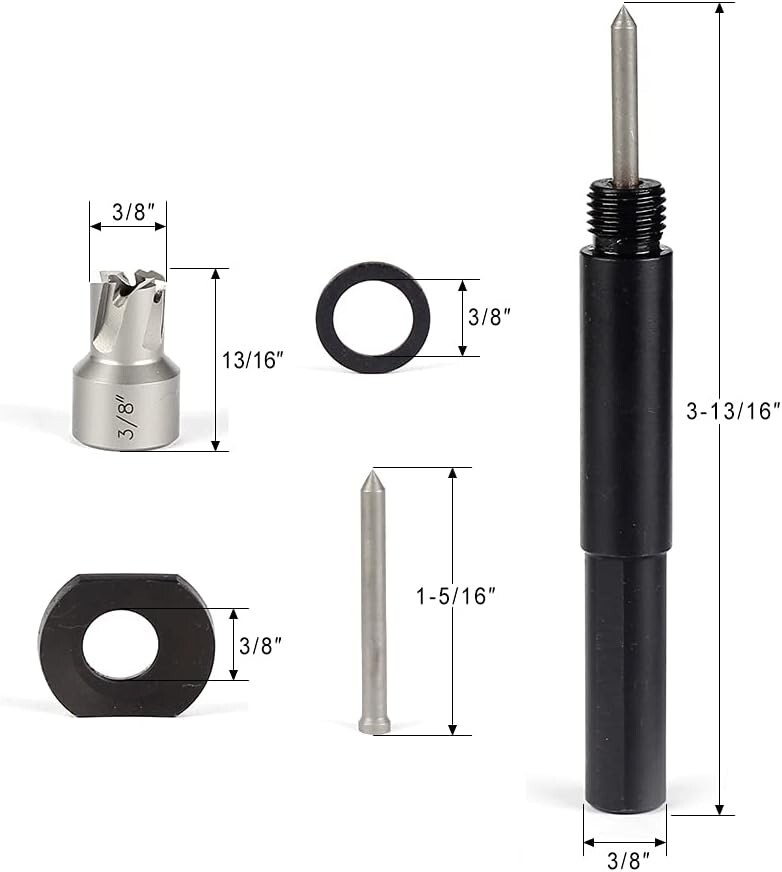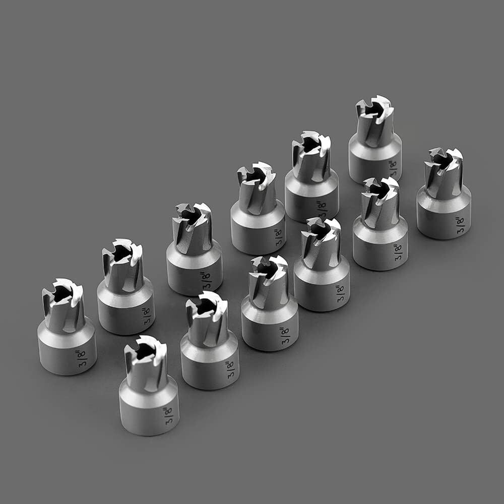 Spot Weld Cutter Set 12-pack 3/8 Inch Cutting Diameter HSS Remover Welding Metal Sheet Hole Drilling Bits for Power Hand Drill Tool INCLUDES 12-pack spot weld cutter 3/8 inch heavy duty cutting blades with 3/8" thread shank for a long-term usage. WIDELY USAGE Suitable for spotwelding on most vehicle auto body panels,and thin stainless steel sheets, iron sheets, aluminum sheets,iron,cast iron,alloy steel,carbon steel or other thin metal sheets. 3/8 INCH Fits for 3/8" handheld drill chucks or larger size and the spring loaded needle helps guide the cutting blades. CONVENIENCE:Easy to handle with and replace,fast and quickly separates spot-welded panels without distortion. HIGH QUALITY MATERIAL Made of high-speed steel material, high hardness and heat resistant. Spot weld cutter 12-pack 3/8 inch cutting blades(annular cutters),suitable for thin stainless steel sheets, iron sheets, aluminum sheets,iron, cast iron, alloy steel, or other thin metal sheets,and fits for 3/8''handheld drill chucks or larger size and the spring loaded needle helps guide the cutting blades.