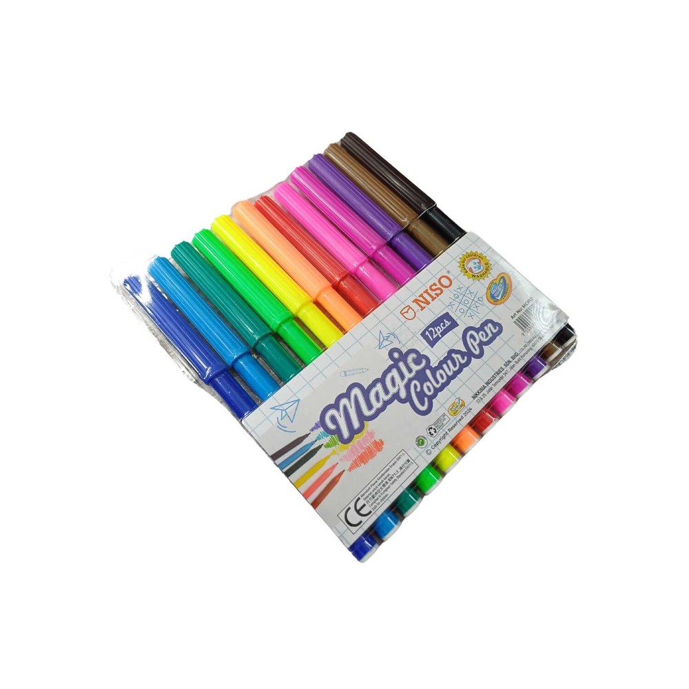Enhance your creativity with the 12-piece Niso Magic Color Pen set. This set includes multi color pens that are safe for children and washable. Perfect for art enthusiasts, this set is ideal for drawing and lettering supplies, and is a great addition to any art supplies collection. The Niso Magic Color Pen set is designed to provide you with a comfortable and seamless writing experience. These pens are perfect for creating beautiful and vibrant colors that will bring your ideas to life. Get your hands on this amazing set today and unleash your creativity!