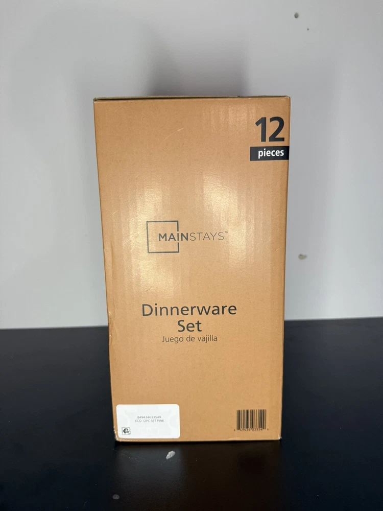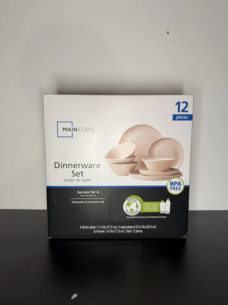 This 12-piece dinnerware set from Mainstays is the perfect addition to any kitchen. The set includes four place settings with salad plates, bowls, and dinner plates, all in a lovely pink color. The solid pattern and round shape make for a modern and stylish look, while the plastic material ensures durability and easy cleaning. Ideal for housewarming occasions or as a thoughtful gift for someone special, this bowl and plate set is a must-have for anyone who loves to entertain. The set is sealed and brand new, ready to be used for any occasion. Bring a touch of elegance to your dining table with this beautiful and practical dinnerware set. CONDITION- AS SEEN IN PHOTOS