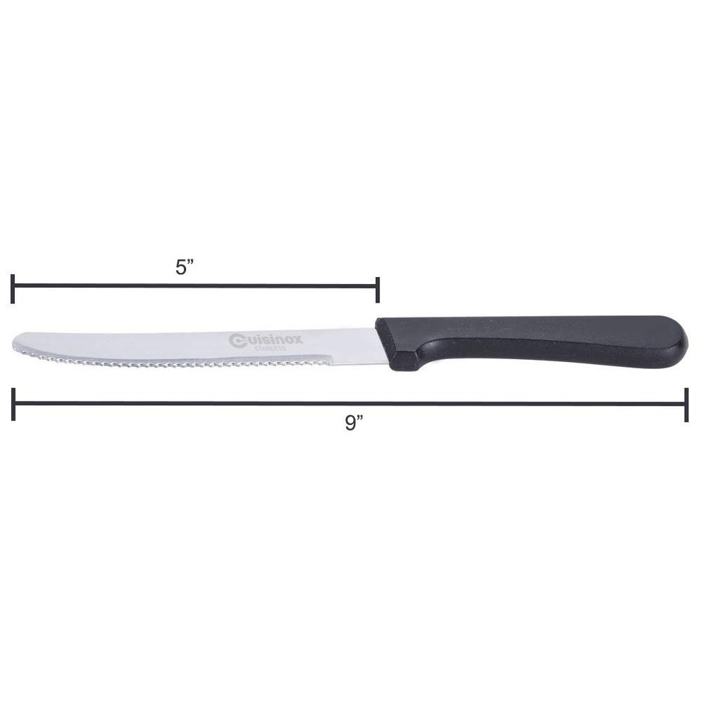 This set of 12 serrated steak knives is a must for every house. This knife is the very often seen in many restaurants and steak houses. This set of stainless steel serrated steak knives has a polypropylene handle. 12-piece set of stainless steel steak knives 8.6" Black handle Steak Knives have stainless steel, serrated blades Serrated steak knives have rounded tips This set of 12 Knives is a popular choice for restaurants and steak houses, but also the perfect set to keep at home Dishwasher safe