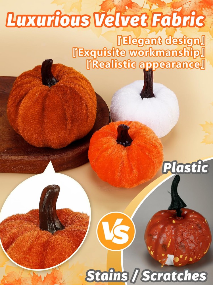 Do you want to make your house better decorated for autumn? Do you want to prepare a unique fall dinner for your friends and family? Do you want to spend a more memorable Thanksgiving Day? Try these elegant assorted fabric pumpkins! Product Specifications Shape: Artificial pumpkins Material: Velvet and foam Color: Orange, yellow, white, brown Dimensions: 2.7in x 2in, and 2.2in x 1.4in Package: 12 fabric pumpkins Product Feathers High-Quality Materials Pumpkins symbolize harvest and abundance, and the velvet material enhances their luxurious appearance compared to plastic alternatives. Perfect for Festivals and Fall These pumpkins are perfect for fall, Halloween and Thanksgiving, providing a farmhouse festive touch as you prepare your home for the celebrations. Symbol of Abundance Bring the spirit of autumn into your home with these delightful velvet pumpkins, and enjoy a season filled with warmth, color, and charm! Vibrant Fall Colors: This set includes 12 velvet artificial pumpkins in 4 autumn-inspired colors: orange, yellow, white, brown. These pumpkin colors symbolize autumn and complement the red and yellow hues of autumn leaves, capturing the season's sight and atmosphere. Exquisite Designs: Crafted from foam and wrapped in luxurious velvet fabric, these assorted fabric pumpkins offer a rich, sophisticated texture. The realistic design, complete with a natural-looking stem, adds an elegant touch to your fall decor, making them a standout piece for any setting. Ideal Autumn Decorations: Perfect for autumnal home decor, these charming velvet pumpkins enhance any space. Use them to decorate dining tables, fireplace, wide-mouthed vases, wooden bowls, decorative tiered trays, bringing a cozy, festive feel to your home. The Right Size: You will receive four small pumpkins, each 2.7 inches in diameter and 2 inches tall, and eight smaller pumpkins, each 2.2 inches in diameter and 1.4 inches tall. Different sizes of pumpkins will create a more layered autumn decoration effect. Easy to Clean: These farmhouse pumpkins decorations are easy to maintain. They resist stains and can be effortlessly wiped clean or washed to keep them looking pristine. Enjoy a fall filled with warmth, color, and charm with these delightful velvet pumpkins!