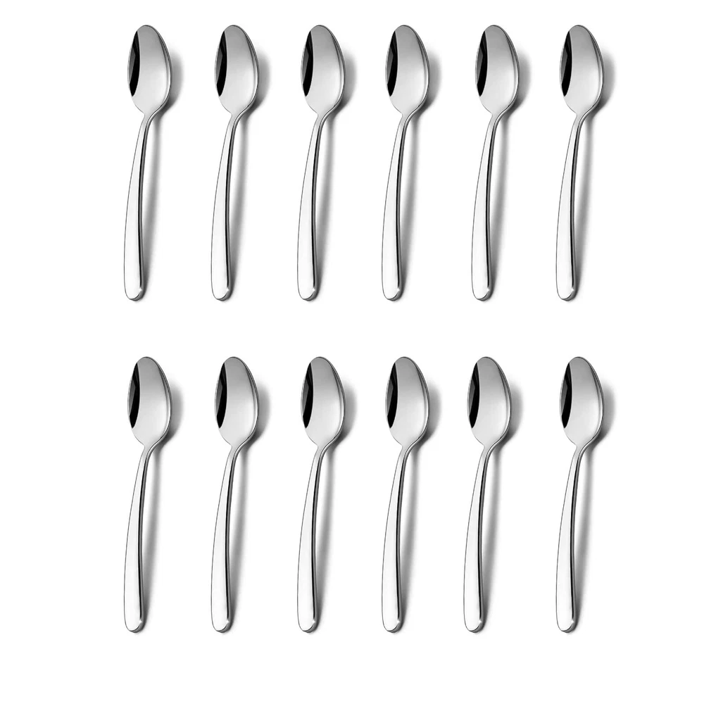 12-Piece Teaspoons Made of high-grade 18/0 stainless steel without harmful substances and certainly healthy for your daily use. Simple and elegant design can well match your kitchen style and dinnerware. PACKAGE CONTENTS : 6.7 inches teaspoon x 12 To keep them with you for a long time, we have prepared some tips: Please use a neutral detergent to wash them. Please make sure they are dry before storage and store them in a dry place. 【12 PIECES】 This spoon set includes 12 small spoons, The spoon size is 6.7 inches, Proper size for ice cream, cake dessert and coffee 【HEALTHY MATERIAL】 Made of the best quality 18/0 stainless steel with no harmful substances, Nickel free, Healthy and rust-proof for daily use, Easy to care for and dishwasher safe 【HEAVY DUTY】1.5 to 2 times the thickness of ordinary teaspoon, Solid construction and durable, Never bend in daily use, Smooth edges with curved-shape design provide you with excellent grip 【MODERN AND ELEGANT】Highly mirror polished without rough burr, Nice shine and bring a high-grade and modern metallic texture, The curved design of the handle makes it more elegant 【EASY CLEAN】High quality steel material makes it more durable, Easy to clean and dishwasher safe, Everyday use but never needs polishing