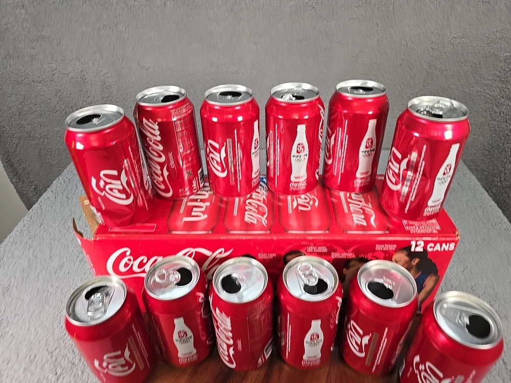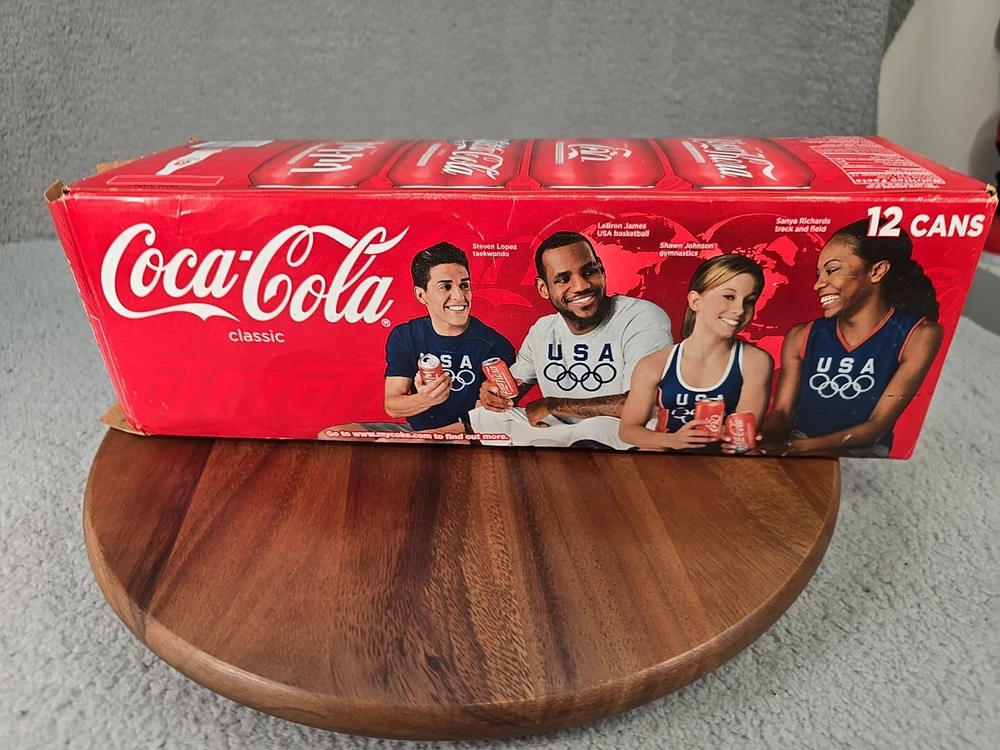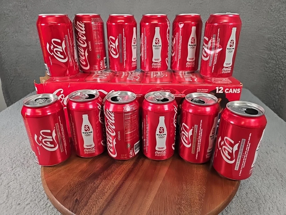 This product is a 12-Pack Carton of Coca-Cola 2008 Beijing, China Olympics Empty Cans featuring LeBron James. The cans are original, multi-color, themed around soda, and were manufactured in the United States. It is a collectible advertising item related to the Coca-Cola brand. Some cans are dented please see photos