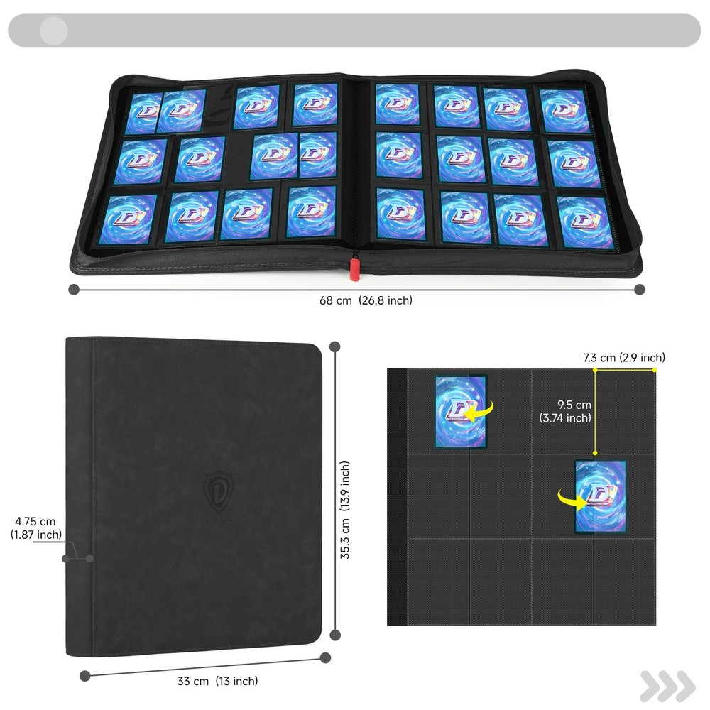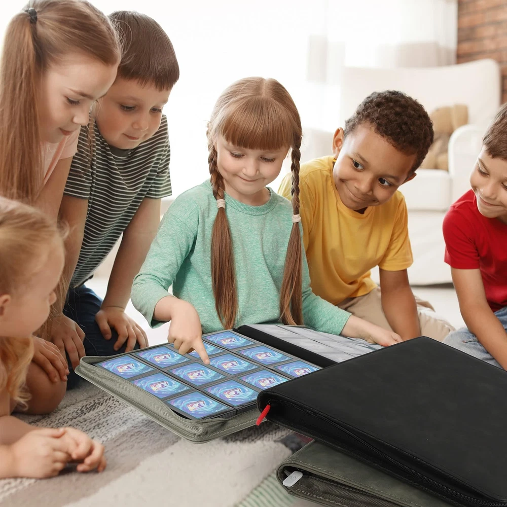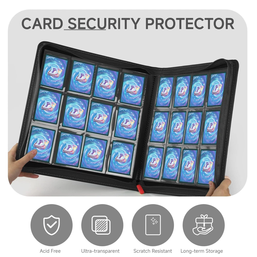 Trading Card Binder Large Storage Capacity: Our card binder holds up to 720 trading cards with 12 pockets per page,both sides can hold cards,totalling 30 pages.Large storage capacity to meet your card collection needs ,keep all your cards organised. Thoughtful Details: Different coloured card binders are matched with different coloured zips to meet your personalised needs.Side card pocket to prevent card spillage.Thickened shell design,give your collectible cards stronger protection. Superior Protection: The shell of the card binder is made of high quality PU leather,waterproof and durable,which can better protect your cards,and the surface is easy to clean.The zip design of the card binder better prevents the cards from falling out. Compatible for Different Cards: The sleeve size of the trading card binder is suitable for a wide range of cards,such as Football Cards,Hockey Cards,Baseball cards,MTG Card Game,Yu-Gi-Oh Card Game,Fuji mini Polaroid photos,Business Cards,Credit Cards,Coupons,Mini Photos,etc.Meeting your needs to collect different cards. Unique Gift: Our card binders come in a variety of different colours,you can choose as many as you like.You can give card holder to card collectors,boys and girls who like cards,suitable for Christmas,birthdays,Thanksgiving and so on,it must be a very special gift!