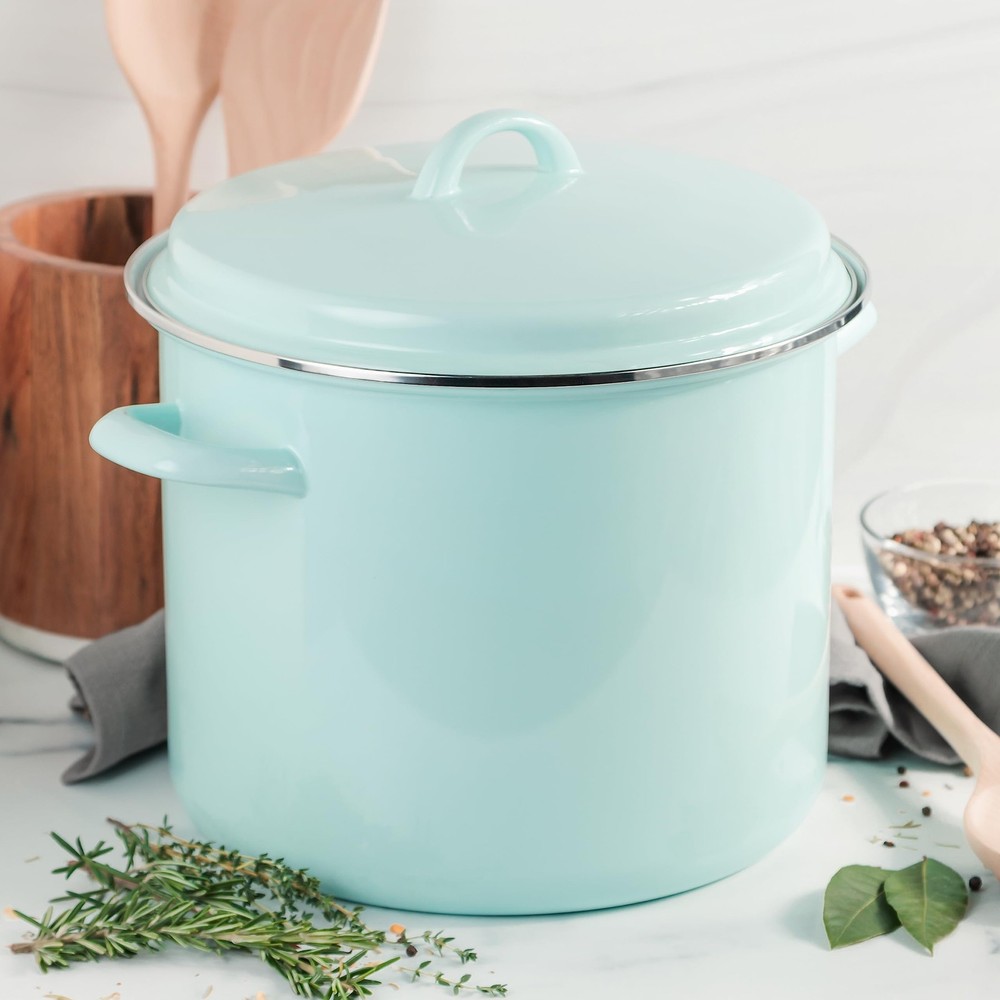 HEAVY-DUTY CONSTRUCTION: This stockpot marries the strength of carbon steel with a durable porcelain enamel finish, ensuring it lasts for generations. Stainless steel rims on both pot and lid prevent edge wear. QUICK AND EVEN HEATING: The carbon steel base ensures your meals cook evenly with exceptional heat distribution and retention, making every dish a delight. CULINARY VERSATILITY: Works on all cooktops, including induction, and is oven-safe up to 500°F, giving you endless culinary possibilities. MADE WITHOUT PFAS: Enjoy peace of mind with our porcelain coating, made without PFAS chemicals, promoting a healthier cooking experience. KITCHEN TO TABLE: The beautiful enamel exterior isn't just for show; it's perfect for bringing your culinary creations straight from the oven to your dining table. Plus, the stain-resistant porcelain makes cleanup quick and easy.