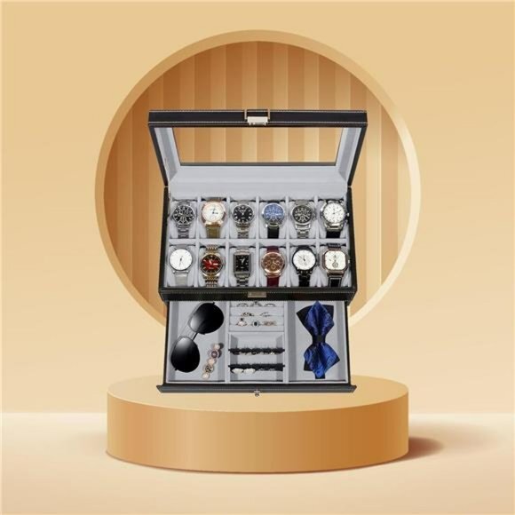 NEW! - Watch Box, 12 Slot Watch Case for Men with Real Glass Lid - DOUBLE LAYER WATCH BOX: In the top layer of the jewelry case, there are 12 watch slots with removable velvet pillows. And in the bottom layer, there are adequate suitable area for your cufflinks, necklaces, bracelets, earring, brooches, sun glasses and any other jewelry and belongings. - Made of quality black faux leather and soft velvet, and Real glass lid that keeps your watches from dust, offers you an open view of the displayed watches. - Gift for him boyfriend husband fathers day gift wedding bridal gift prom gift valentines day gift for men THANK YOU!