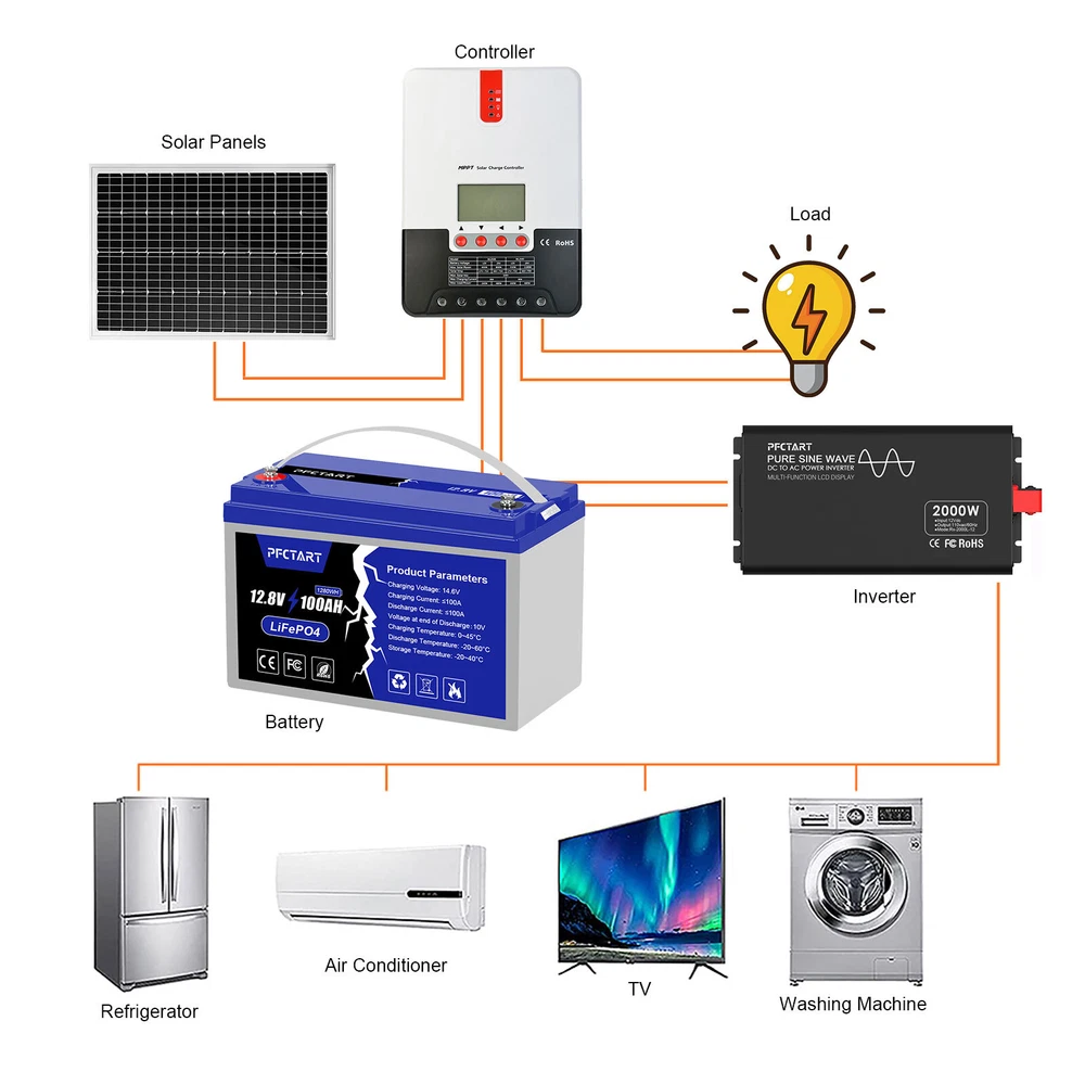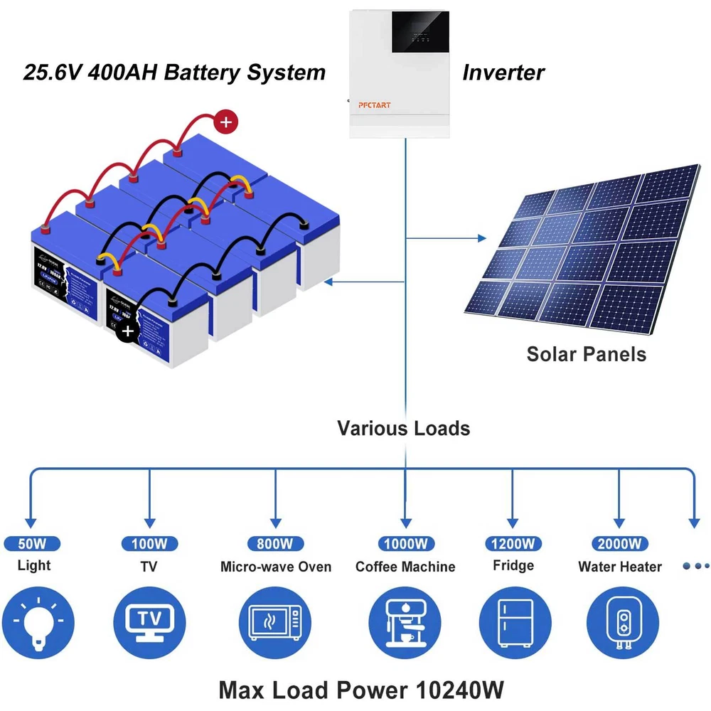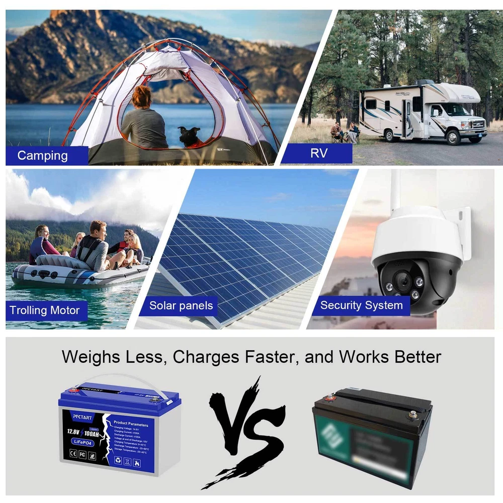 Features 【Automotive Grade Lithium Battery】 PFCTART lithium iron batteries have exceptional quality since they are manufactured by Automotive Grade LiFePO4 Cells with higher energy density, more stable performance & greater power. Highest-level safety based on UL Testing Certificate for the cell inside the battery.This makes li-iron batteries perfect for solar home, RV, campers,motor homes, off-grid applications. 【10 Years lifetime】PFCTART LiFePO4 battery provides 4500+ cycles, which is more than 10 times to Lead Acid with 300~600 cycles. PFCTART LiFePO4 battery has a 10-year service life, three times longer than the Lead Acid’s 3-year lifetime. 【95%* Efficiency】 PFCTART LiFePO4 battery’s flat discharge curve holds above 12.8V for up to 95%,of its capacity usage, providing astronomical boosts in run-time compared to only 50% in Lead Acid. This product is your best choice for outdoor camping power and indoor easy installation. 【1/3* Lightweight】 PFCTART LiFePO4 Battery weighs only 25.57 lbs for one module, only 1/3* the weight of lead acid batteries, which makes it an easy choice for RVs, Marine and Off-Grid Applications when mounting or mobility is in the consideration. 【100% Protection】 PFCTART LiFePO4 battery has built-in BMS (Battery Management System) to protect it from overcharge, over-discharge, over-current, and short circuit with excellent self-discharge rate. Built-in high-temp cut off prevents charging over 167 °F (75 °C). Without memory effect, no matter what state the battery is, it can be used as soon as it is charged. PFCTART LiFePO4 battery is IP65 level waterproof, which set you free from worrying to install indoors or outdoors. Specifications Battery type: LIFEPO4 MODEL: 100Ah 12.8V(4S1P) Rated capacity: 100Ah(1280WH) Normal voltage: 12.8V Discharge termination voltage: 10.0V Charging voltage: 14.6V Internal resistance: ≤180mΩ Single cell: IFR 3.2V 100Ah Standard charging. Continuous current: 0.2C5A Continuous voltage: 14.6V Cut-off current: 0.01 C Standard discharge: Constant current 0.2C5A end voltage 10.0V Max. charging continuous current: 100A Maximum discharge continuous current: 100A Operating temperature range. Charge: 0~45℃ Discharge: -20~70℃ Product size: 329*171*235mm Weight : 11.6kg(25.57lbs) BMS protection Cell overcharge detection voltage:3.90V±50mV Cell overcharge recovery voltage:3.80V±100mV Cell over-discharge detection voltage:2.00V±100mV Cell over-discharge recovery voltage:2.30V±100mV Rated operational charge current:100A Over current detection:150±30A PCM impedance:≤50mΩ Note The BMS it supports up to 51.2V series or 16 parallel installations of the same voltage and same capacity (4S4P), please fully charge the batteries before series/parallel installation to ensure that each battery is at the same voltage and same capacity.