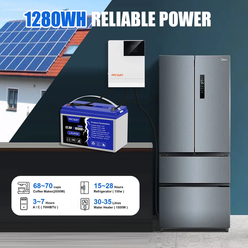Features: BORN FOR RV LIFE An Affordable 12V 100Ah Deep Cycle LiFePO4 Battery.Your optimal & adequate LiFePO4 Battery for Camper Van, Travel Trailer, Caravan, Hauler, Motor Home, etc. 1/2 LIGHT WEIGHT IN 14.2KG Easily Pick up and go! Weighs 11.6kg, 1/2 lighter than 12V 100Ah lead-acid battery in 25kg.Effortlessly Install the 12V 100Ah LiFePO4 battery in your RVs, no any burden to you and your RVs. 1280Wh ENERGY STORAGE Provides100% 1.28kWh energy, a 2X increase in power output efficiency over lead-acid batteries (approx. 50% usable capacity in a 12V100Ah AGM SLA Lead-acid battery at 1C discharging rate).Timeusb LiFePO4 battery delivers the ideal result on stronger energy storage that users of RVs expected. 100% SAFE WITH SUPERIOR BMS 100A Battery Management System (BMS), protects the battery from safety hazards by providing five types of protection: overcharging, overdischarging, overcurrent, short circuit, and high-temperature environment above 60°C/140°F. It’s a 100% green energy that is free of heavy metals and rare metals, non-toxic, and non-polluting. EFFICIENT DELIEVERY & 24Hrs SERVICE PFCTART provides customers with a responsive and professional customer service team that provides targeted battery solutions within 24 hours of question receipt.Given Timeusbahighly effective after-sales and delivery team, our customers in the United States can receive PFCTART products within 2-7 working days. ATTENTION It is an energy storage battery rather than a start-up battery, and it CAN NOT be used for any kind of golf carts, trolling motor or starting. Package Included : 1 * 12V 100Ah LiFePO4 Battery Pack Please be noted : battery charger is not included. Specifications: Battery type: LIFEPO4 MODEL: 100Ah 12.8V(4S1P) Rated capacity: 100Ah(1280WH) Normal voltage: 12.8V Discharge termination voltage: 10.0V Charging voltage: 14.6V Internal resistance: ≤180mΩ Single cell: IFR 3.2V 100Ah Standard charging. Continuous current: 0.2C5A Continuous voltage: 14.6V Cut-off current: 0.01 C Standard discharge: Constant current 0.2C5A end voltage 10.0V Max. charging continuous current: 100A Maximum discharge continuous current: 100A Operating temperature range. Charge: 0~45℃ Discharge: -20~70℃ Product size: 329*171*235mm Weight : 11.6kg BMS protection: Cell overcharge detection voltage:3.90V±50mV Cell overcharge recovery voltage:3.80V±100mV Cell over-discharge detection voltage:2.00V±100mV Cell over-discharge recovery voltage:2.30V±100mV Rated operational charge current:100A Over current detection:150±30A PCM impedance:≤50mΩ Please note : BMS it supports a maximum of 48V series or 4 batteries of the same voltage and the same capacity in parallel installation, please fully charge the batteries before series/parallel installation to ensure that each battery is at the same voltage and the same capacity.