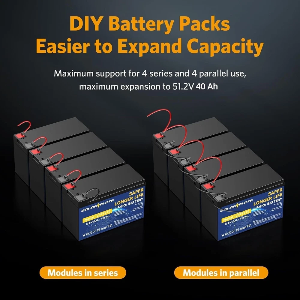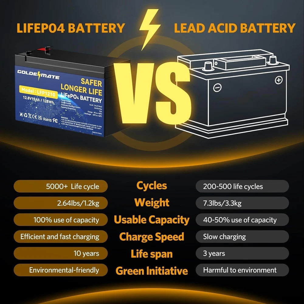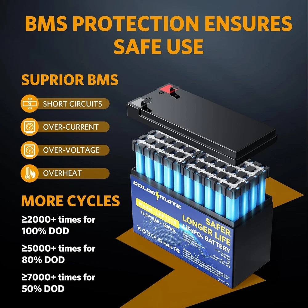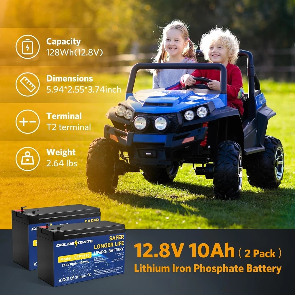 12V 10Ah LiFePO4 Lithium Deep Cycle Battery2-Pack, 5000+ Cycles Lithium Iron Phosphate Rechargeable Battery for Solar, Lighting, Power Wheels, Fish Finder, Scooters, Lightweight High-Capacity 12V 10Ah - The 12V 10Ah LiFePO4 Battery offers a reliable nominal voltage and 10Ah capacity, perfect for high-demand applications like solar-powered lights, electric tools, and fishing equipment. Get the performance you need, when you need it. Long-Life Cycle - Boasting a remarkable 5000+ cycle lifespan, this 12 volt LiFePO4 battery outperforms traditional lead-acid batteries. Ideal for solar lighting industries and portable electronics, your investment today will pay off with s of dependable use. Lightweight & Compact - With dimensions of approximately " x " x " and a net weight of about lbs., the power wheels battery is portable and easy to fit into a range of devices. Perfect for mobile lighting solutions, electric toys, and handheld vacuums. Low Self-Discharge - Enjoy peace of mind with an ultra-low self-discharge rate, allowing your devices to maintain their power for extended periods. This feature makes the 12v 10ah battery an excellent choice for emergency LED lights, Bluetooth speakers, and other critical applications. Safe & Reliable - Engineered with safety in mind, LiFePO4 technology presents fewer risks compared to traditional lithium-ion batteries. It's an optimal choice for power-demanding activities like electric spray applicators and high-power LED flashlights.