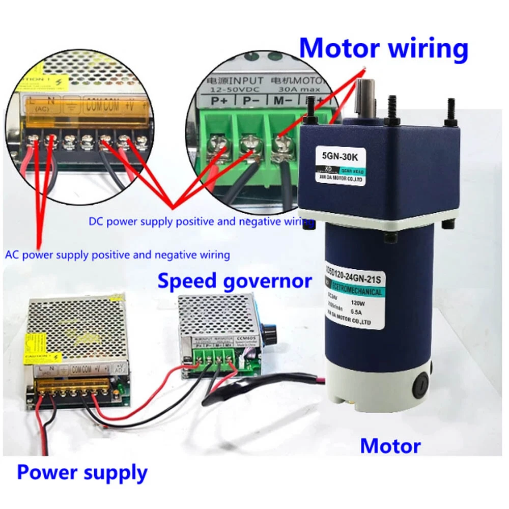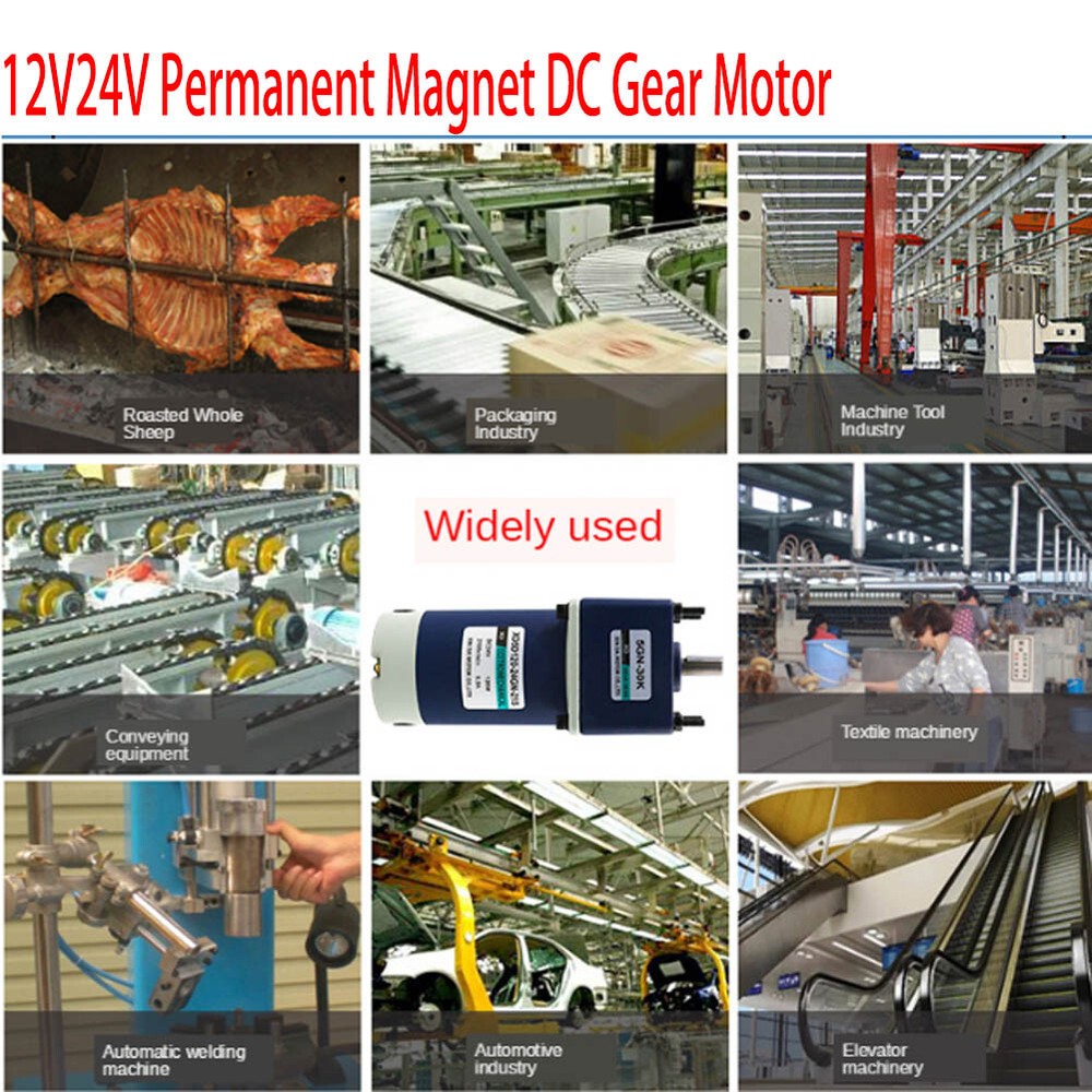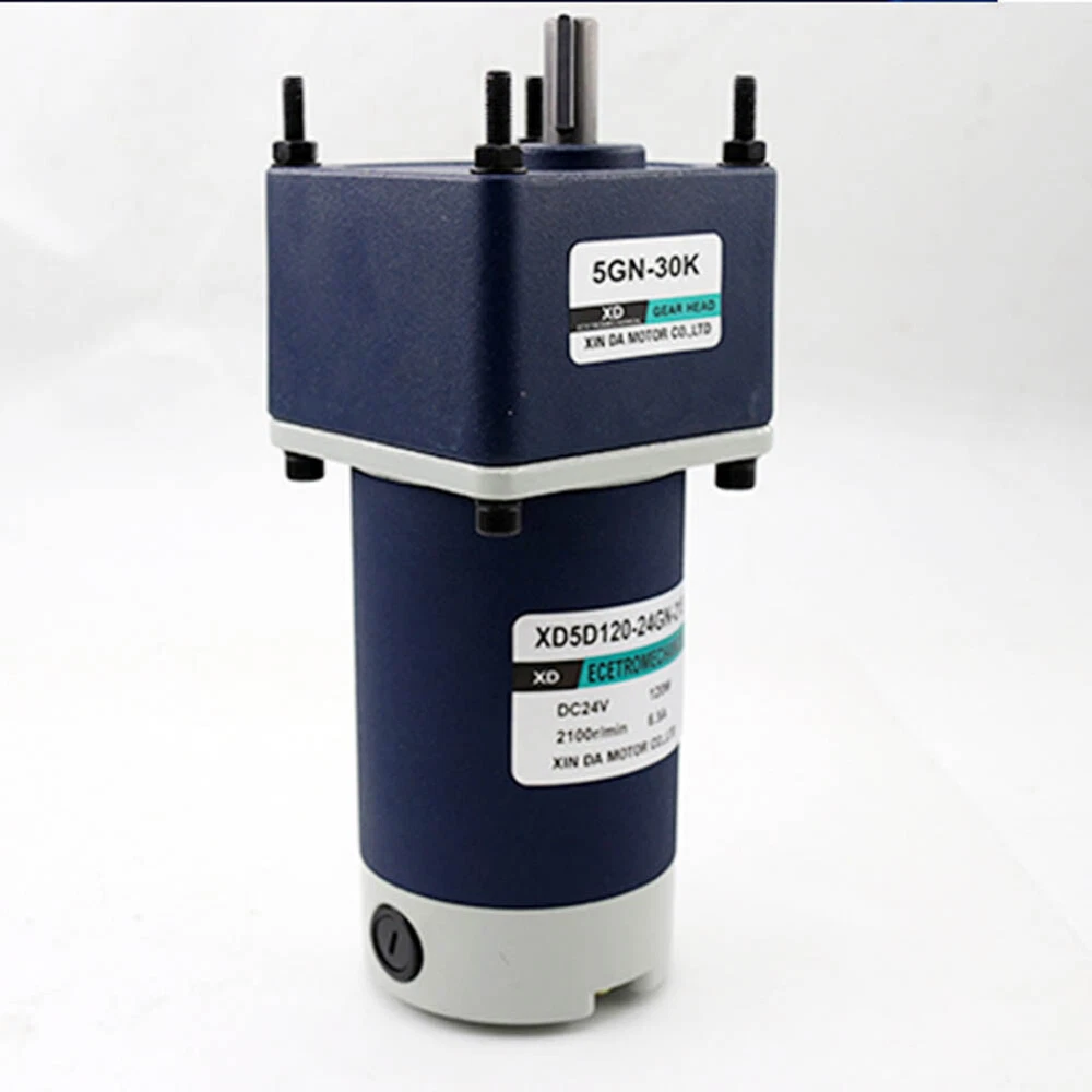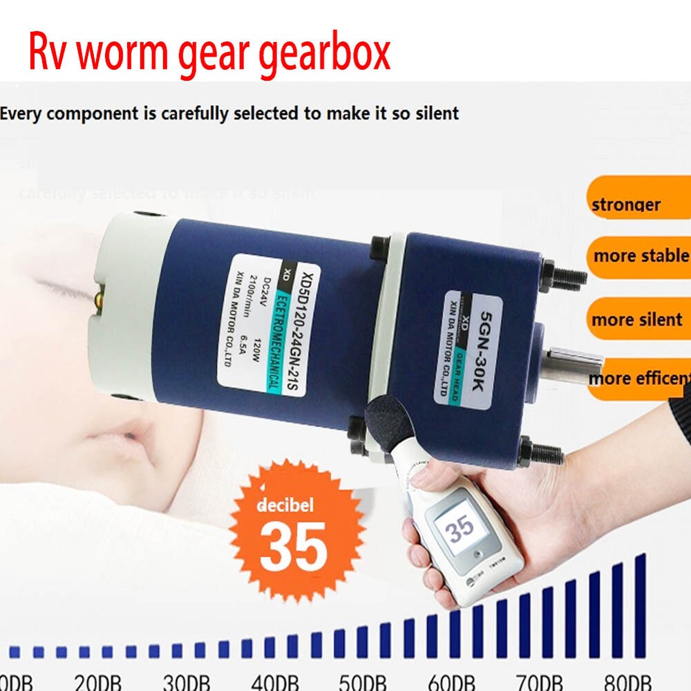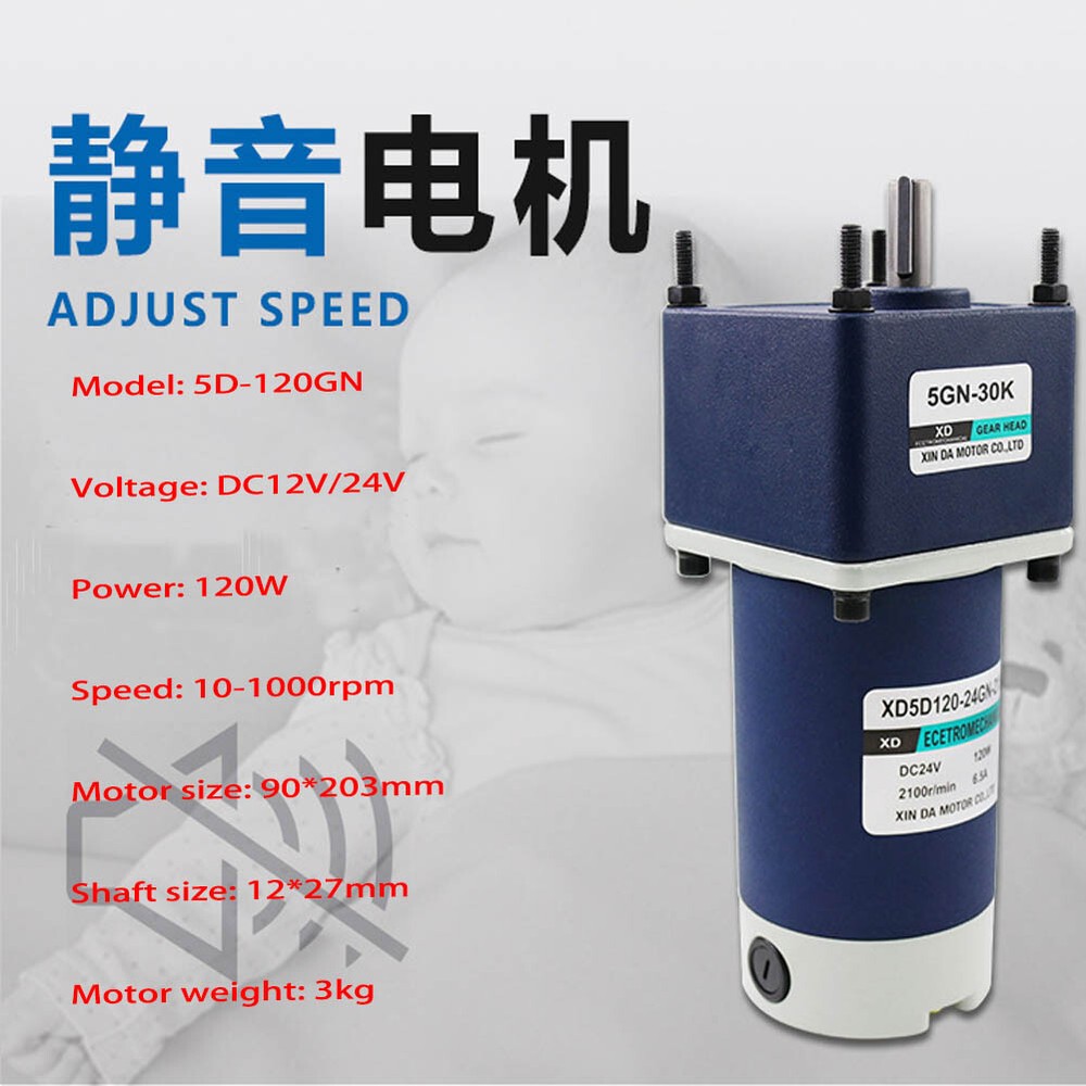 Description: Model: 5D-120GN Voltage: DC12V/24V Power: 120W Speed: 10-1000rpm Motor size: 90*203mm Shaft size: 12*27mm Motor weight: 3kg Feature: 1. Forward / reverse 2. Speed adjustable 3. Big torque 4. All-metal gear Included: 1 x RV Worm Gear Gearbox