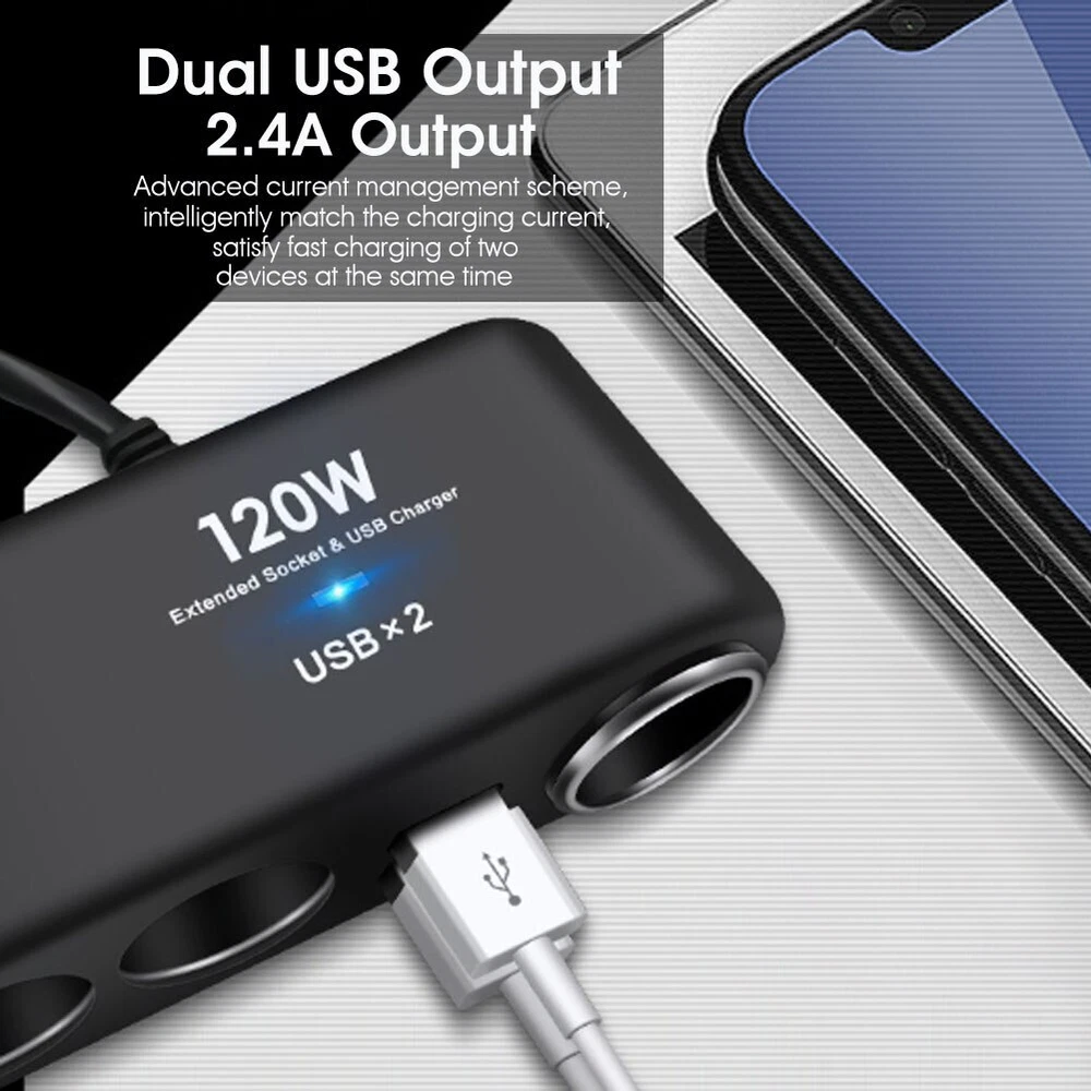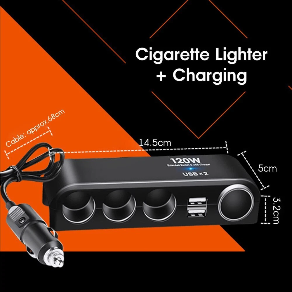 Feature: ● 100% Brand New and High Quality ● Runs Multiple Accessories At The Same Time, Very Convenient, Easy to Use & Fashionable Design ● Universally Fits for Most DC12-24V Vehicles, Cars, SUVs, Motorcycles, Boats, Marine, etc. ● Multi-functional Product, Perfect for Travel ● Equipped with Cigarette Lighter Plug, Real Extension Lighter Kit ● A Fuse is Included with the Product ● DC12V/24V Using Only Specifications: ● Indicator Colour: Blue ● Material: ABS+PC ● 4 Cigarette Lighter Output: DC12V/24V ● Total Output Power: 120W ● USB Port: 2 ● USB Output: DC 5V / 1.2 ● Working Temperature : About.-10℃~ +65℃ ● Cable Length: Approx.68cm Compatible With: ● USB Charged Mobile Phones or Other Electronic Products Package Included: ● 1 x 4 Ports Dual USB Car Cigarette Note: 1.The real color of the item may be slightly different from the pictures shown on website caused by many factors such as brightness of your monitor and light brightness. 2.Please allow slight manual measurement deviation for the data.