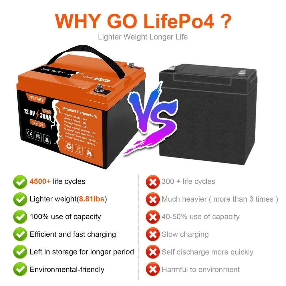 12V 100Ah Deep Cycle Litime LiFePO4 Lithium Battery for RV Solar Off-grid Motor 249.99 USD Free shipping 100AH 12.8V Deep Cycle Lithium Battery LiFePO4 for Boat Home Campers Off-Grid 285.79 USD Free shipping PFCTART 1280Wh 12V 100Ah LiFePO4 Battery Built-in BMS Rechargeable For Home RV 285.99 USD Free shipping 30Ah LiFePO4 Lithium Battery 4500+ Deep Cycles for Golf cart RV Boat Solar Panel 223.99 USD Free shipping 12V Lithium Battery 100Ah LiFePO4 Deep Cycle for Solar RV Marine Home Off-grid 285.99 USD Free shipping 1280Wh 12.8V 100Ah LiFePO4 Lithium Battery Built-in BMS For RV Off-Grid Solar 269.99 USD Free shipping 12V 100AH LiFePO4 Lithium Battery Rechargeable BMS for RV Solar Trolling Motor 285.98 USD Free shipping 200Ah 12.8V Deep Cycle LiFePO4 Lithium Battery BMS for RV Home Marine Garden US 519.99 USD Free shipping 12.8V 50Ah LiFePO4 Deep Cycle Lithium Battery 640Wh for RV Solar System Marine 179.79 USD Free shipping 12V Lifepo4 Cell 100Ah LiFePO4 Lithium Deep Cycle Battery for RV Solar System US 309.29 USD Free shipping NEW 12V 150Ah LiFePO4 Deep Cycle Lithium Rechargeable Battery RV Solar System 359.99 USD Free shipping 200Ah LiFePO4 Cell Lithium Battery 12V Rechargeable w/BMS For RV Homer Boat NEW 519.99 USD Free shipping NEW-00021 12V 30Ah Deep Cycle LiFePO4 Lithium Battery 30A BMS for Golf Car Trolling Motor PRODUCT DESCRIPTION Features 【Automotive Grade Lithium Battery】 PFCTART lithium iron batteries have exceptional quality since they are manufactured by Automotive Grade LiFePO4 Cells with higher energy density, more stable performance & greater power. Highest-level safety based on UL Testing Certificate for the cell inside the battery.This makes li-iron batteries perfect for solar home, RV, campers,motor homes, off-grid applications. 【10 Years lifetime】PFCTART LiFePO4 battery provides 4500+ cycles, which is more than 10 times to Lead Acid with 300~600 cycles. PFCTART LiFePO4 battery has a 10-year service life, three times longer than the Lead Acid’s 3-year lifetime. 【95%* Efficiency】 PFCTART LiFePO4 battery’s flat discharge curve holds above 12.8V for up to 95%,of its capacity usage, providing astronomical boosts in run-time compared to only 50% in Lead Acid. This product is your best choice for outdoor camping power and indoor easy installation. 【1/3* Lightweight】 PFCTART LiFePO4 Battery weighs only 8.81 lbs for one module, only 1/3* the weight of lead acid batteries, which makes it an easy choice for RVs, Marine and Off-Grid Applications when mounting or mobility is in the consideration. 【100% Protection】 PFCTART LiFePO4 battery has built-in BMS (Battery Management System) to protect it from overcharge, over-discharge, over-current, and short circuit with excellent self-discharge rate. Built-in high-temp cut off prevents charging over 167 °F (75 °C). Without memory effect, no matter what state the battery is, it can be used as soon as it is charged. PFCTART LiFePO4 battery is IP65 level waterproof, which set you free from worrying to install indoors or outdoors. Specifications Battery type: LIFEPO4 MODEL: 30Ah 12.8V(4S5P) Rated capacity: 30Ah(384WH) Normal voltage: 12.8V Discharge termination voltage: 10.0V Charging voltage: 14.6V Internal resistance: ≤180mΩ Single cell: IFR 32700 3.2V 6000mAh Standard charging. Continuous current: 0.2C5A Continuous voltage: 14.6V Cut-off current: 0.01 C Standard discharge: Constant current 0.2C5A end voltage 10.0V Max. charging continuous current: 30A Maximum discharge continuous current: 30A Operating temperature range. Charge: 0~45℃ Discharge: -20~60℃ Product size: 177*167*125mm Weight : 4kg BMS Protection Cell overcharge detection voltage:3.90V±50mV Cell overcharge recovery voltage:3.80V±100mV Cell over-discharge detection voltage:2.00V±100mV Cell over-discharge recovery voltage:2.50V±100mV Rated operational charge current:30A Over current detection:60±5A PCM impedance:≤50mΩ Note It does not have series/parallel protocol, please do not use it for multiple series or parallel installations. About Us Payment Shipping Returns Contact Us Welcome to our store, your support is the biggest driving force for us to move forward. Our main business is solar street lights, solar controllers, solar panels and so on. The product is directly connected with the factory to ensure product quality. Please rest assured to buy, we will provide you with a perfect shopping experience! We accept payment via Paypal only. Payment must be completed within 10 days. If you have any problems about payment, please contact us via ebay message. We only ship to confirmed Paypal addresses. Please comfirm that your paypal address is in line with your shipping address. Please kindly note that the combined shipping is not provided because the shipping fee is calculated by weight. Also, the each additional item means exactly the the same color and size. It takes about 7-15 working days to US; about 10-30 working days to other countries. Transit time may be a little delayed because of the bad weather and customs inspection. If you do not receive your item within 30 working days since payment finished, please contact us immediately for further assistance. If you have any issue about Item. Please contact us with 7 days since you receive the item and and return to us within 30 days from the delivery date for exchange or refund. If you need return, please contact our customer service representative, let us know the detailed problem and send us some pictures for confirmation. We strive for 100% customer satisfaction! Positive Feedback is very important to us. If you have any questions, please feel free to contact us via "Ask seller a question" . We will reply your email within 24 working hours. About Us Welcome to our store, your support is the biggest driving force for us to move forward. Our main business is solar street lights, solar controllers, solar panels and so on. The product is directly connected with the factory to ensure produ