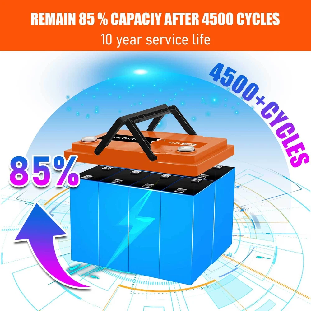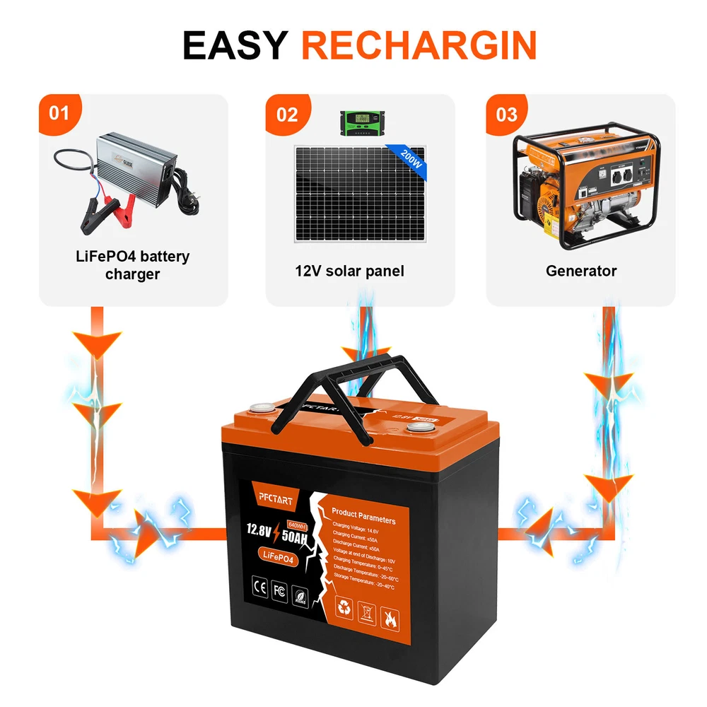 Specifications: Nominal Capacity: 50Ah Usable Capacity: 50Ah Terminal Size: M6 Nominal Voltage: 12.8V Energy: 640Wh Charge Method: CC / CV Charge Voltage: 14.4V±0.2V Current: 10A (0.2C Cycle Life≥4000 times Internal Impedance≤40mΩ Battery Management System (BMS) Board: 50A Max. Continuous Charge / Discharge Current: 50A Max. Discharge Current 5 Seconds: 100A Max. Continuous Load Power: 640W Battery Pack Case: Acrylonitrile Butadiene Styrene (ABS) PlasticProtection Class: IP65 Temperature Range: Charge: 0°C to 50°C / 32°F to 122°F Discharge: -20°C to 60°C / -4°F to 140°F Storage: -10°C to 50°C / 14°F to 122°F Dimension (L/W/H/TH): 198 * 166 * 170 mm / 9.02 x 5.43 x 8.19 inches Weight: Approx. 8.5kg / 18.07 lbs Note: 1.Please read the product manual before using the LiFePo4 Battery 2.Check the specifications (Voltage, capacity, dimension, weight etc) and make sure it would fit and replace your old battery with no problem before purchase 3. Please remove the caps on terminals before using Package Included: 1* 12V 50Ah Lithium Battery 2 Pairs* Terminal Screws 1* Warranty Card 1*Product Manual Please be noted: battery charger is not included.