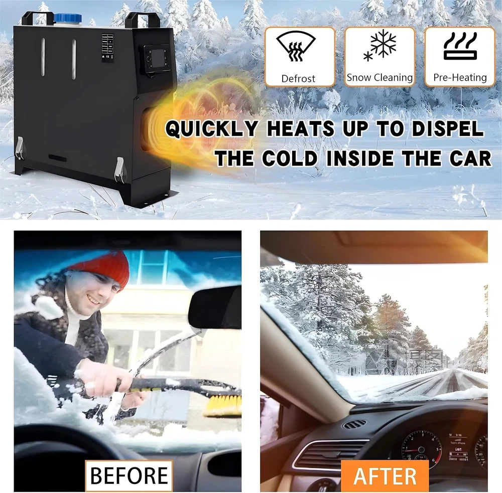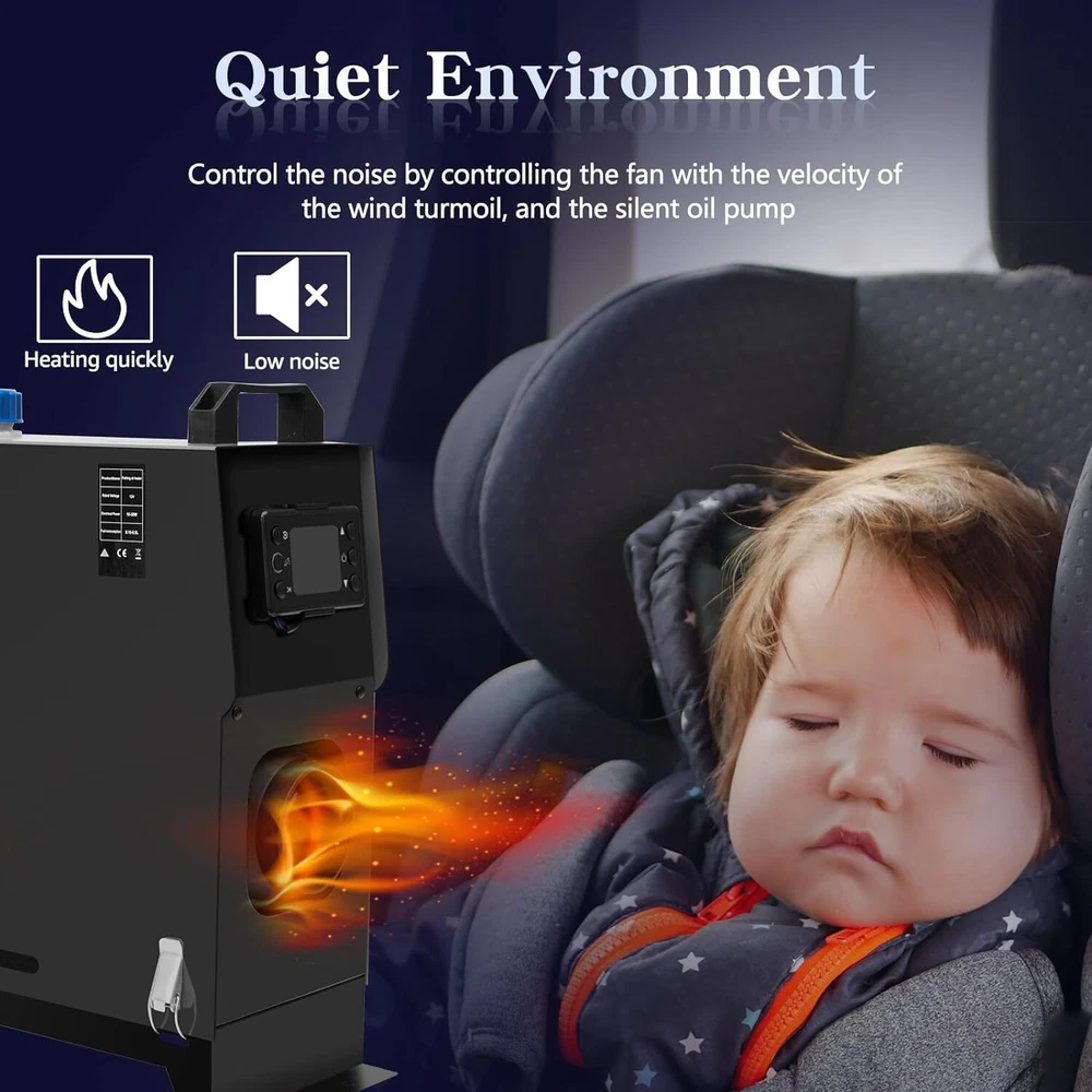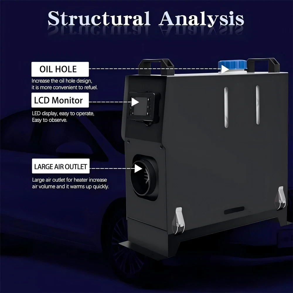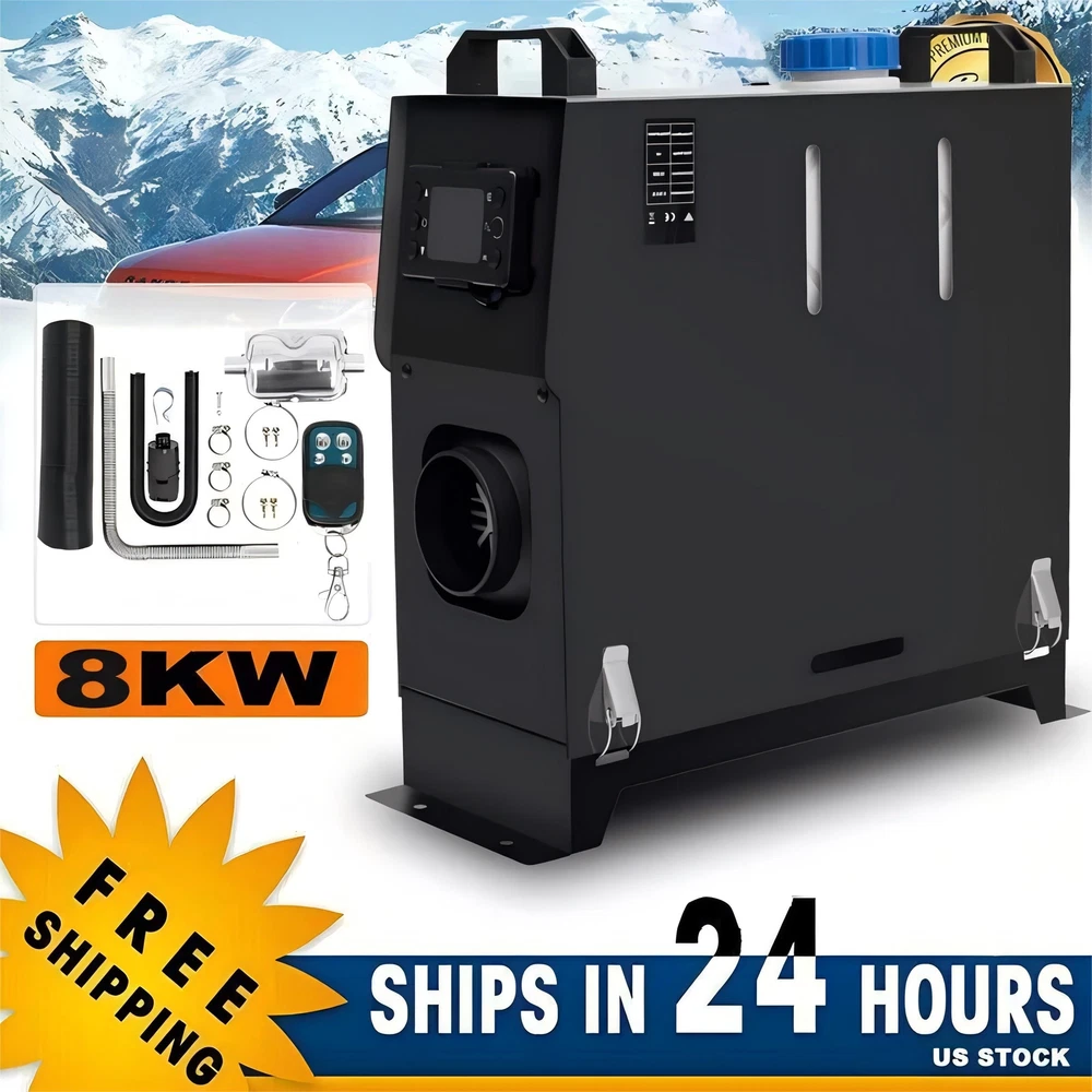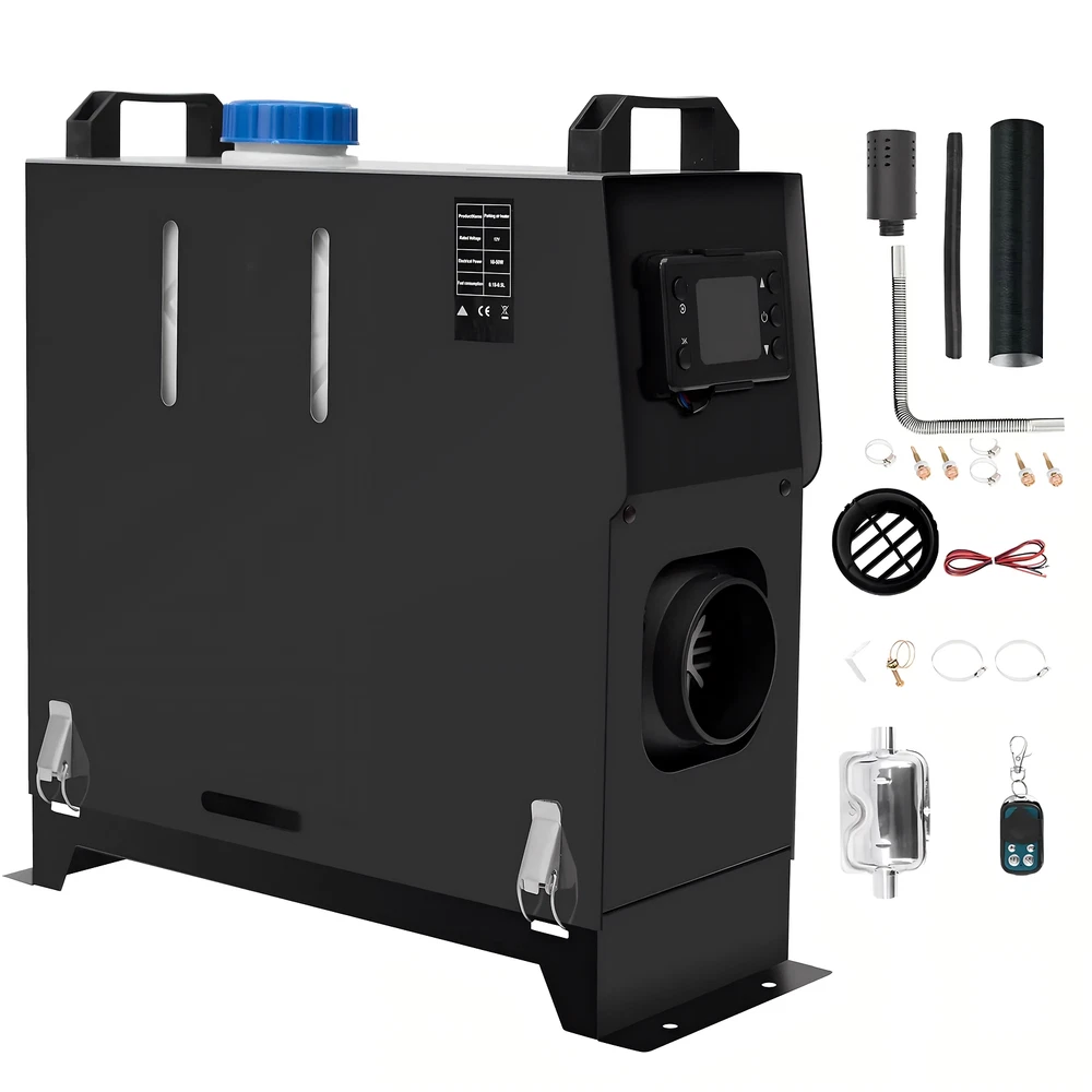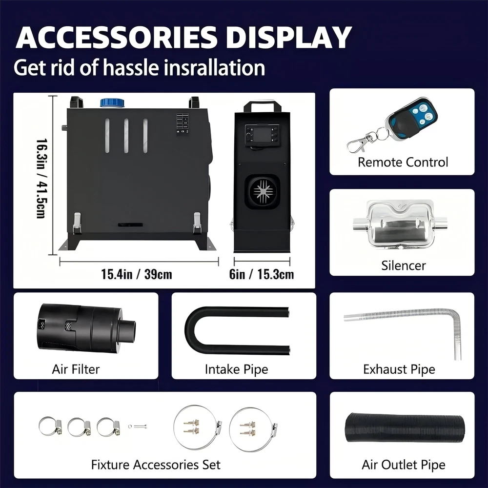 Warm tips The product manual is a generic version, please refer to the page details If there are any problems, please give feedback. Remote control The temperature can be adjusted via the remote control, which means it can be activated before entering the car in the cold morning. Control range within 30 meters Energy-saving fuel pump The fuel pump has high precision and sensitivity, the plunger supplies fuel, and the suction is stronger, ensuring the stability of fuel supply and providing powerful power. The fuel pump must be up and kept tilted between 40 and 90 degrees High altitude Working height up to 3,500 meters above sea level AIR HEATER Specification Heater Power:8KW Rated Voltage:12V Startup Current:15A Rated Current:3A Fuel Gasoline:Diesel only Heating Area:15m² Continuous Heat Supply Hours:48 Specification Power Consumption: 0.036KW/H Remote Control Range: 30m Outlet Dia.: 76mm Inlet Dia.: 26mm Heater Working Temperature: -40℃~+50℃ Oil pump Working Temperature: -40℃~+40℃ Fuel Consumption(L/h): 0.64 Single outlet Large air outlet, uniform turbine wind speed, improved thermal efficiency, large air volume, and sufficient air supply range Complete set of accessories There is a complete installation kit for easy use and installation Low noise The use of blower to control the speed, silent fan, silent oil pump and muffler can effectively reduce noise. Specifications: Material: Metal Color: All Black Size: 15.3×39×41.5cm (6×15.4×16.3") Voltage: 12V Power: 8000W Fuel: Diesel Complete combustion rate: 100% Fuel consumption: 0.1~0.24L Working temperature: -40°C~80°C Feature - All into one unit, saving space and easy to move. - Easy to install, remove and maintain. - Get rid of damage to car causing by the sudden drop of temperature. - Low noise: noise reduction processing with minimal noise. - Easy Installation: the compact design is good for using in a variety of narrow spaces. - Low fuel and power consumption for longer periods of operation. - Smooth, automatic room temperature control with temperature pre-set facility. - With continuous monitoring and diagnostic system. - Fuel supplied from the vehicle's own tank. - Applicable to: various diesel mechanical vehicles such as cars, buses, RVs, trucks, engineering vehicles, etc. Package included: 1 x Parking Heater (Receiver Switch) 1 x Blue Remote Control (Batteries NOT included) 1 x Air Filter 1 x Air Outlet Pipe 1 x Intake Pipe 1 x Exhaust Pipe 1 x Fixture Accessories Set 1 x Silencer Notice: 1. Please allow 1-5mm error due to manual measurement. Please make sure you do not mind before you bid. 2. The colors may have different as the difference display, please understand. Tip: It is normal for the machine to fail to ignite the first time . Please wait patiently. restart the machine after the machine stops , wait for a few minutes and do not press the key. when the oil pump works, it will be accompanied by ignition. if the ignition is successful, hot air will be emitted in 3 minutes.