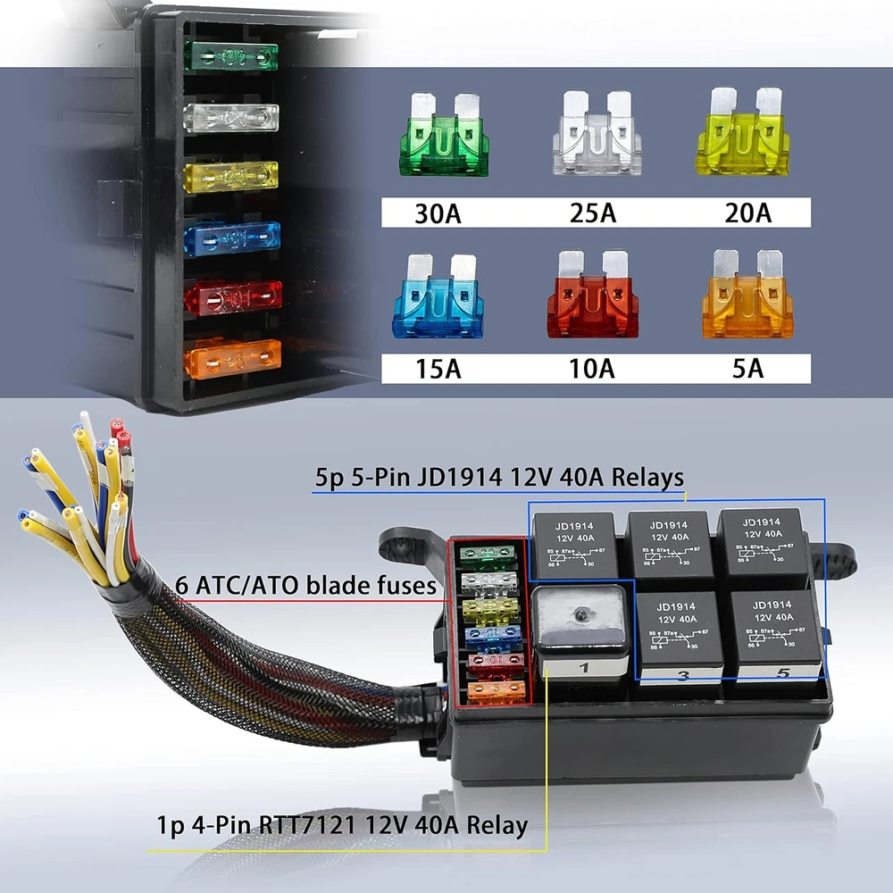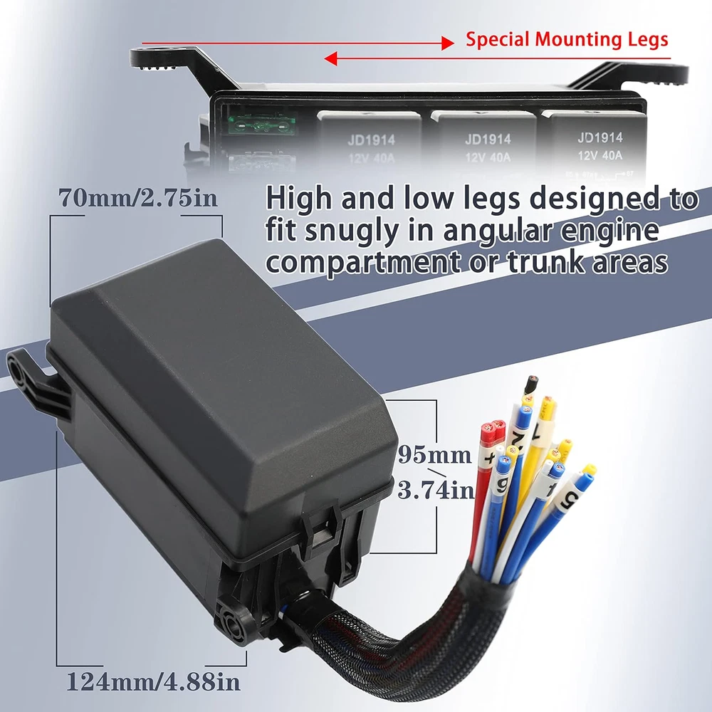 Store New Arrivals Add to Favorite View Feedback Contact 12V Automotive Fuse and Relay Box with Pre-Wires Fuse Relay Block Universal Fuse Description Item model number 1 Current Rating 20 Amps, 25 Amps, 10 Amps, 40 Amps, 15 Amps Mounting Type DIN Rail Mount Product Dimensions 0.39 x 0.39 x 0.39 inches; 1.48 Pounds Country of Origin China Operation Mode Automatic Contact Type Normally Open Product Description The fuse relay block has all the necessary wiring pre-wired, No need to install terminals and wiring harness later, Directly connect to the vehicle and avoid the hassle of wiring. You are not required to layout your electrical requirement or wire up the box. No more wiring nightmare! It is good for some people who didn't have some background knowledge in 12volt or know how to wire relays. It was time consuming to wire. Corresponding Line Numbers Are Marked, Which Is Very Convenient For Your Installation. The Fuse and Relay Box there are two red wires coming from the same common buss bar,both going to the battery, you can also connect only one, depending on how you want to modify it, but connecting two can improve carrying capacity, a wiser choice. NOTE: There are five different colors of wires in this fuse and relay box. Positive input main wire (red): 11awg, Positive output wire (yellow ):13awg, Positive output wire (blue) :13awg, Control wire(white) : 17awg, Negative wire(black) :17awg If You Take The Bottom Of The Panel Off You 'll See How They're Split Up. The fuse and relay box made of high quality flame retardant shell, Dustproof. Overall structure is strong and reliable, with strong anti-tampering performance. Each slot has precise cutout and reserved in an Arc-outlet on the edge. if you didn't know how to do wiring and pinning and receptacles,then it would be a very wise choice to choose this fuse and relay box,all you will need to do is connect to the corresponding spot on the power bar and run you lead to the load. ABOUT US We offer the best prices around on high quality products. Our E-store includes media such as books, movies, music and games while offering electronics, toys, sporting apparel, clothing, tools, general home, garden items and more. SHIPPING We are always working hard to ensure your package arrives as soon as possible. Please understand that some factors like weather, high postal traffic, and the performance of shipping companies are outside of our control. We offer free shipping to the lower 48 states and ship within 2 business days of payment, usually sooner. We do not accept P.O. Boxes. Please provide a physical address. RETURNS We offer a 30-Day Return Policy on items which you are not completely satisfied with. You have the option for a full-refund or an exchange of the item. No returns are available on items shipped outside of the USA. PAYMENT We accept PayPal. CONTACT US This page content is yet to come Please ad us to your favorite seller and visit again later Thank You CUSTOMER SATISFACTION We try our very best to make sure every customer is completely satisfied. If there's a problem, message us! We're happy to help.